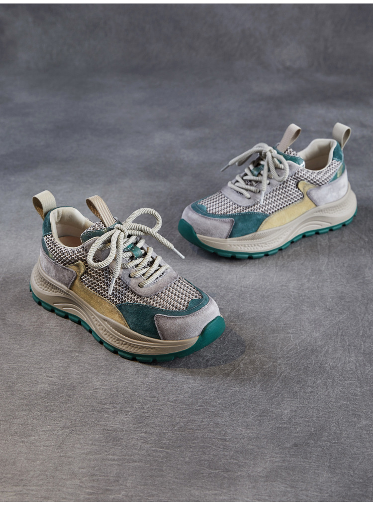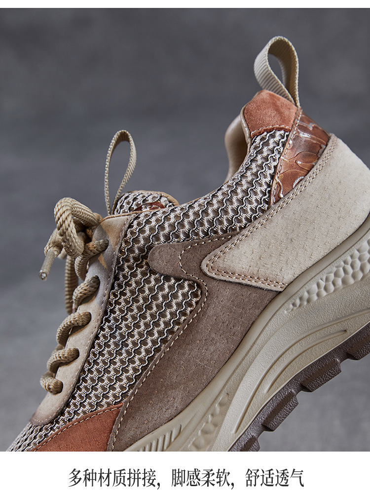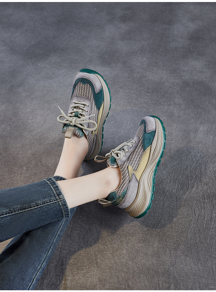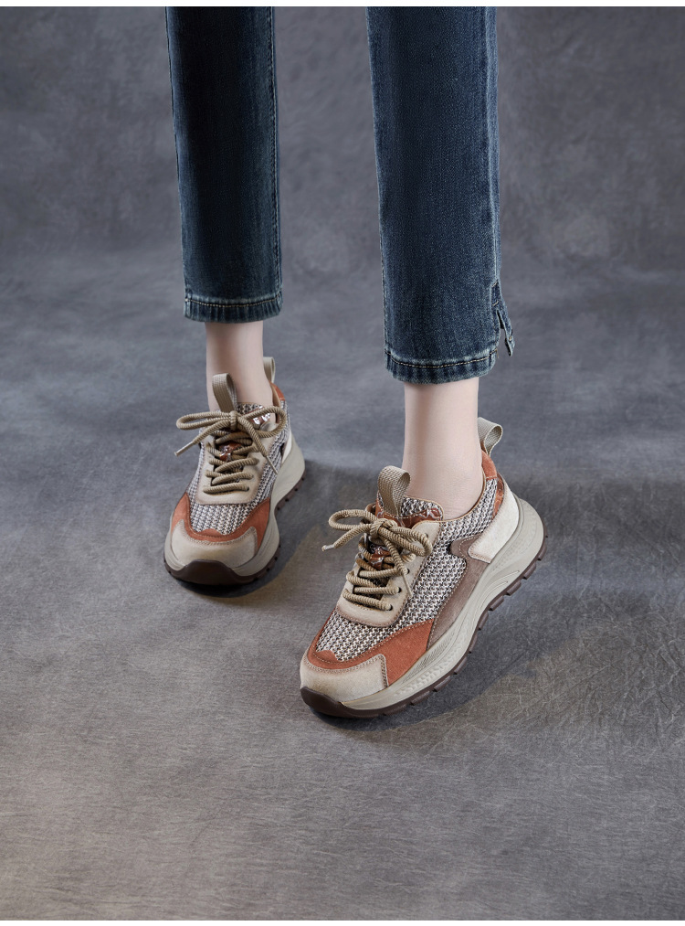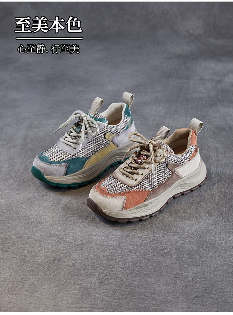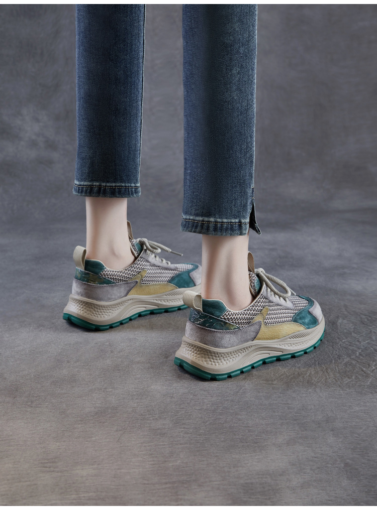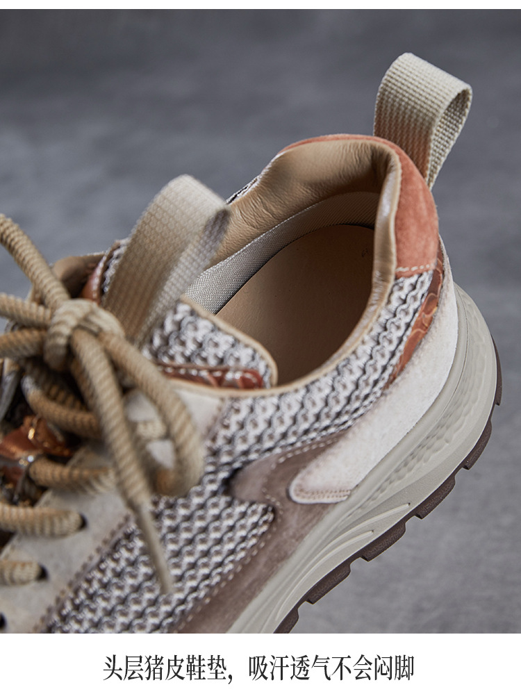 봄과 여름 2025 새로운 정품 가죽 둥근 발가락 포레스트 검프 신발 대조 컬러 싱글 레이어 신발 여성용 캐주얼 통기성 메쉬 경량 토레 신발