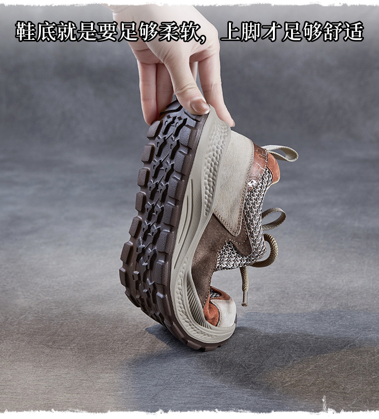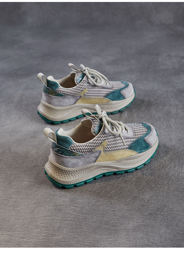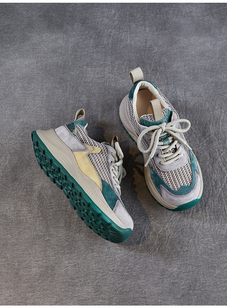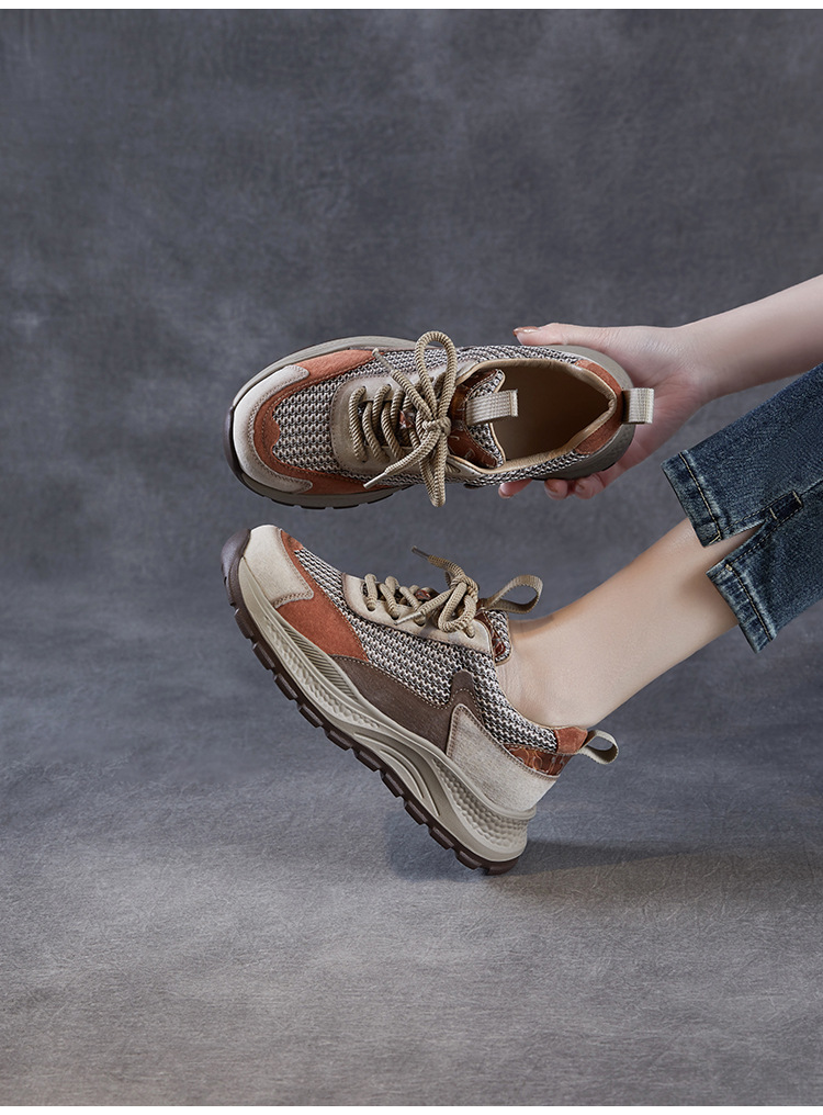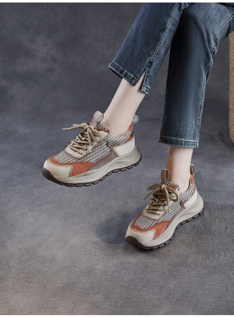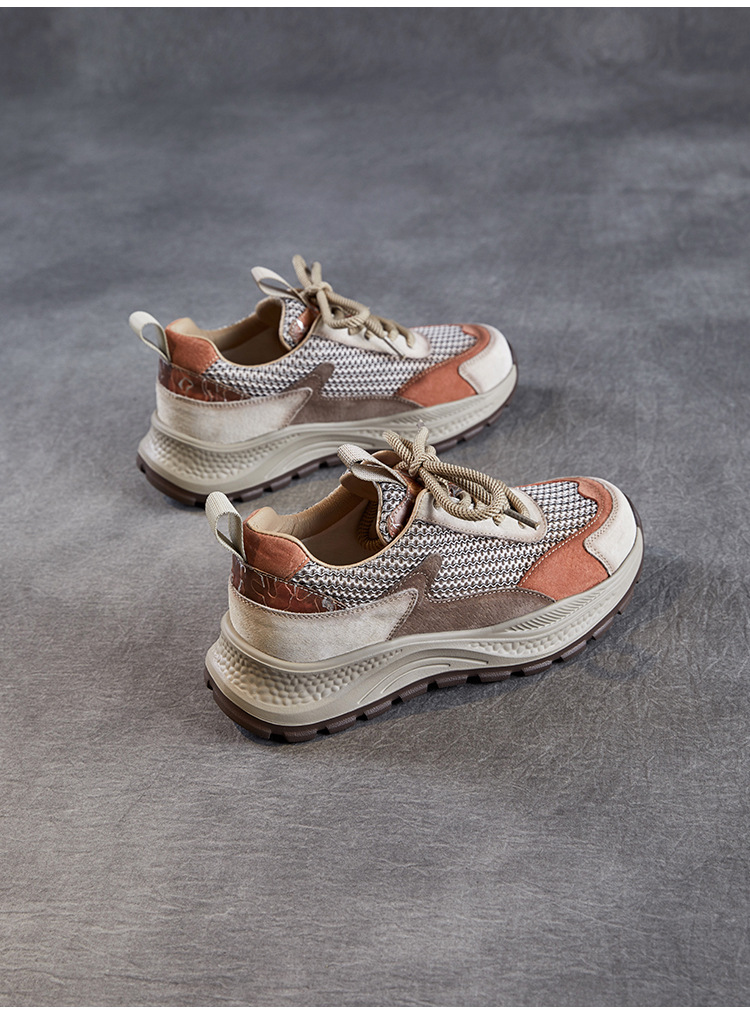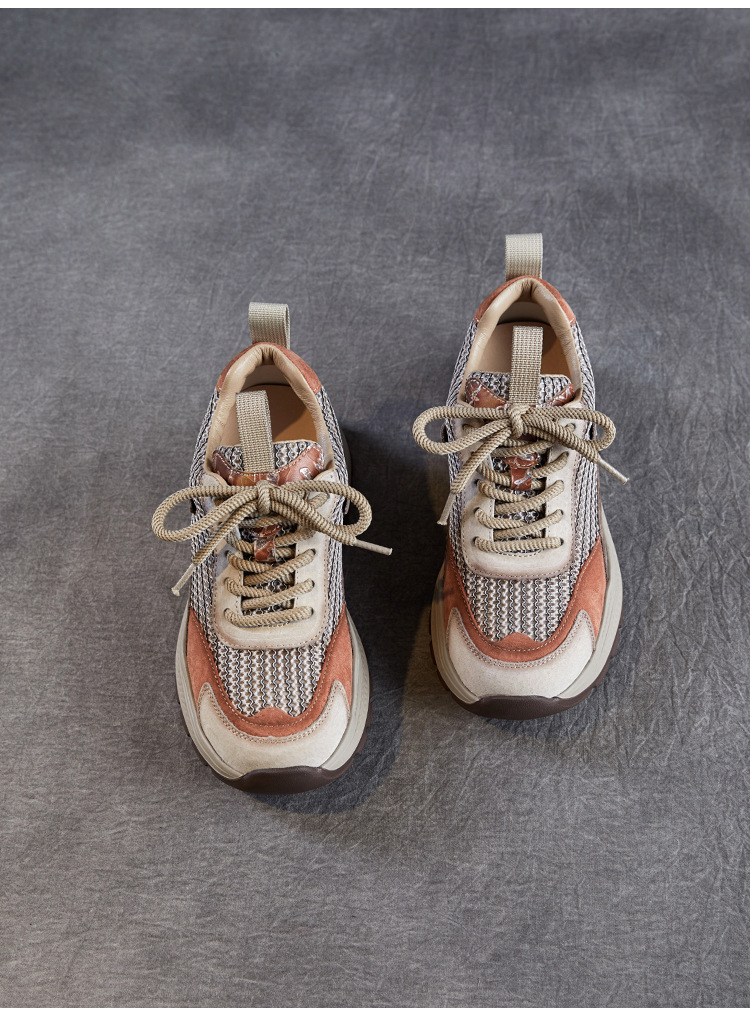 봄과 여름 2025 새로운 정품 가죽 둥근 발가락 포레스트 검프 신발 대조 컬러 싱글 레이어 신발 여성용 캐주얼 통기성 메쉬 경량 토레 신발