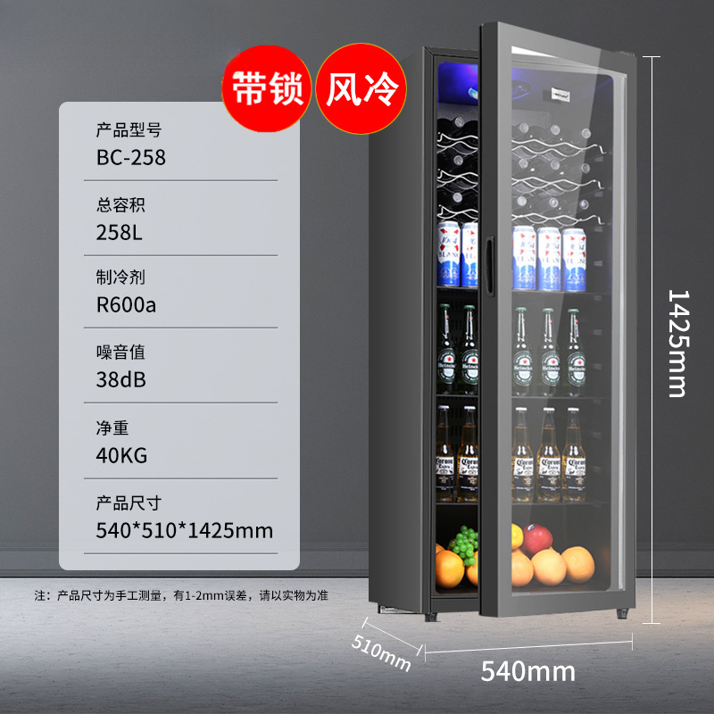 • 258리터 순수 구리 튜브, 완전 냉장, 공냉식, 성에 방지 LED 조명(잠금 장치 포함)