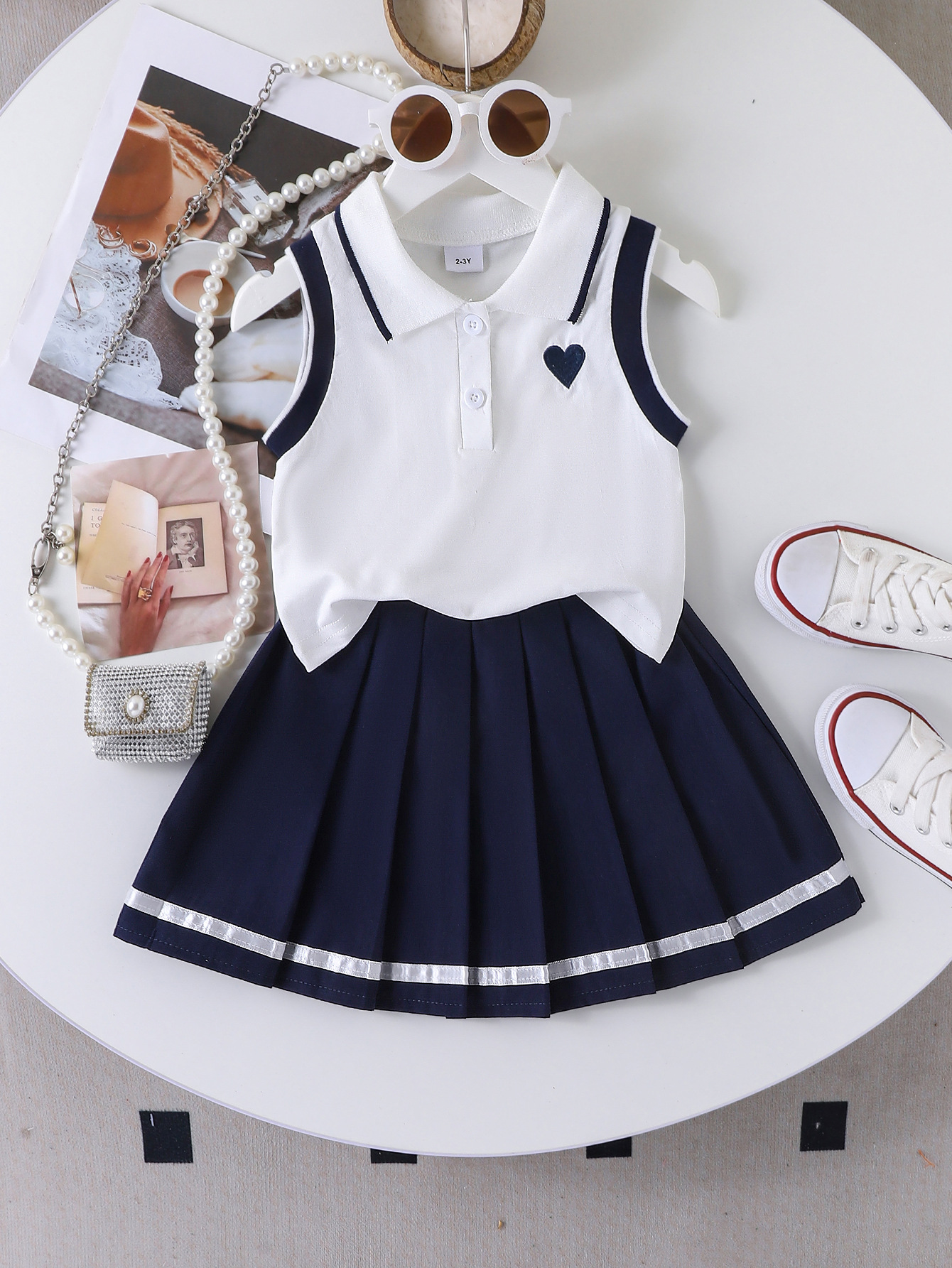 국경 간 유럽과 미국의 여름 소녀 세트 학교 스타일 POLP 칼라 민소매 최고 주름 치마 투피스 세트