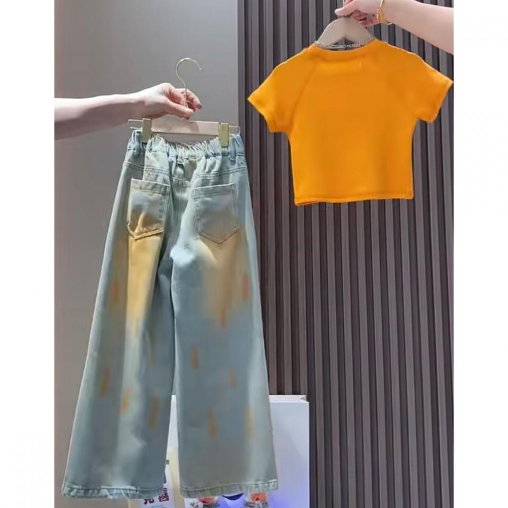 여아 여름 정장 2025 중대형 아동 패션 티셔츠, 패셔너블한 트렌디 청바지, 와이드 팬츠 투피스 세트