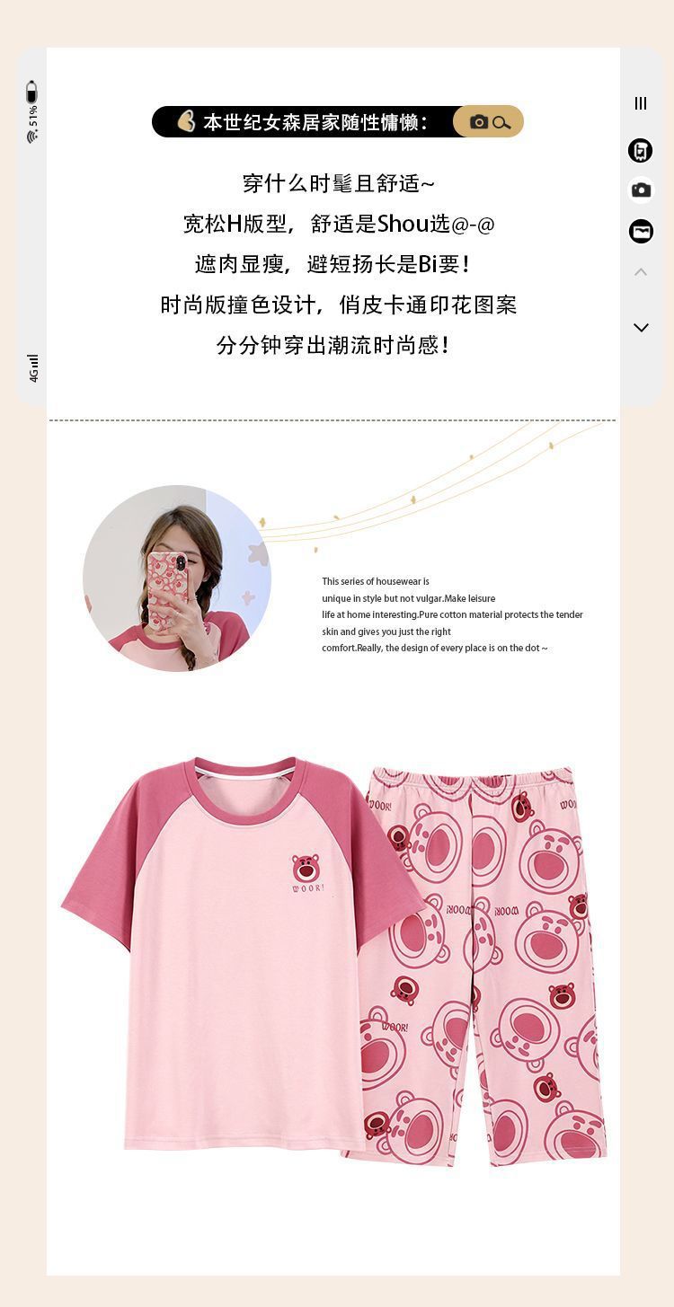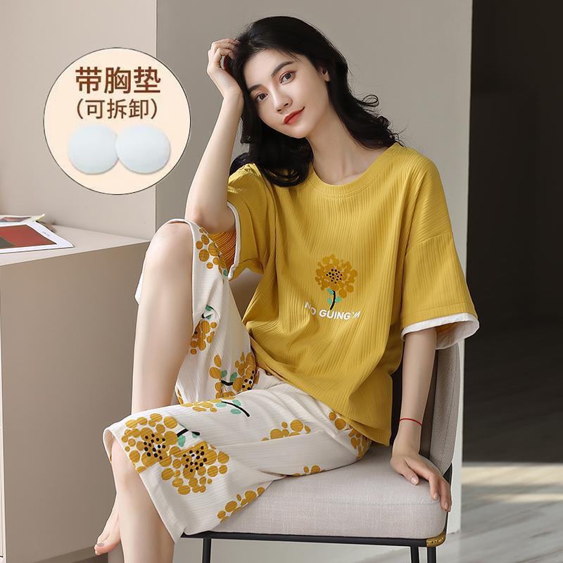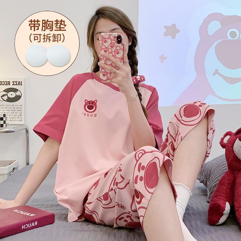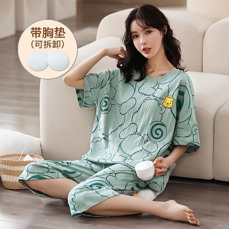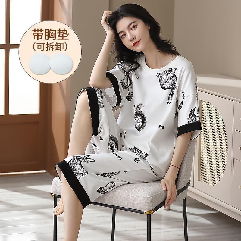 가슴 패드와 잠옷 여성 여름 새로운 반팔 카프리 바지 세트 귀여운 만화 여름 얇은 플러스 사이즈 홈 옷스토어 가기