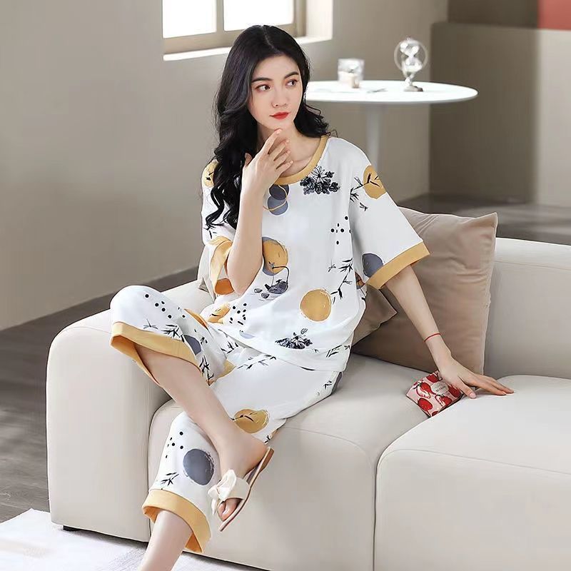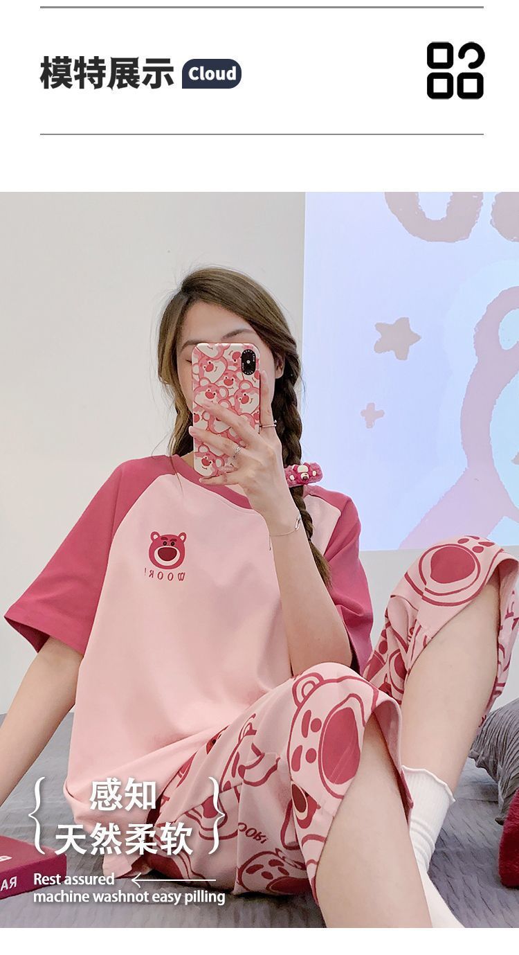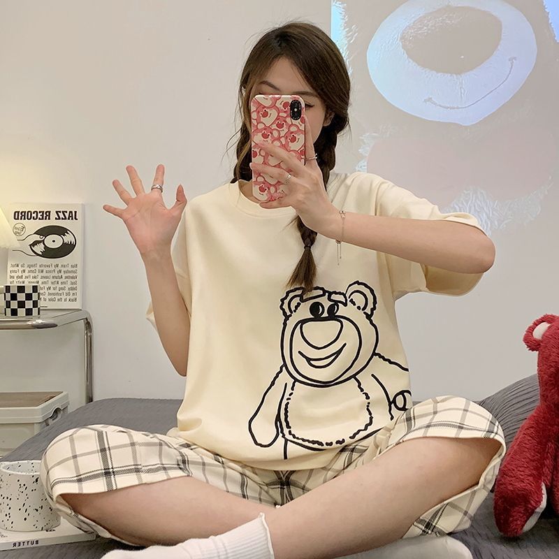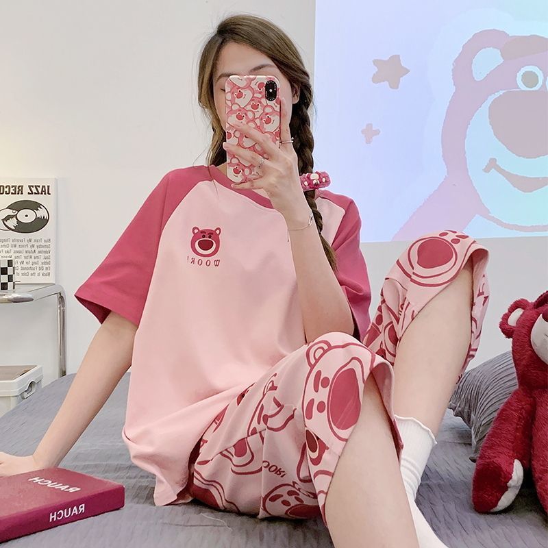 가슴 패드와 잠옷 여성 여름 새로운 반팔 카프리 바지 세트 귀여운 만화 여름 얇은 플러스 사이즈 홈 옷스토어 가기