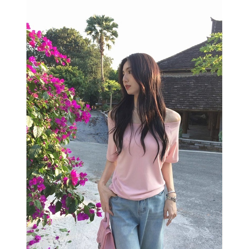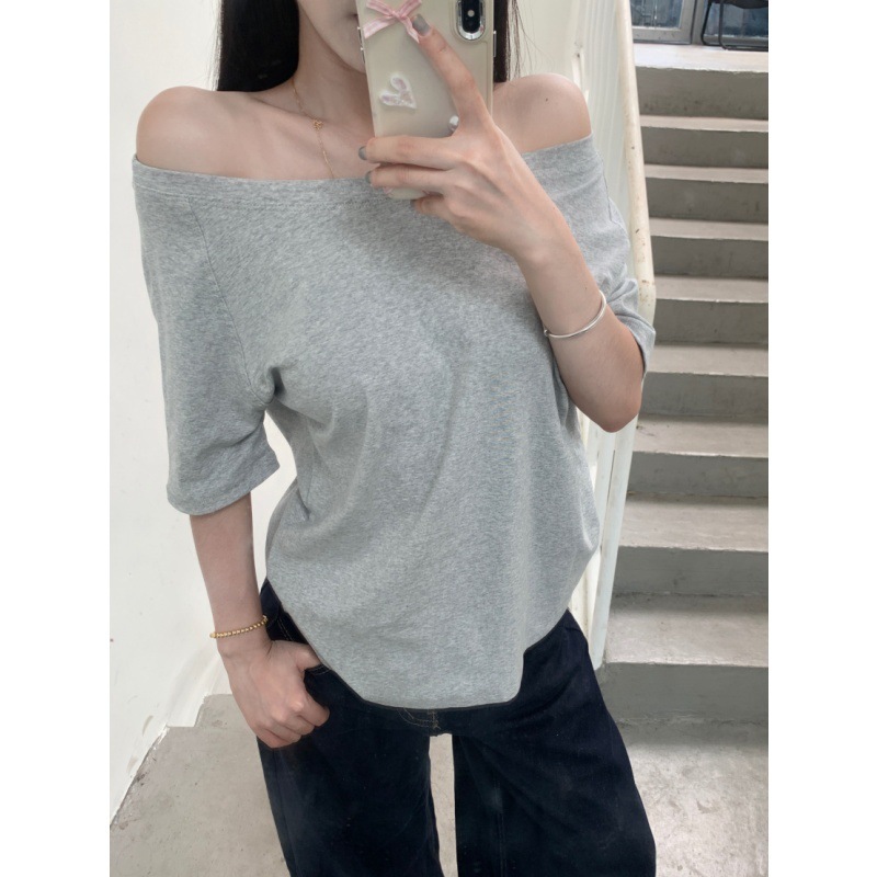 [30 일 뜨거운 1863 조각] 순수 오비큐 칼라 어깨 반팔 티셔츠 여성용 여름 2025 새로운 느슨한 어깨스토어 가기