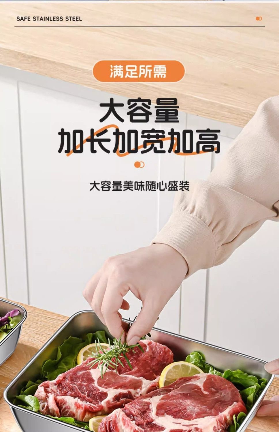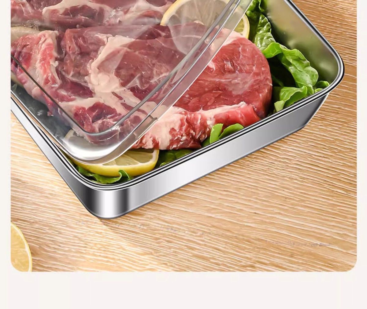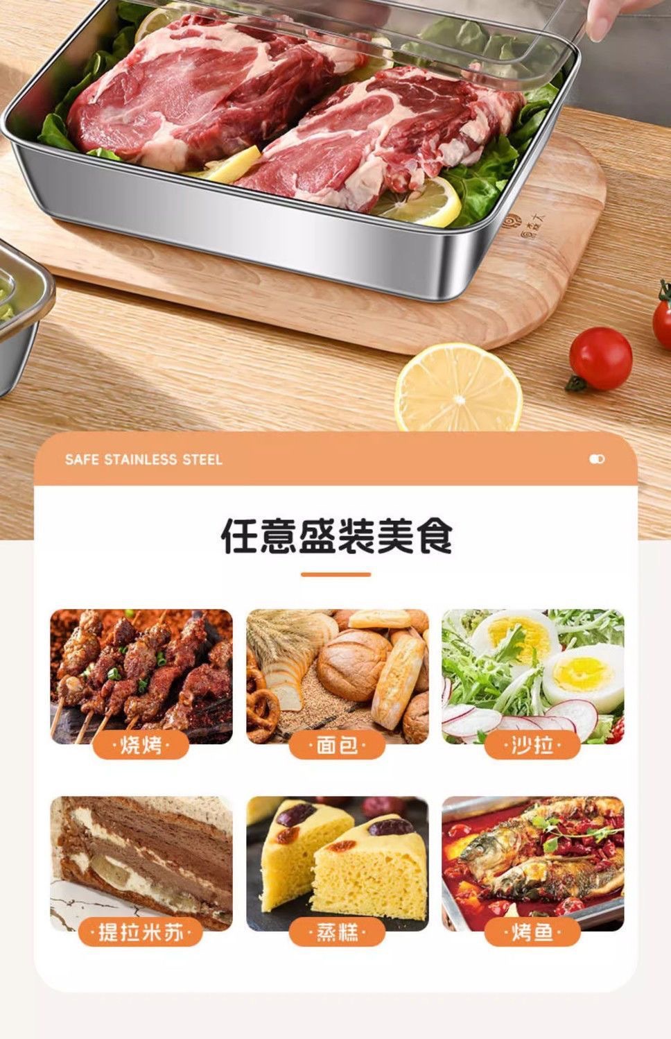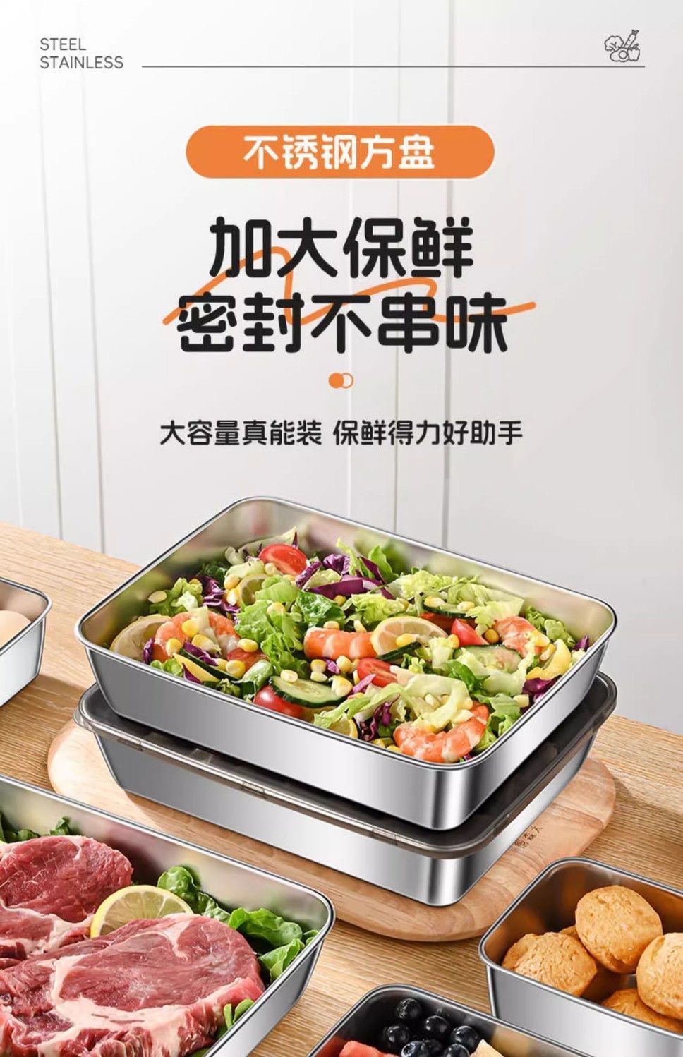 스테인레스 스틸 식품 등급 두꺼운 사각형 접시 차가운 접시 트레이 김이 나는 트레이 뚜껑 오븐 직사각형 씰이있는 다중 사용 신선한 보관 상자스토어 가기