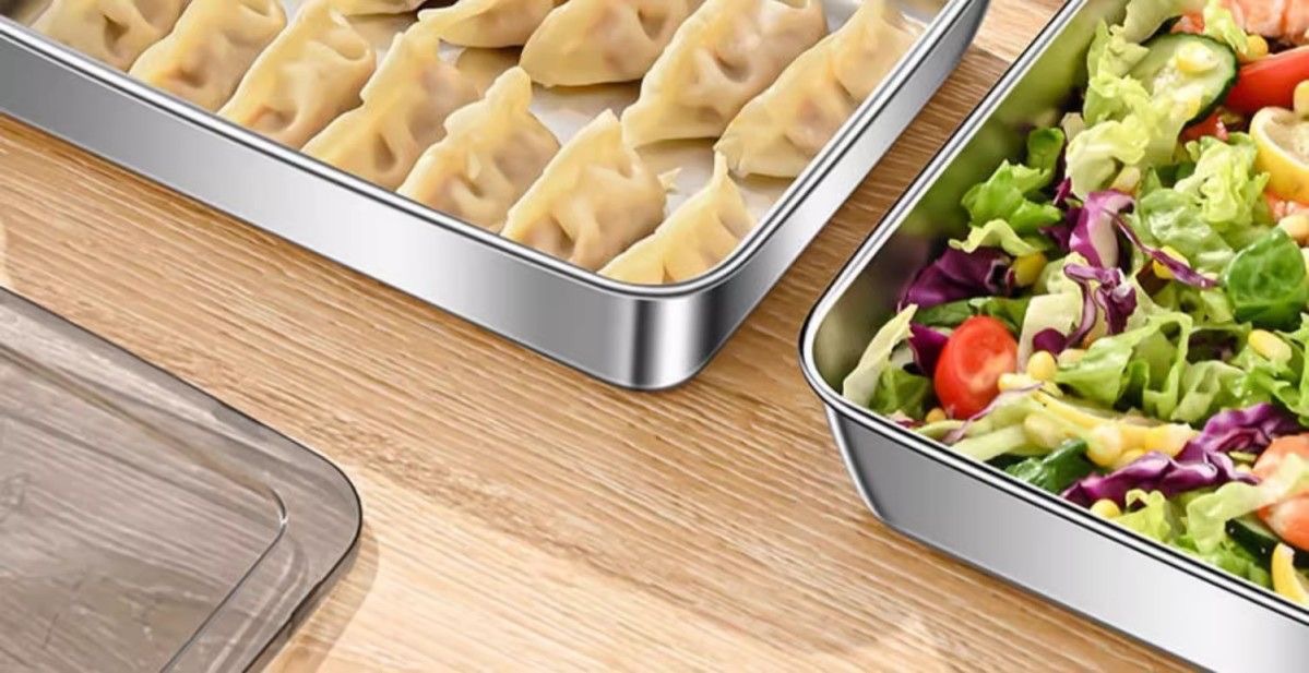 스테인레스 스틸 식품 등급 두꺼운 사각형 접시 차가운 접시 트레이 김이 나는 트레이 뚜껑 오븐 직사각형 씰이있는 다중 사용 신선한 보관 상자