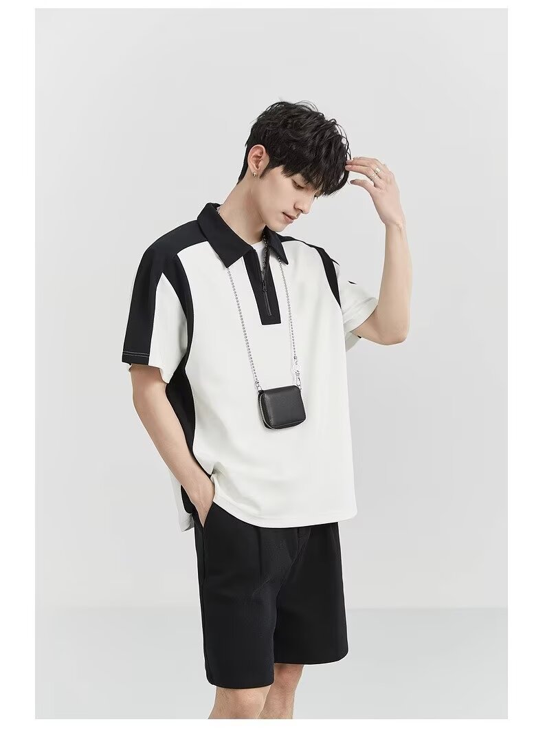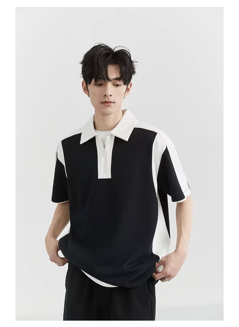 캐주얼 콘트라스트 스티칭 폴로 셔츠 남자 반팔 25 여름 새 한국 스타일 루즈 지퍼 립 반소매 티셔츠