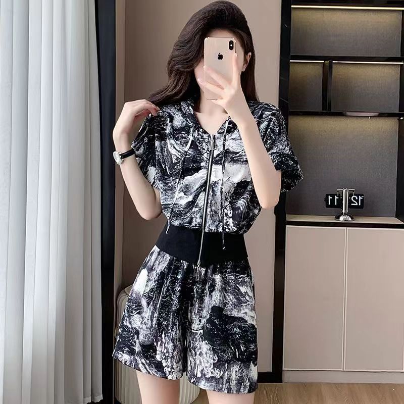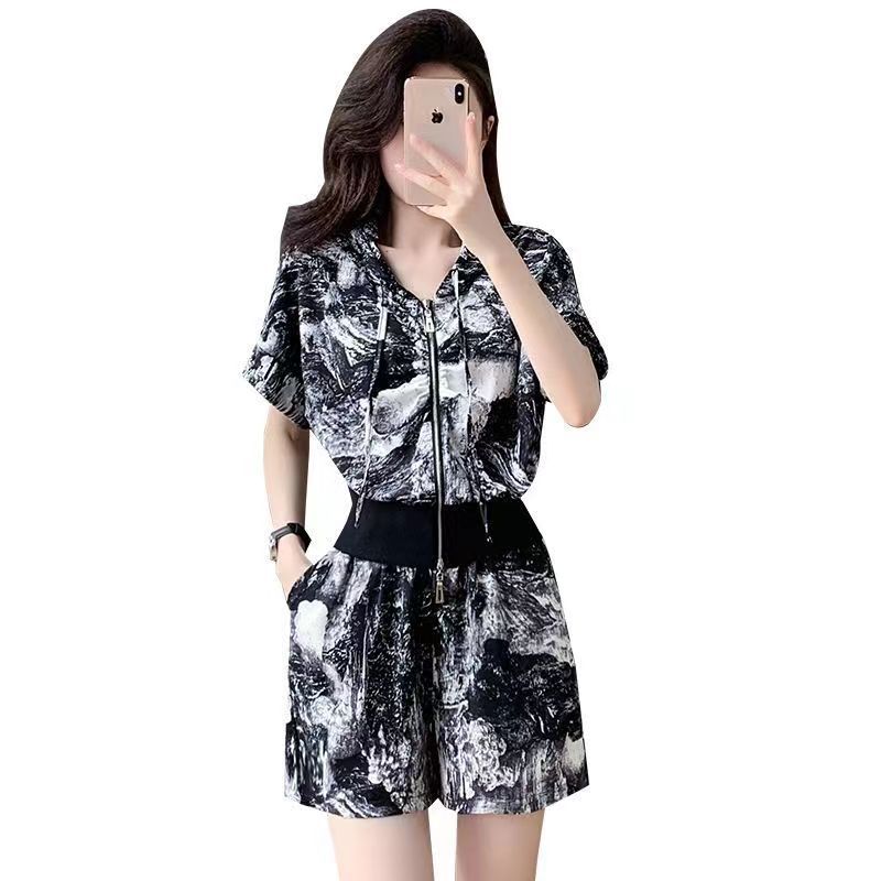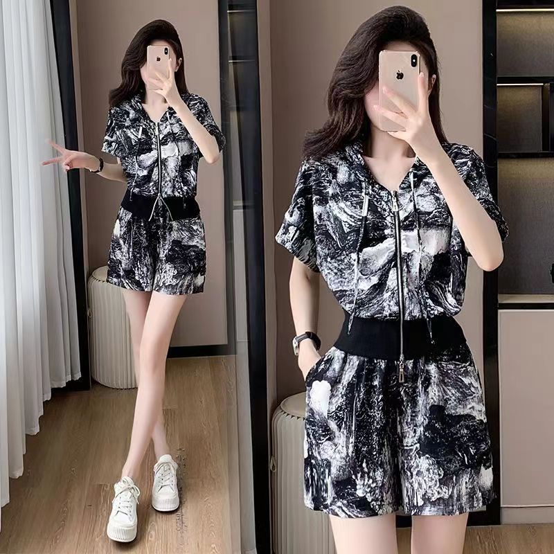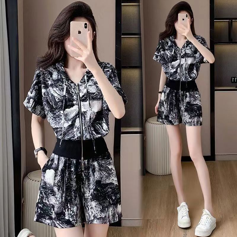 2025 캐주얼 스포츠 반바지 세트 여름 플러스 사이즈 서양식 후드 카디건 나이 감소 슬리밍 여성을위한 새로운 투피스 세트스토어 가기