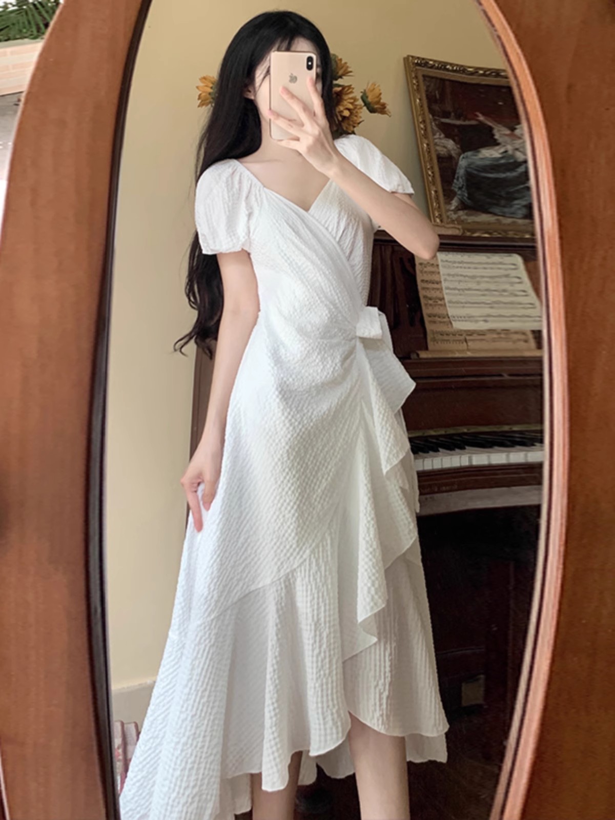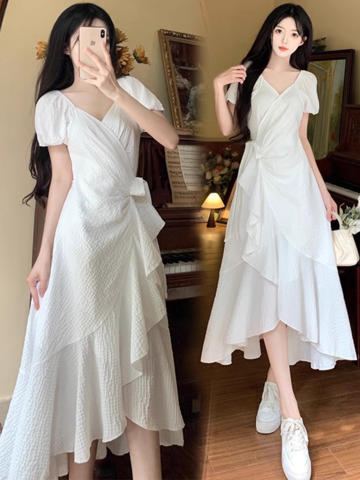 플러스 사이즈 부드러운 V-넥 텍스처 러플 원피스 여성 여름 통통녀 꽉 허리 슬리밍 우아한 A-라인 롱 원피스스토어 가기