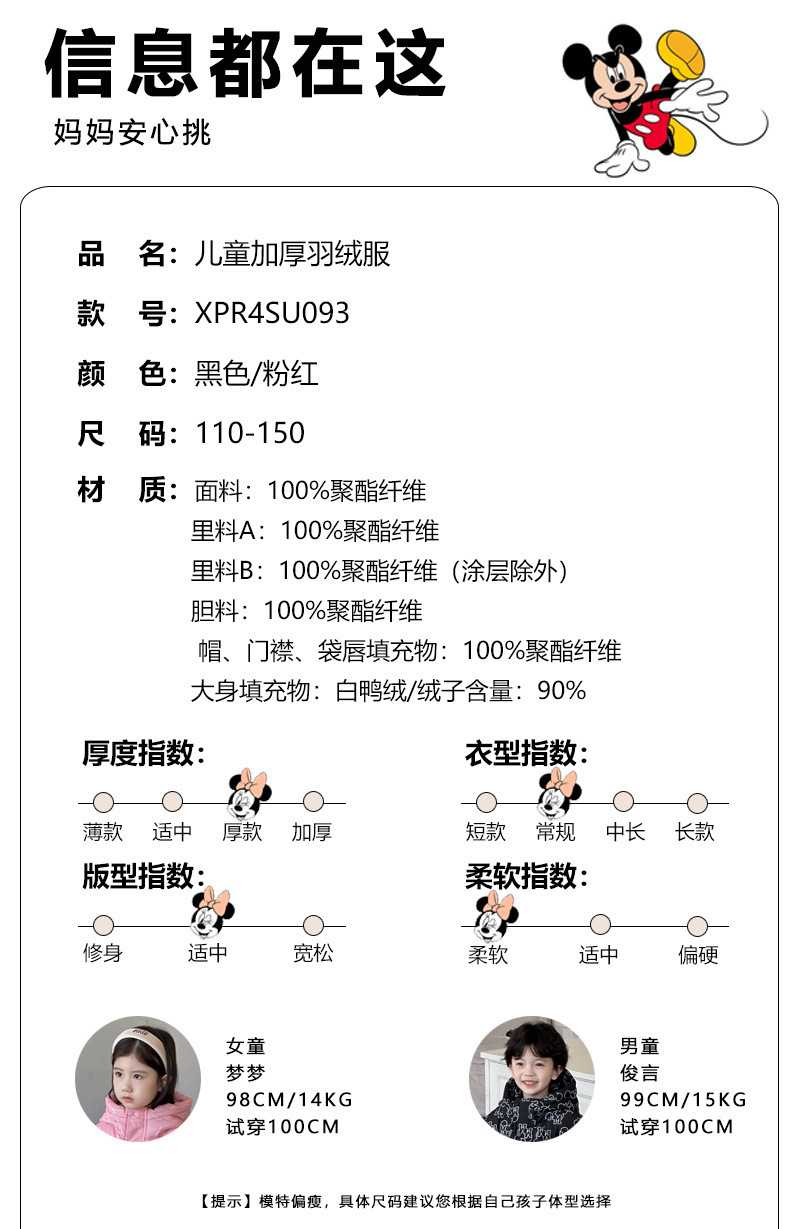디즈니 키즈 90 화이트 덕 다운 새로운 국가 표준 풀 프린트 다운 재킷 블랙 골드 두꺼운 후드 다운 재킷