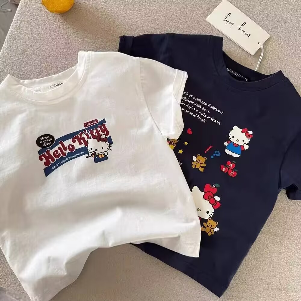 어린이 여름 만화 한국 스타일 소녀 코튼 반팔 느슨한 패셔너블 티셔츠 올 매치 중소 어린이 얇은 고양이 탑 트렌디스토어 가기