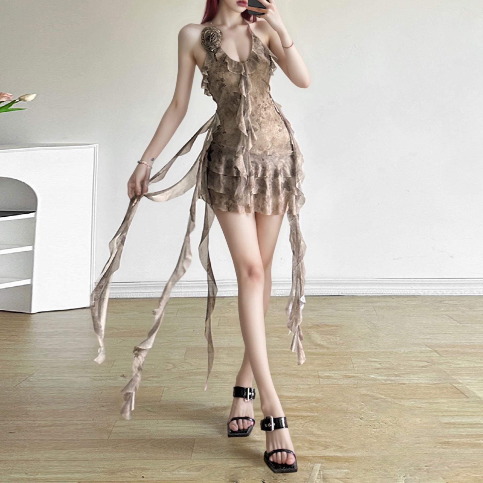 국경 간 대외 무역 스파이스 소녀 섹시한 메쉬 술 불규칙한 원피스 여성 여름 슬림 모양 슬링 짧은 치마 슬림 핏스토어 가기