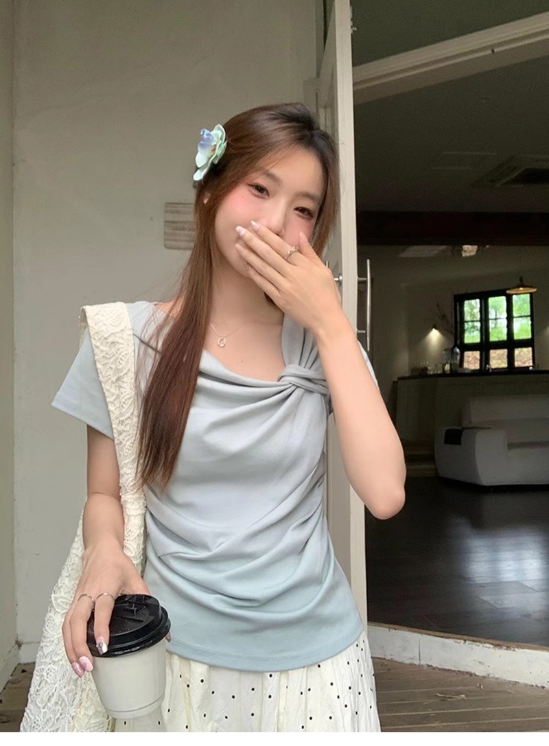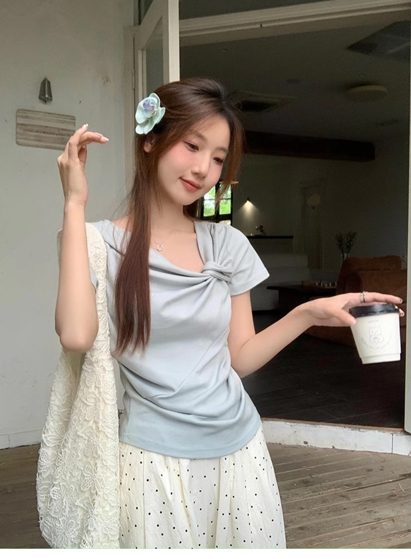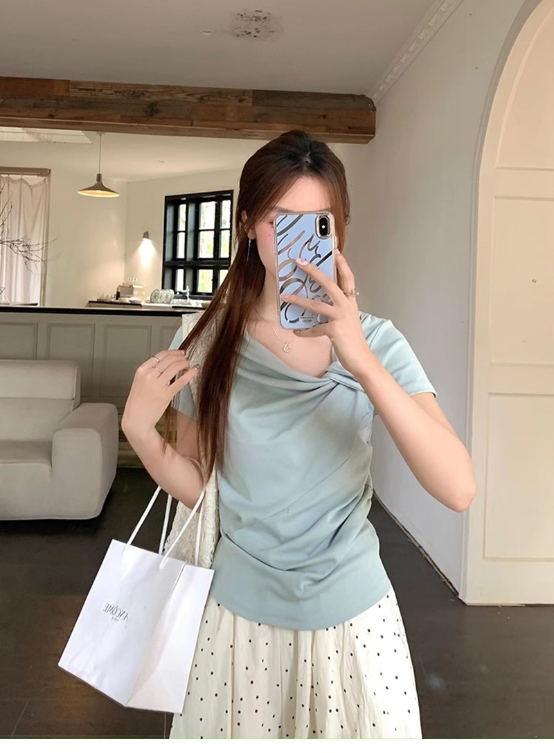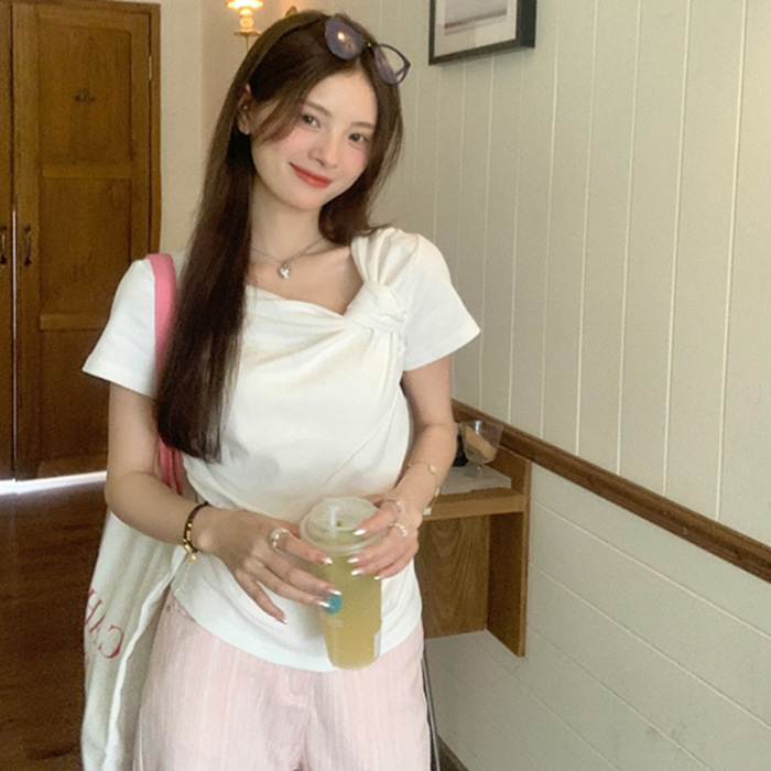 Jin Jing Guan Tu [재고 40 면 원래 품질] 비스듬한 칼라 숄더 링크 반소매 티셔츠 슬림 핏 탑스토어 가기