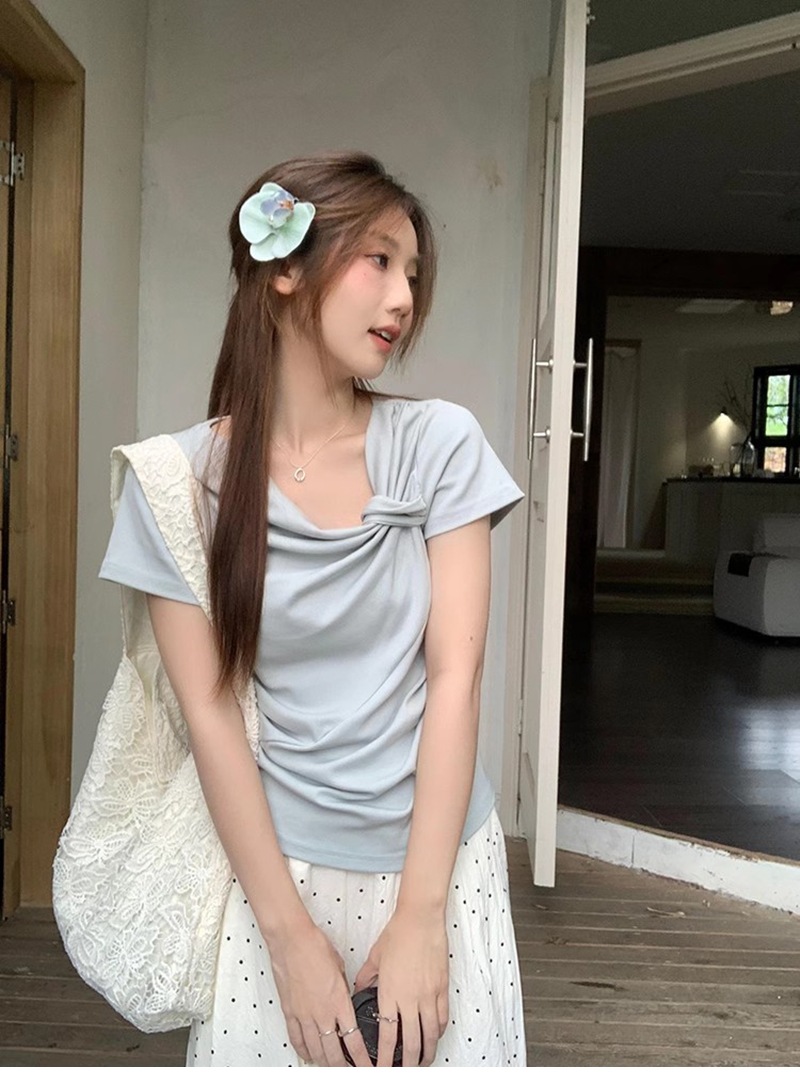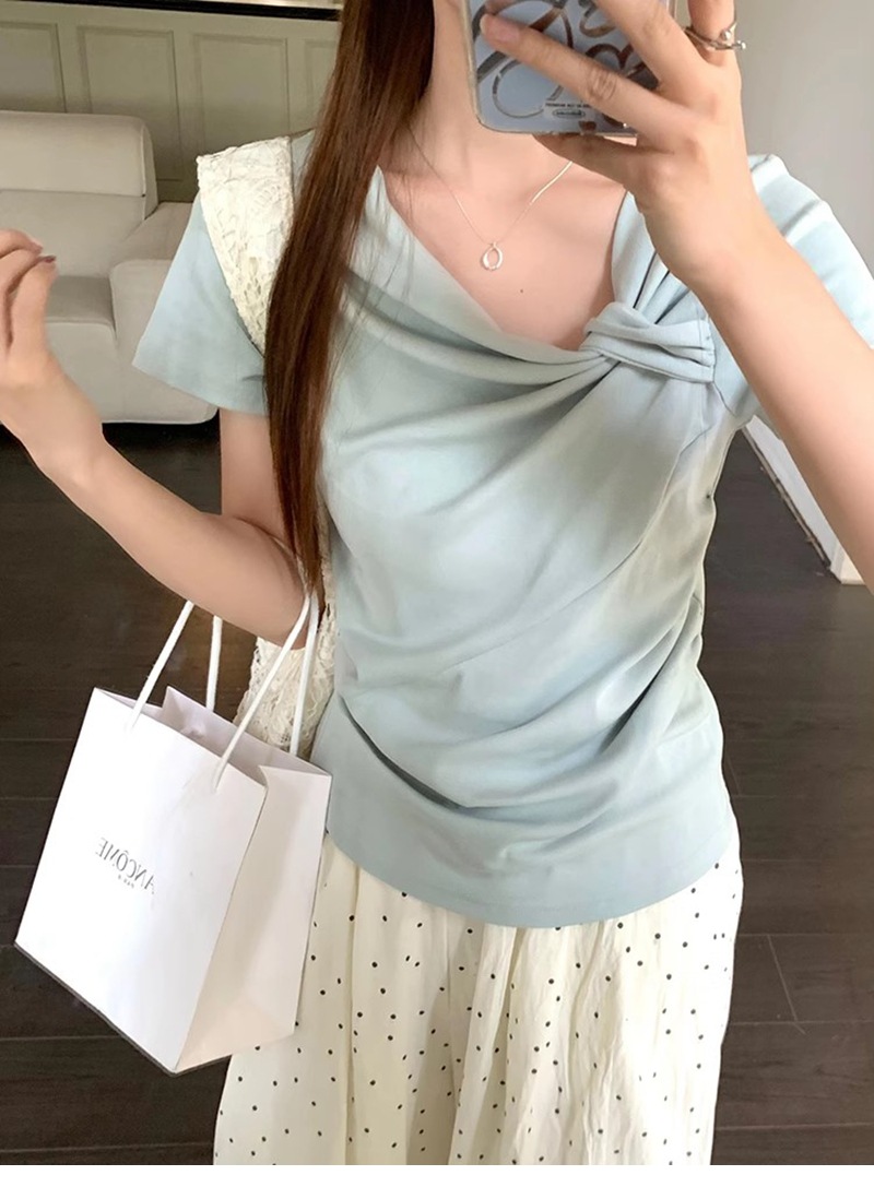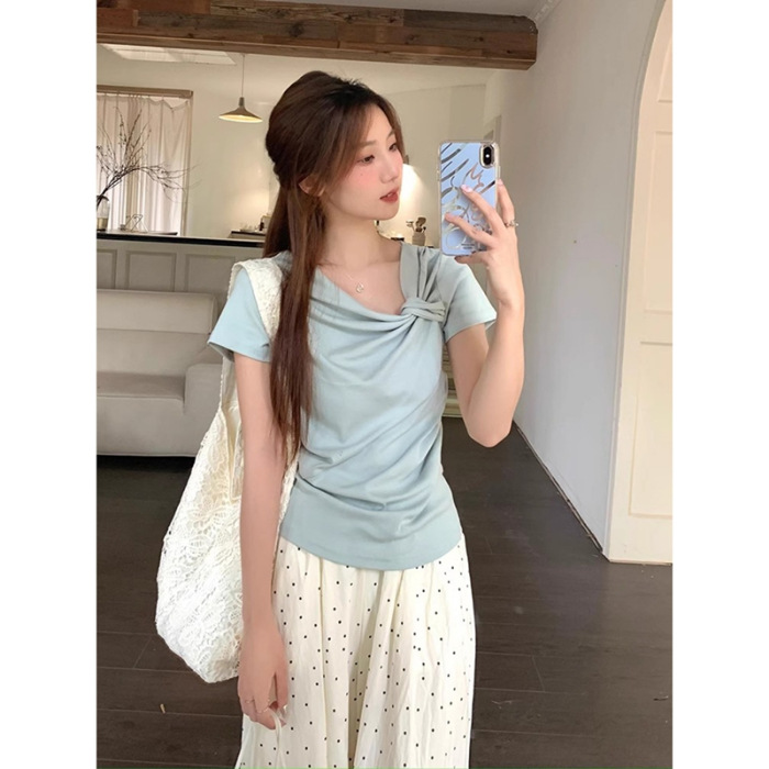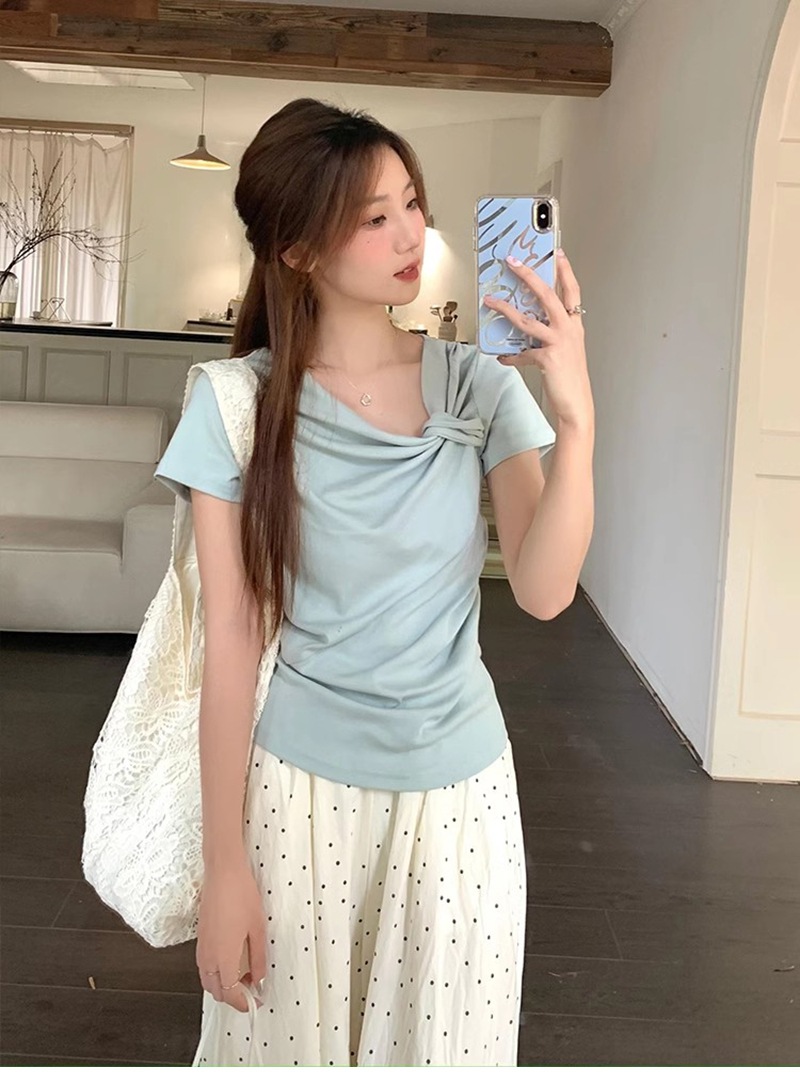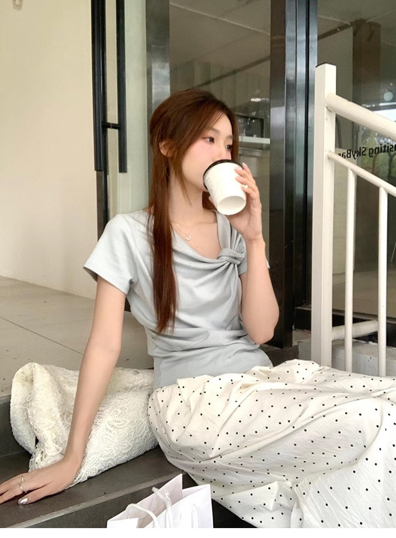 Jin Jing Guan Tu [재고 40 면 원래 품질] 비스듬한 칼라 숄더 링크 반소매 티셔츠 슬림 핏 탑스토어 가기