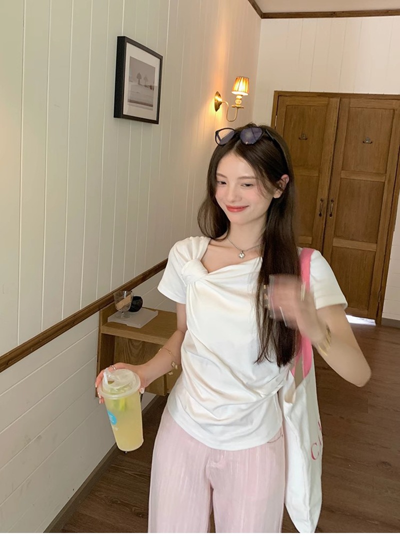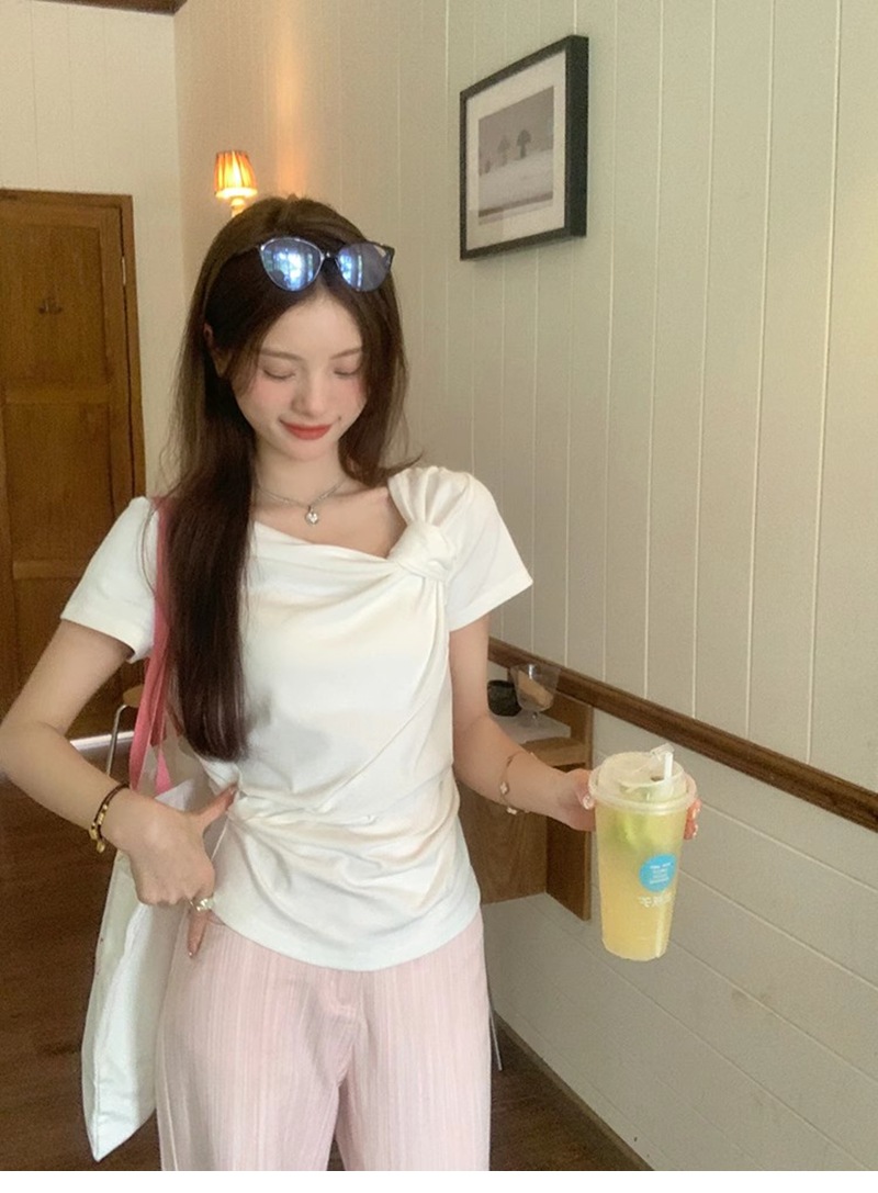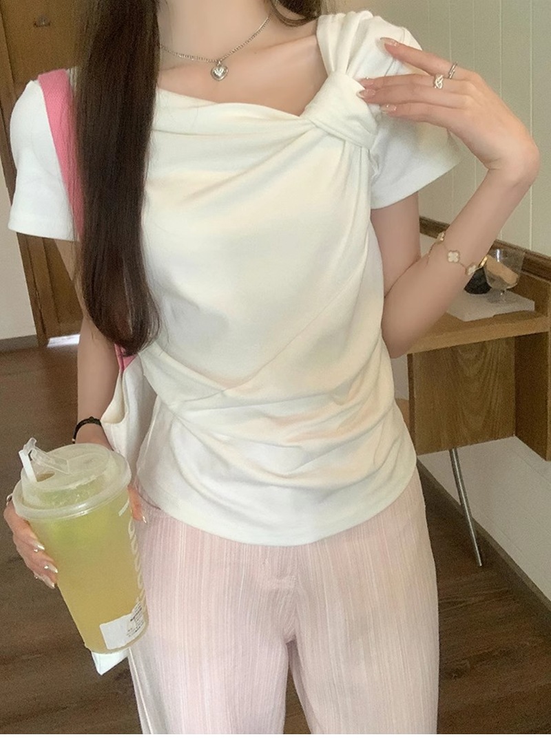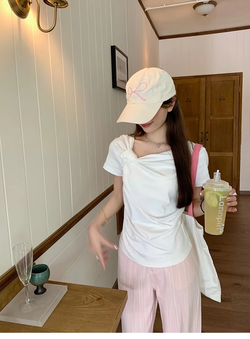 Jin Jing Guan Tu [재고 40 면 원래 품질] 비스듬한 칼라 숄더 링크 반소매 티셔츠 슬림 핏 탑