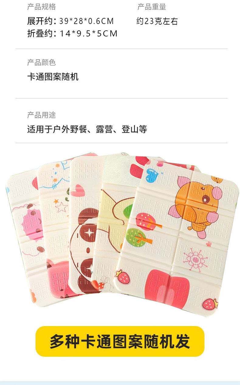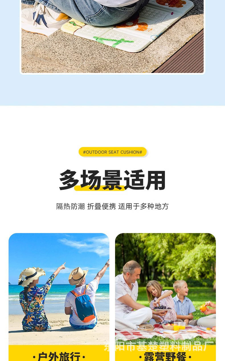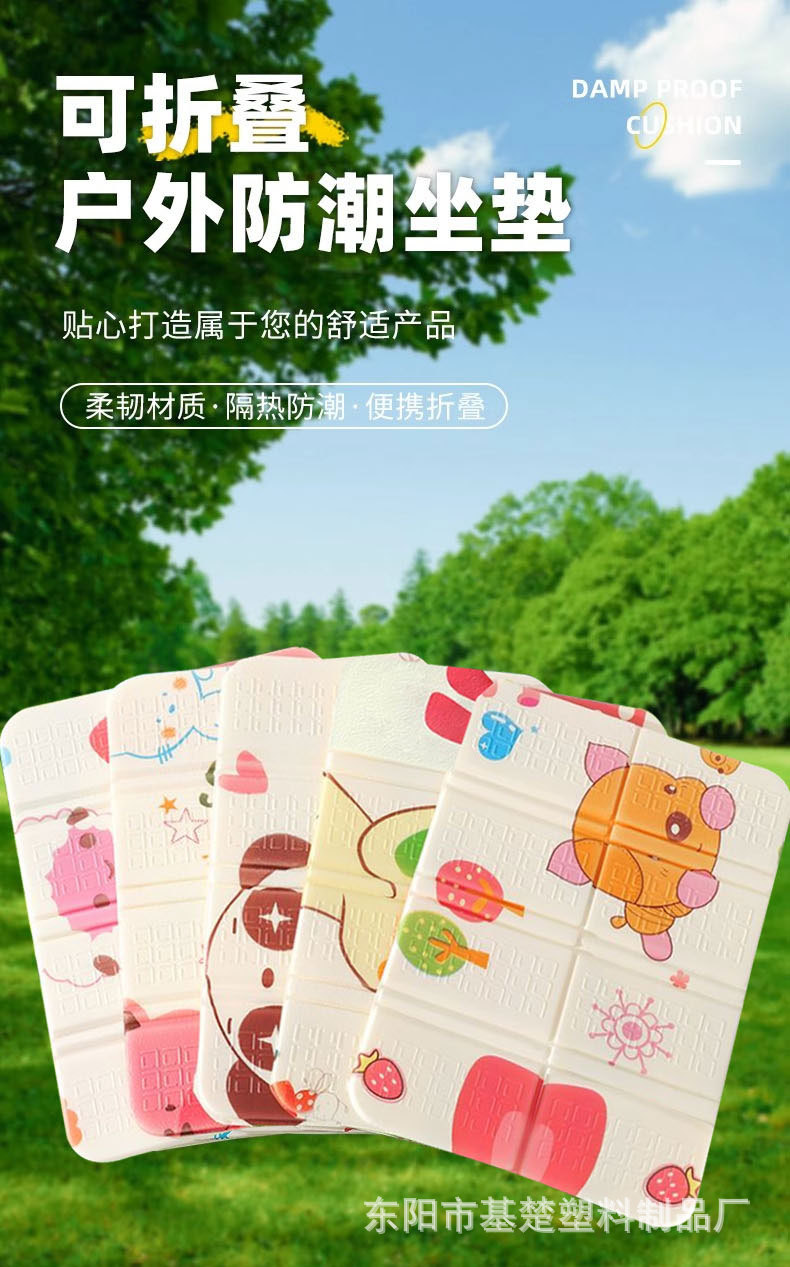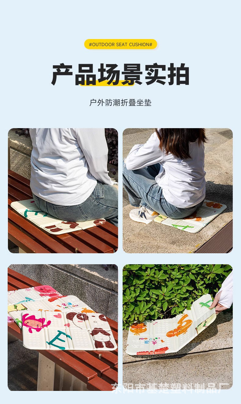 产品特点:经典款折叠八折小坐垫,XPE超轻环保材料,颜色多样,无异味,不掉色,皮实耐用;户外运动,休闲娱乐可随时携带;质量轻,体积小,老年人外出散步可随身携带。户外出行隔脏隔凉防潮防水,实在是出行的贴心小物件!