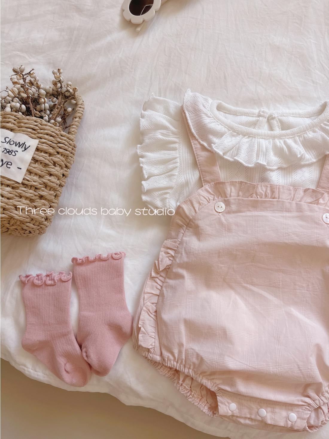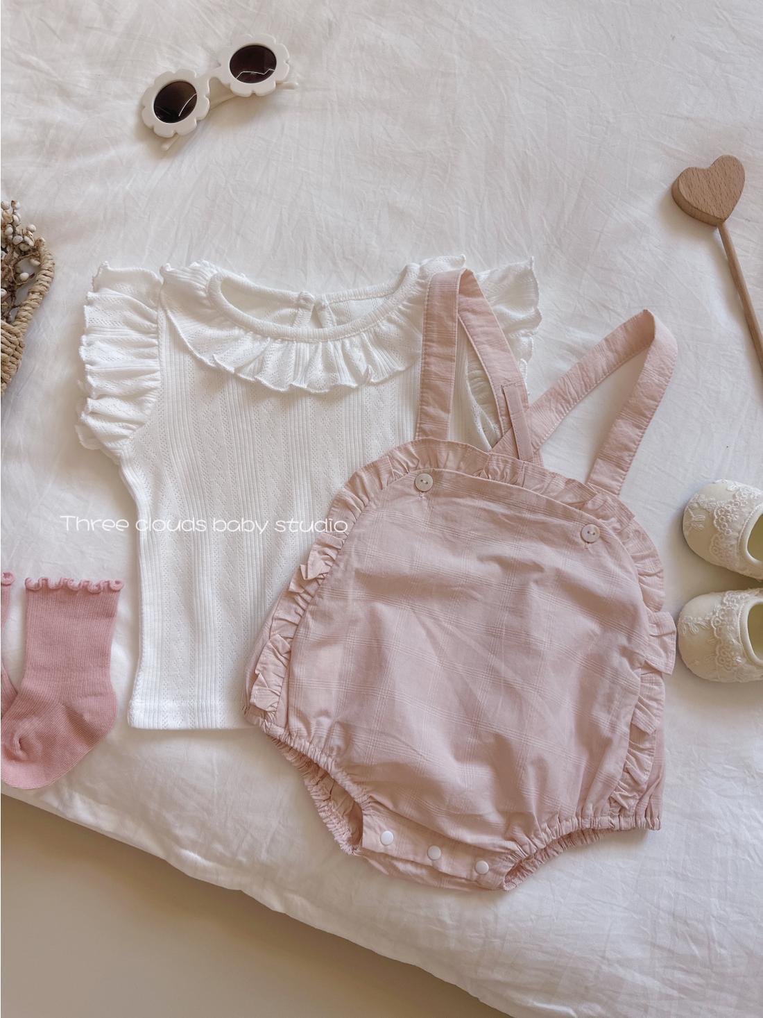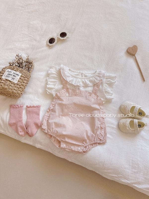 2025 새로운 아기 소녀 아기 여름 계피 가루 가방 방귀 세트 통기성 외국 스타일 중공 짧은 소매 면화스토어 가기