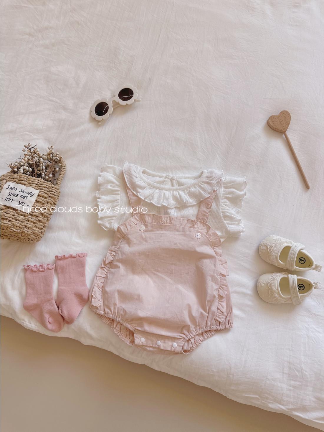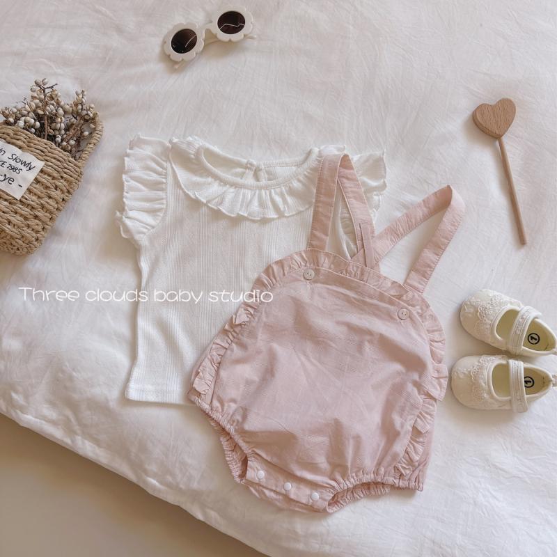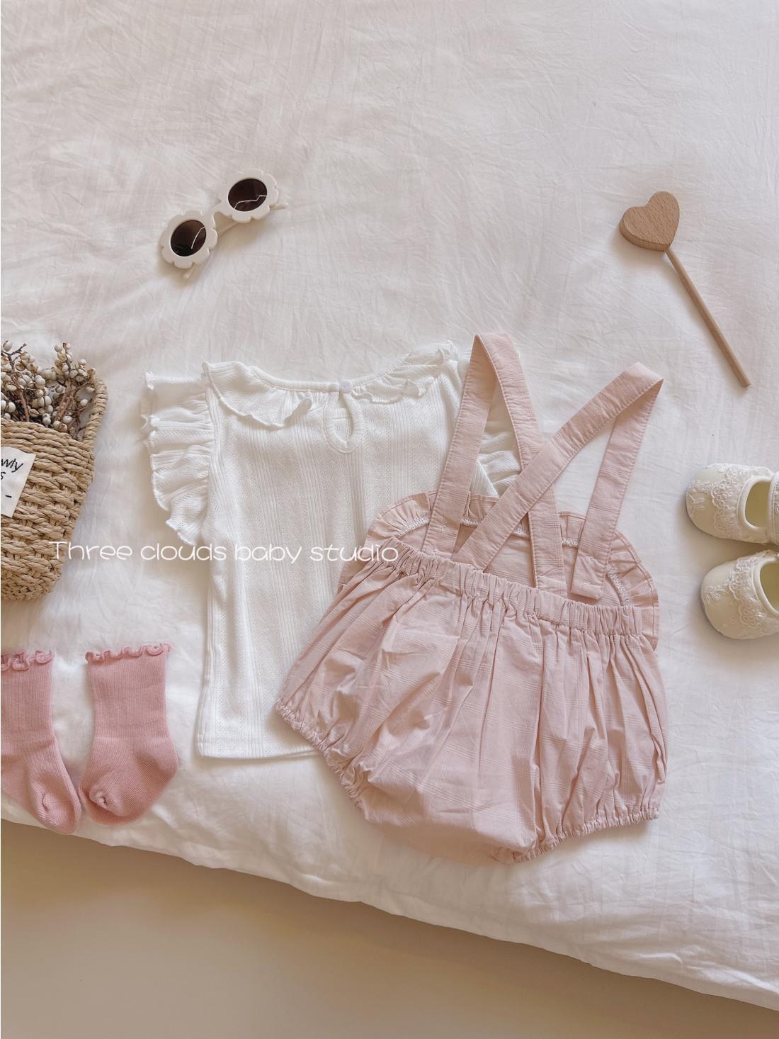2025 새로운 아기 소녀 아기 여름 계피 가루 가방 방귀 세트 통기성 외국 스타일 중공 짧은 소매 면화