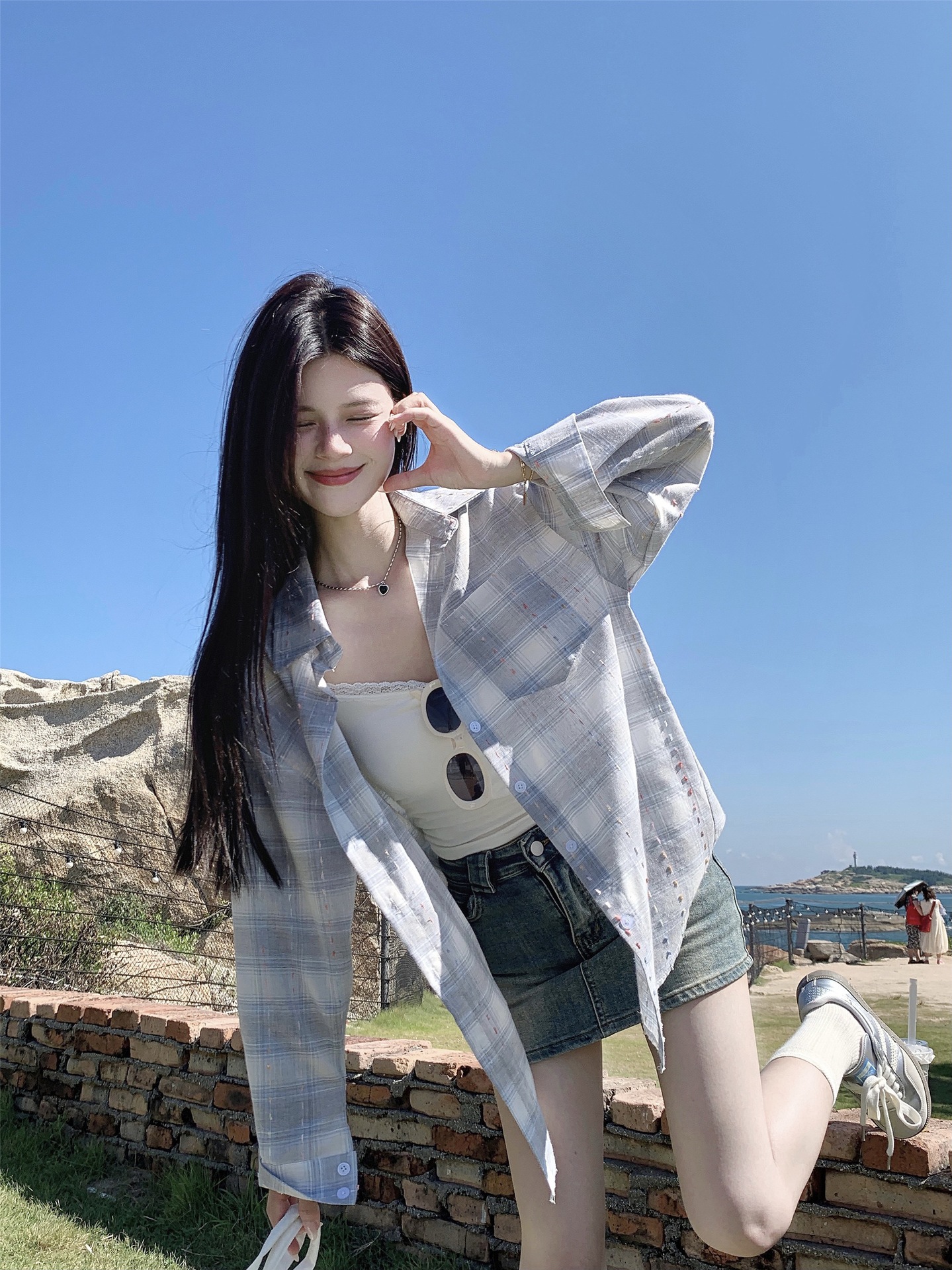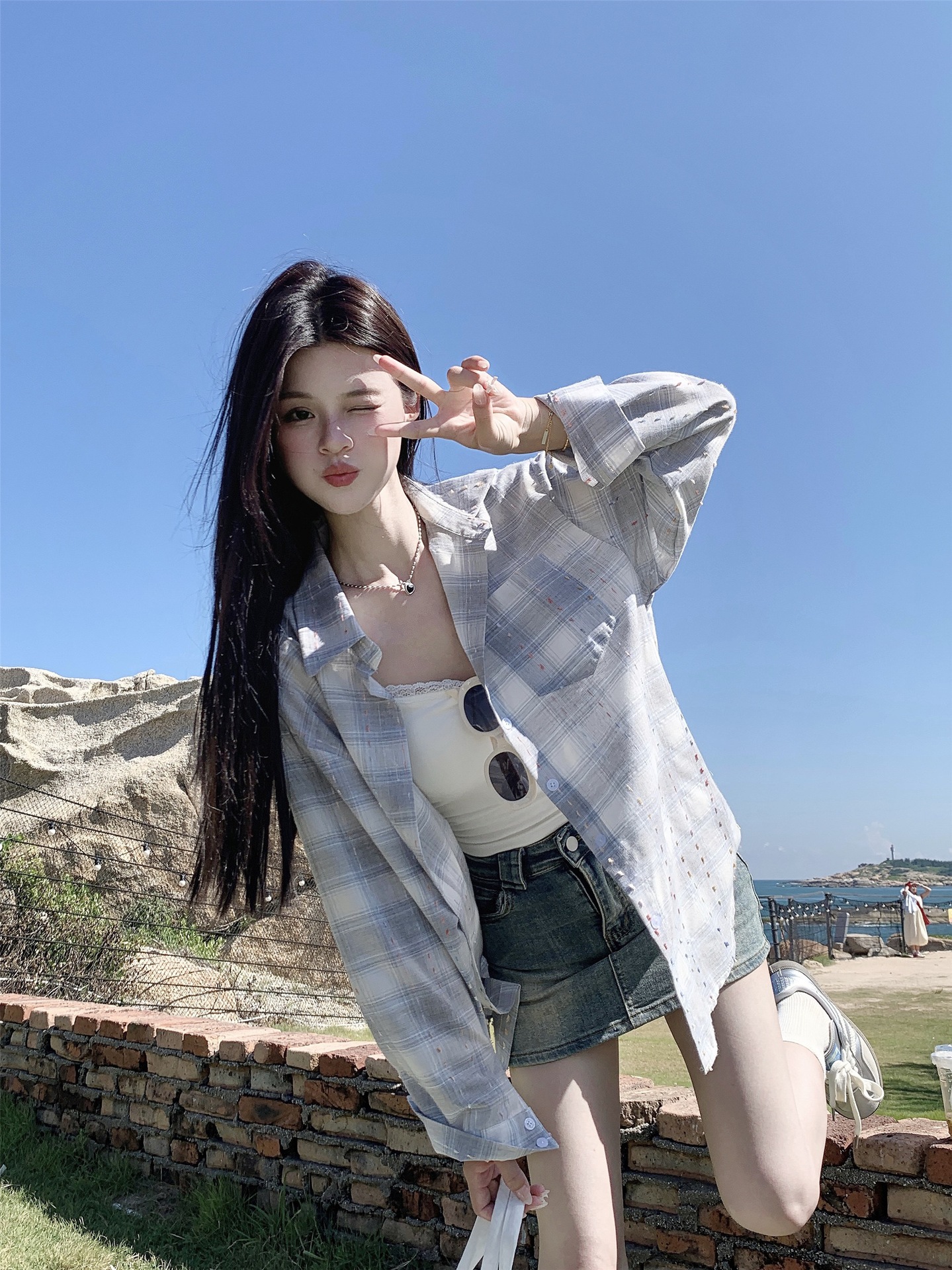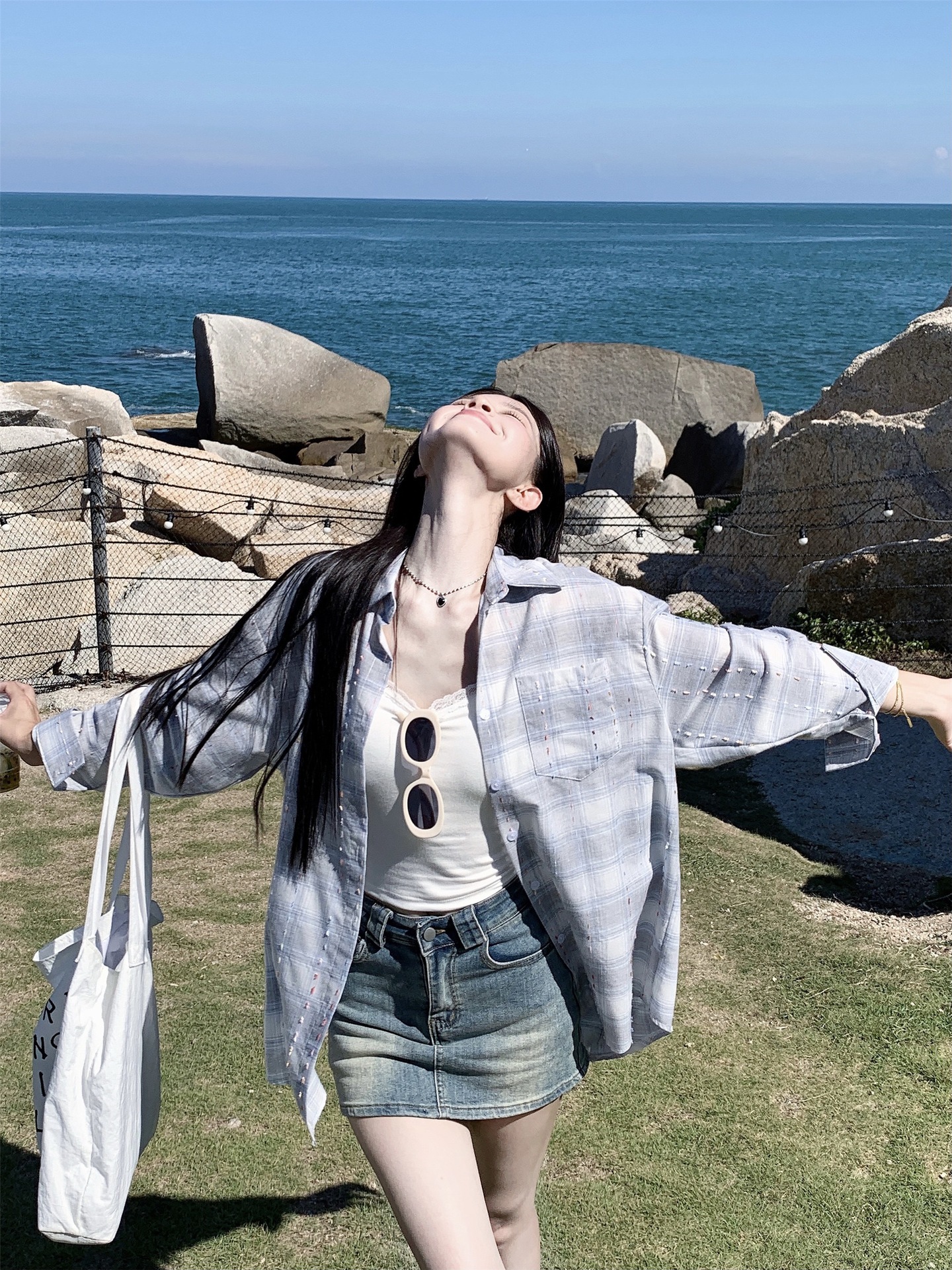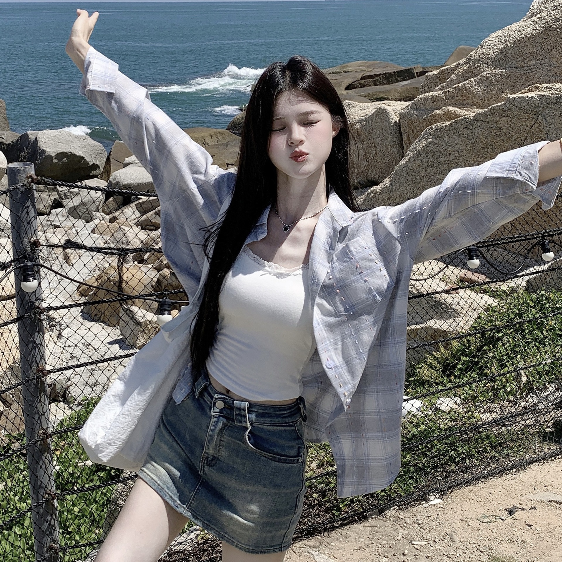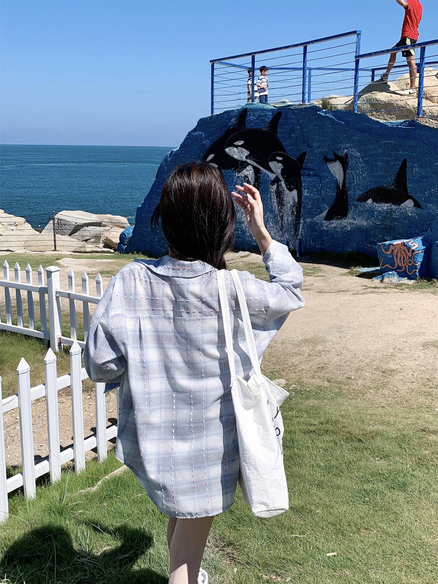 폴로 칼라 플레이드 긴 소매 셔츠 여성의 봄과 가을 새로운 느슨한 중간 길이의 하이 엔드 선 스크린 셔츠 올 매치 탑스토어 가기