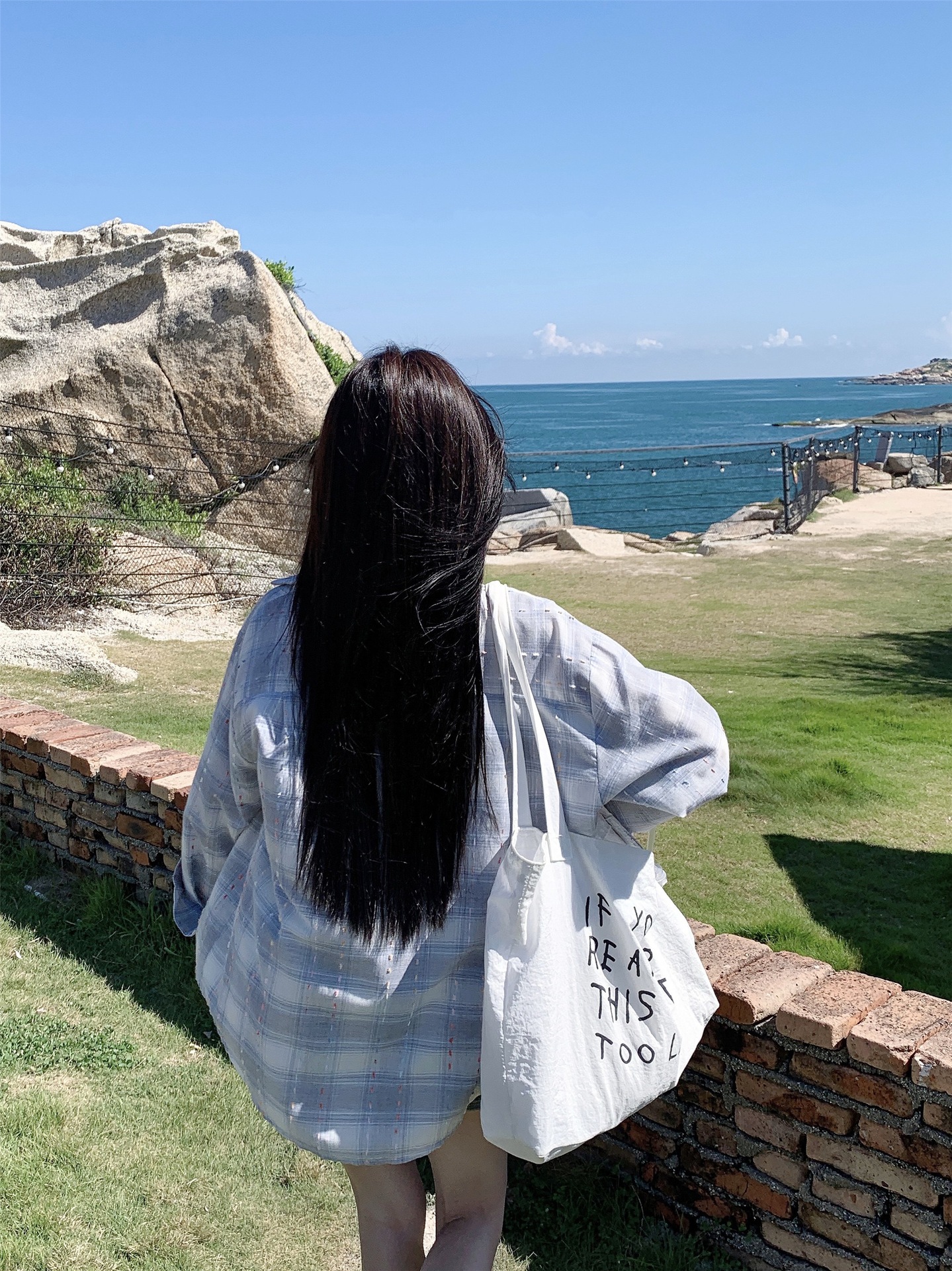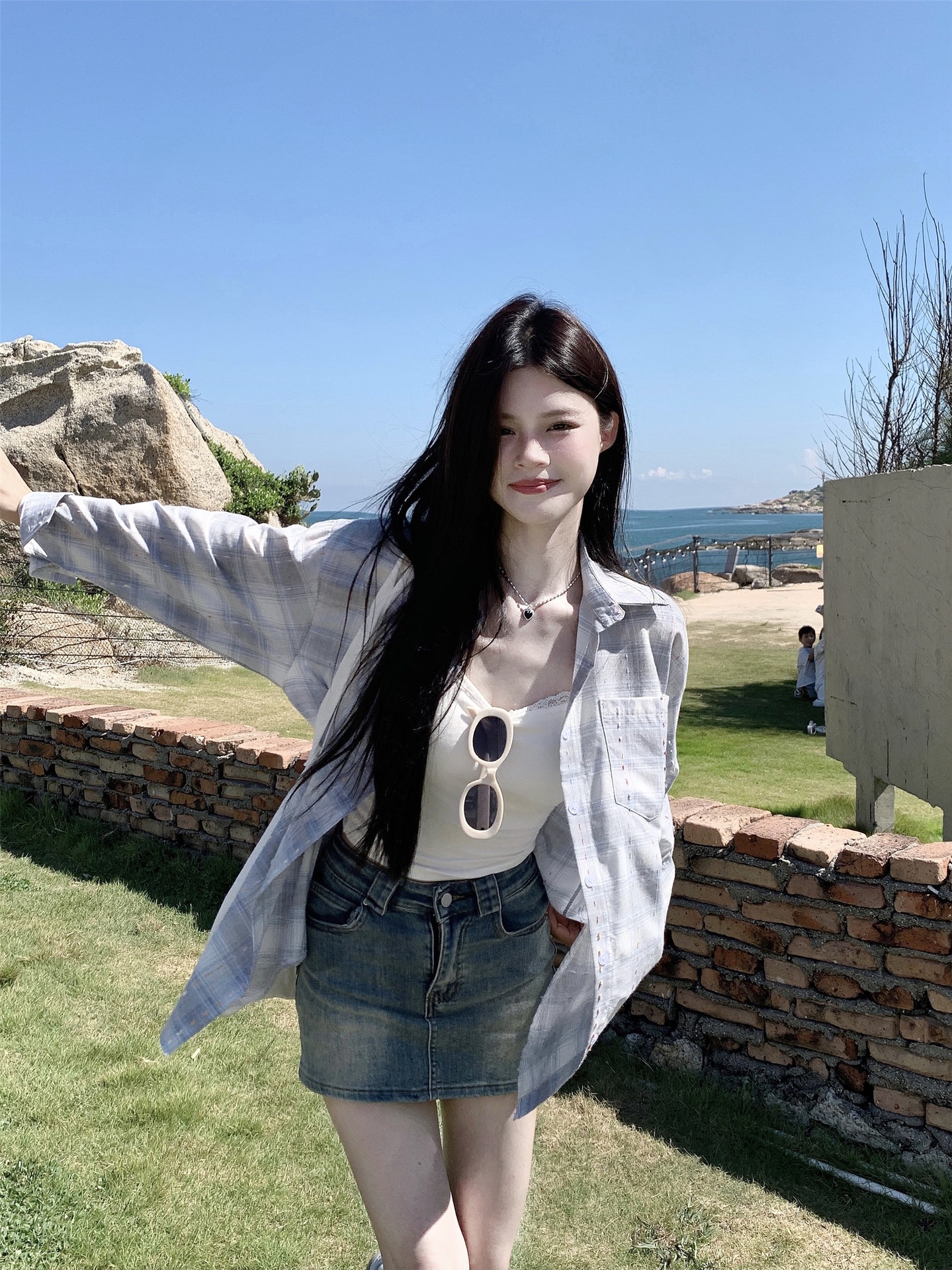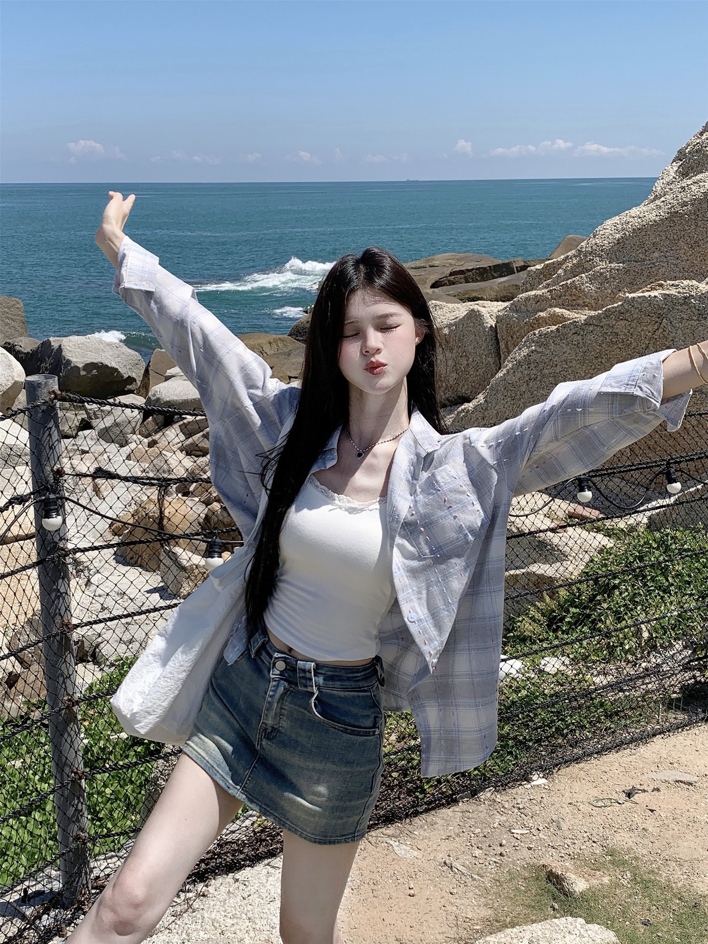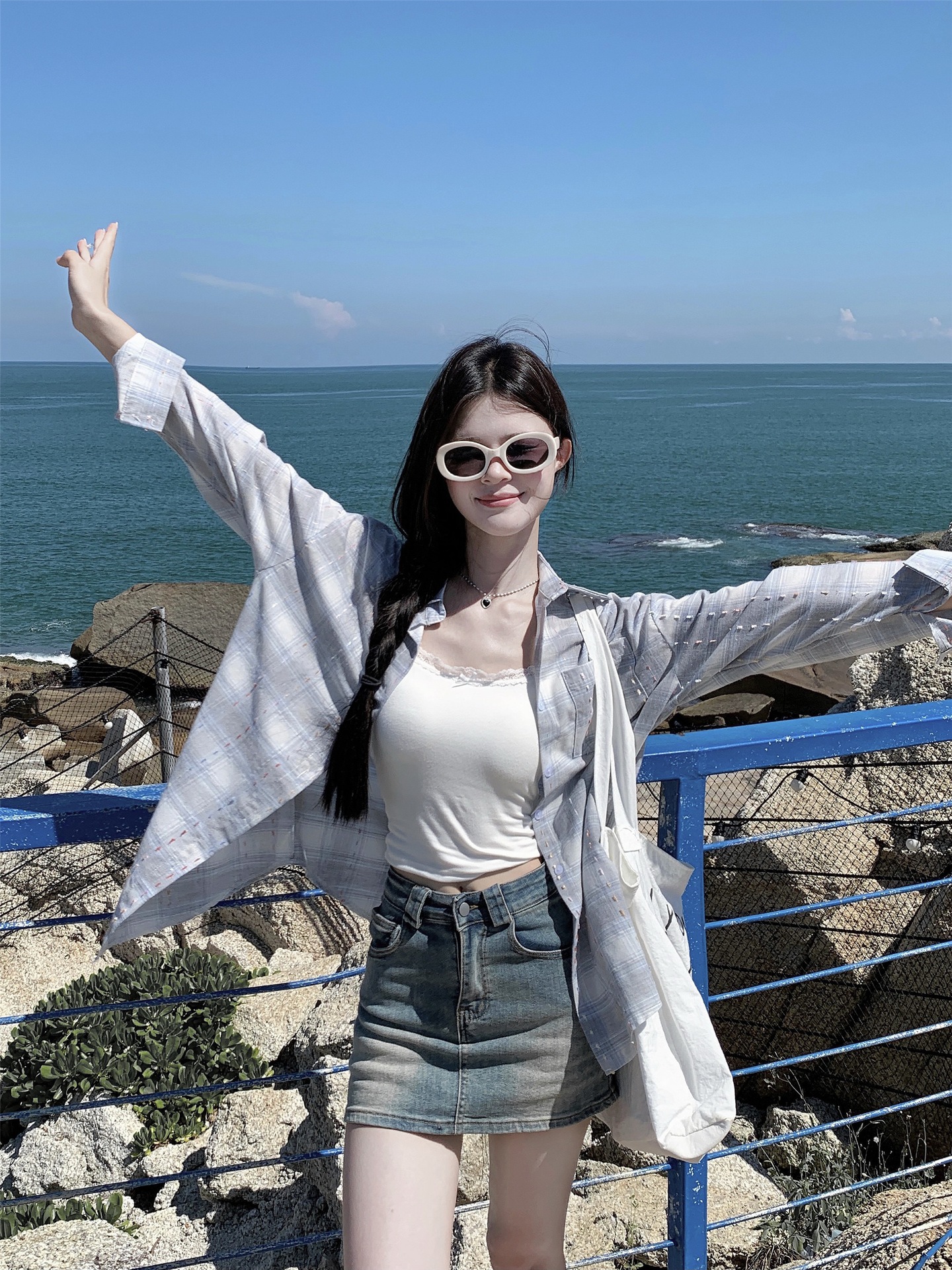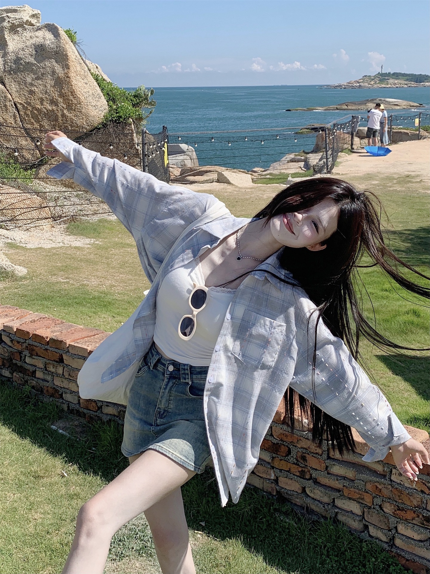폴로 칼라 플레이드 긴 소매 셔츠 여성의 봄과 가을 새로운 느슨한 중간 길이의 하이 엔드 선 스크린 셔츠 올 매치 탑스토어 가기