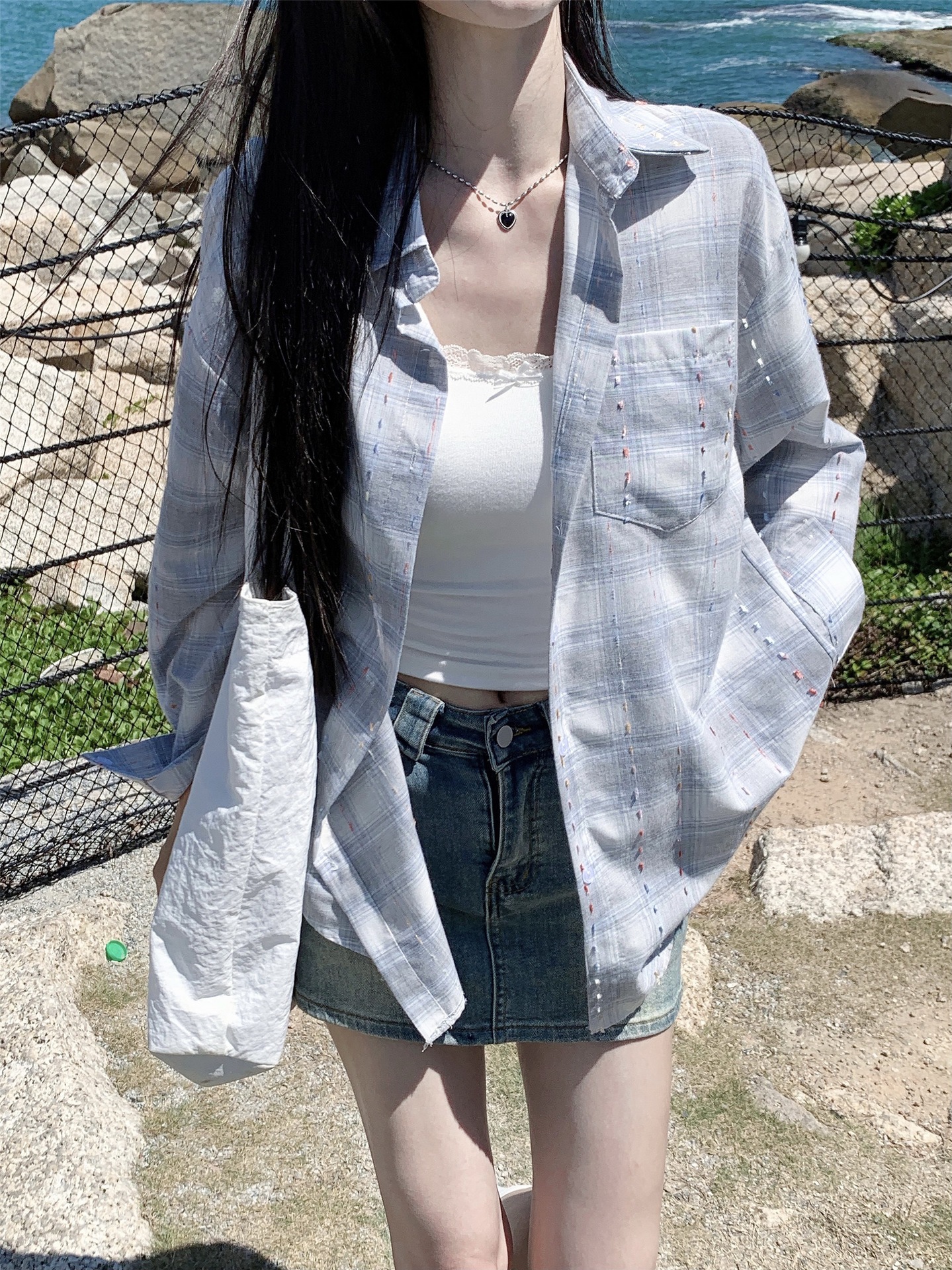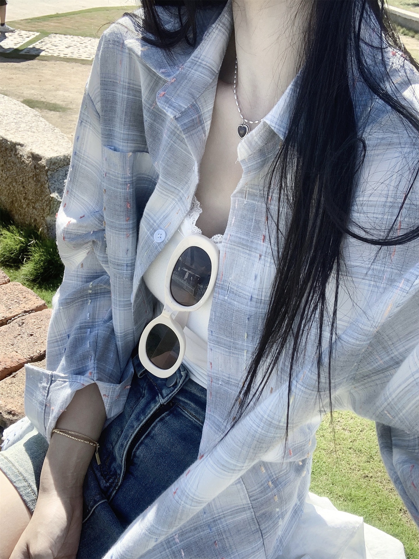 폴로 칼라 플레이드 긴 소매 셔츠 여성의 봄과 가을 새로운 느슨한 중간 길이의 하이 엔드 선 스크린 셔츠 올 매치 탑