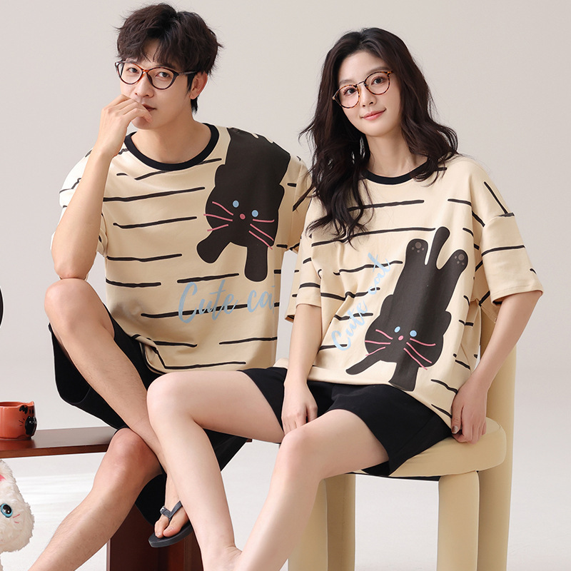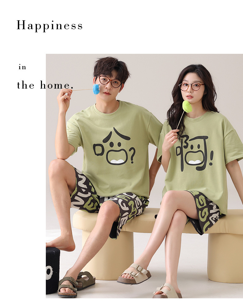 Ins 스타일 만화 반팔 반바지 커플 잠옷 여름 십대 여성 및 남성 느슨한 캐주얼 홈 옷스토어 가기