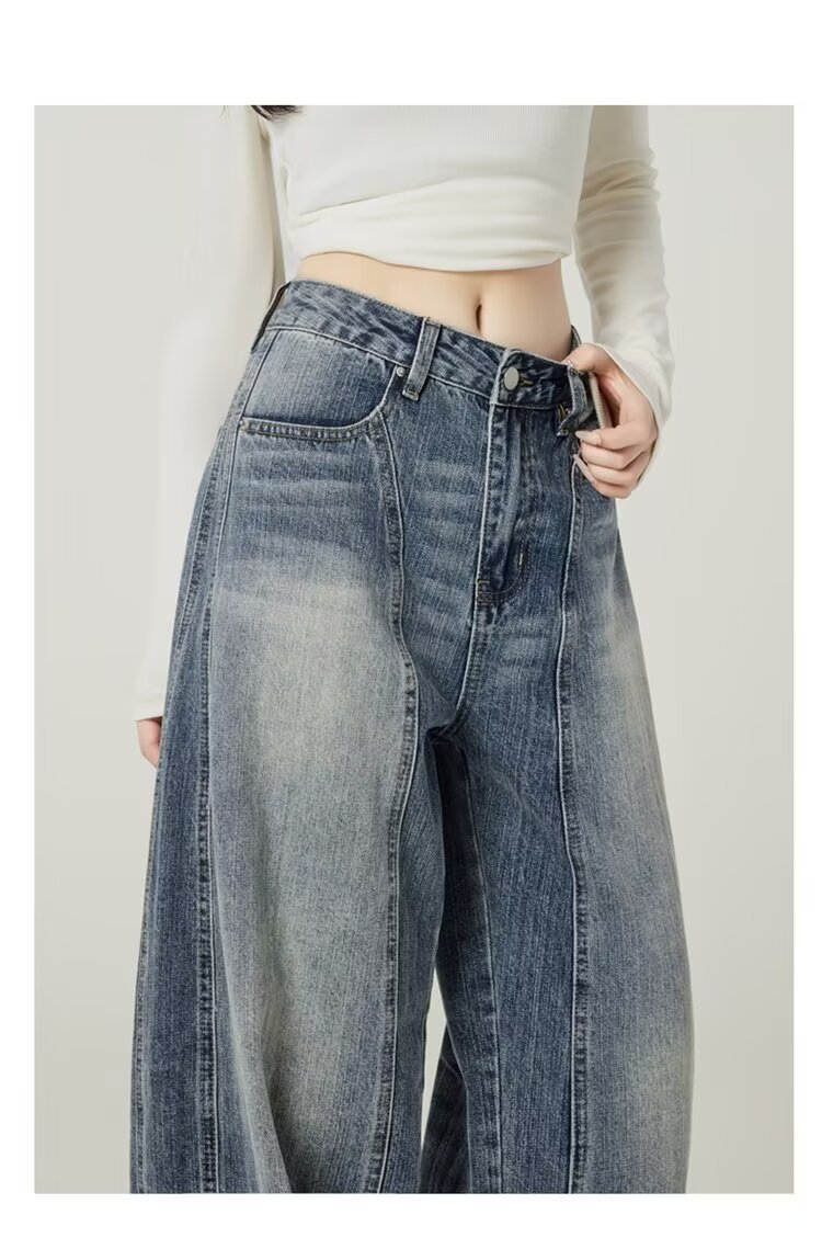 아메리칸 스타일 레트로 높은 허리 넓은 다리 청바지 여성의 2025 봄 새로운 느슨한 슬림 낫 바지