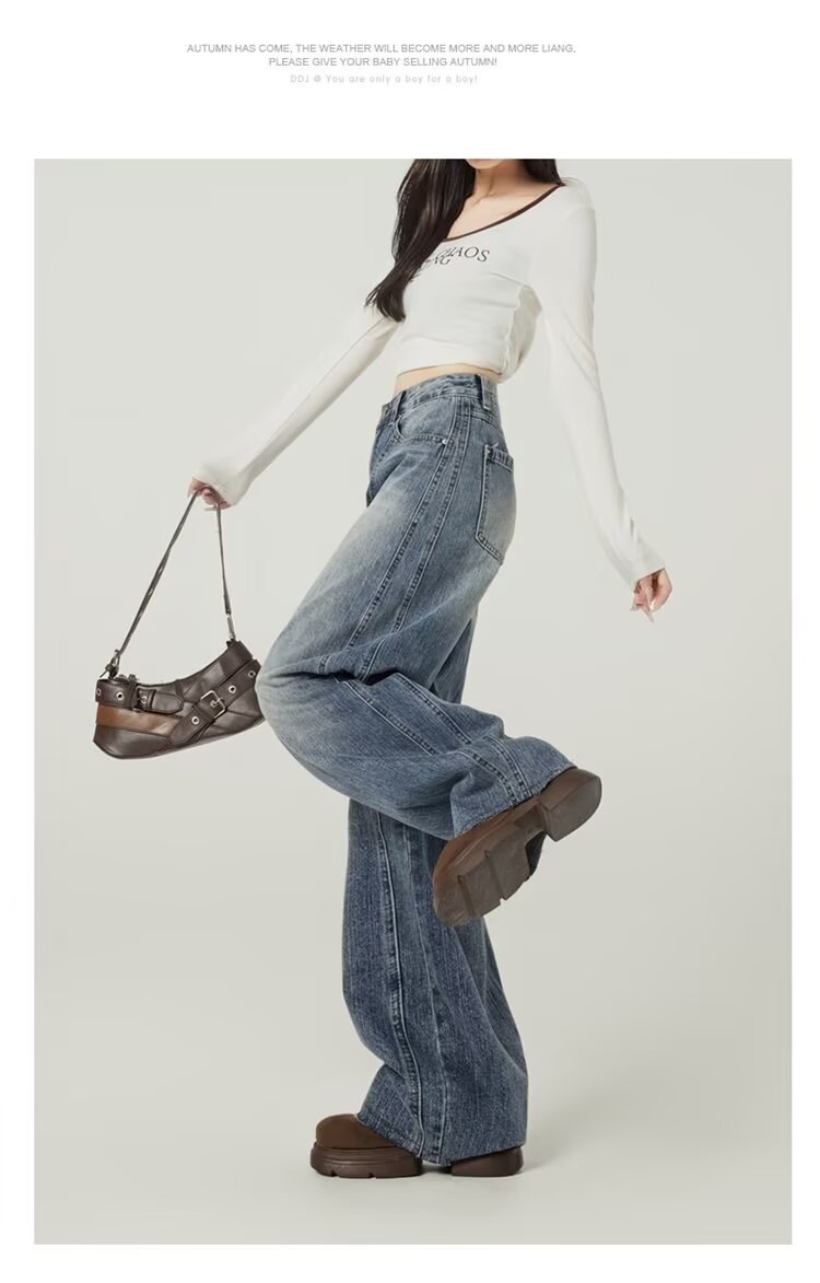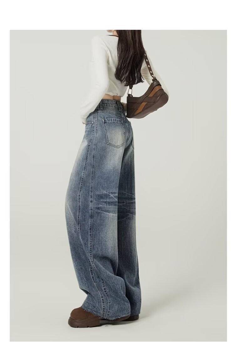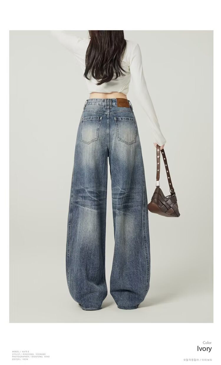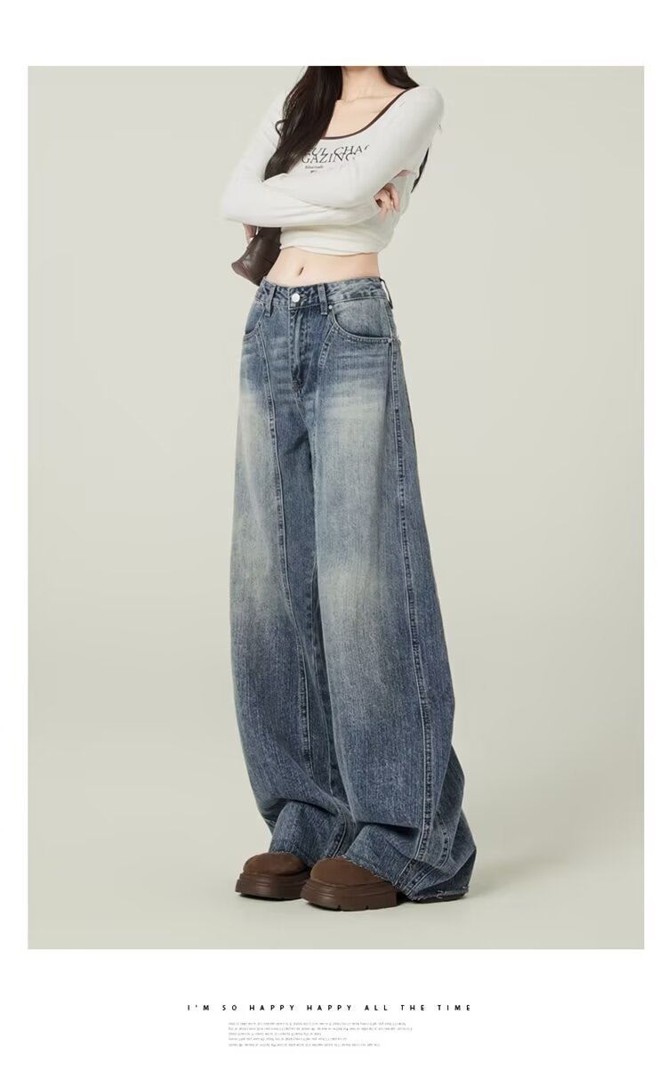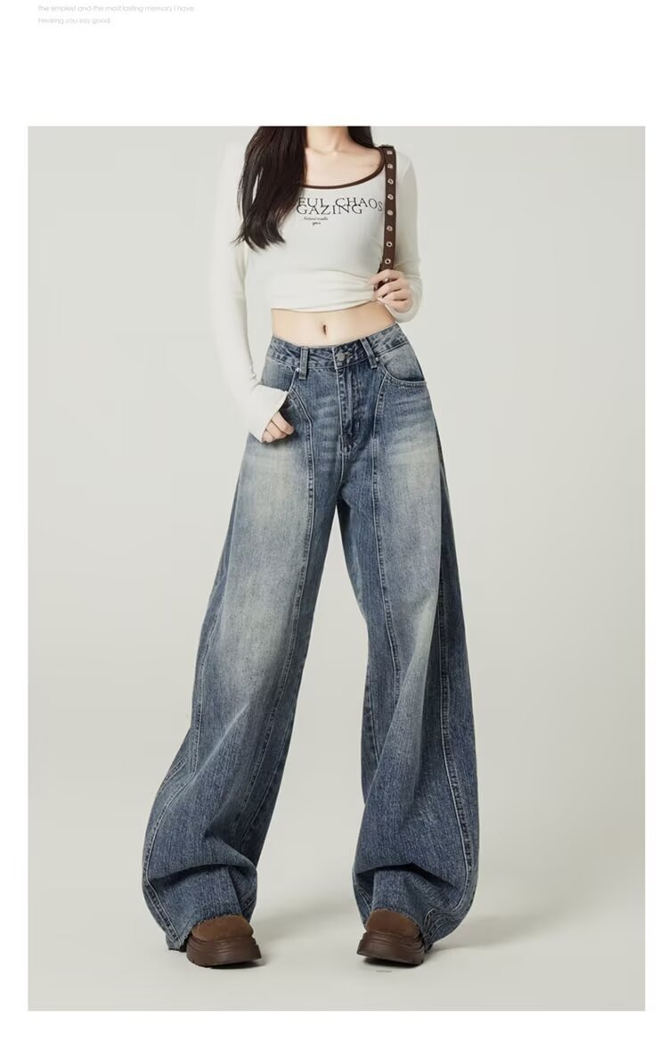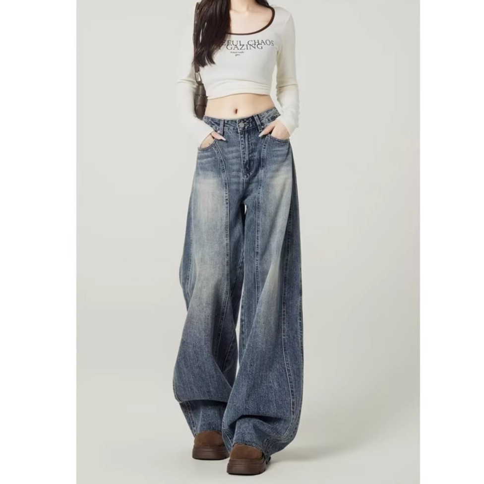 아메리칸 스타일 레트로 높은 허리 넓은 다리 청바지 여성의 2025 봄 새로운 느슨한 슬림 낫 바지스토어 가기