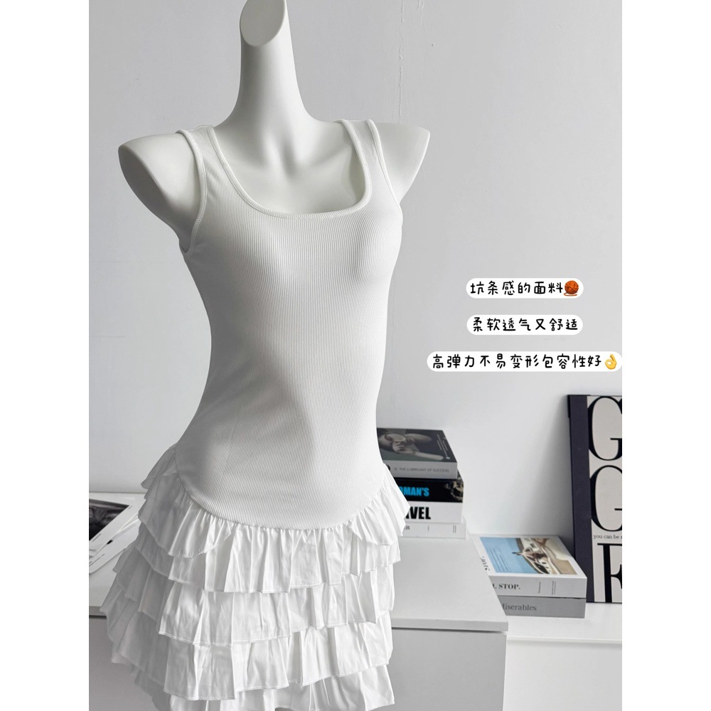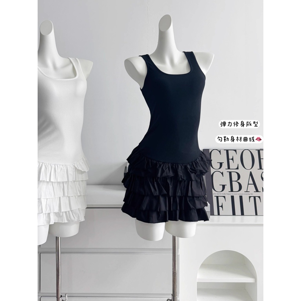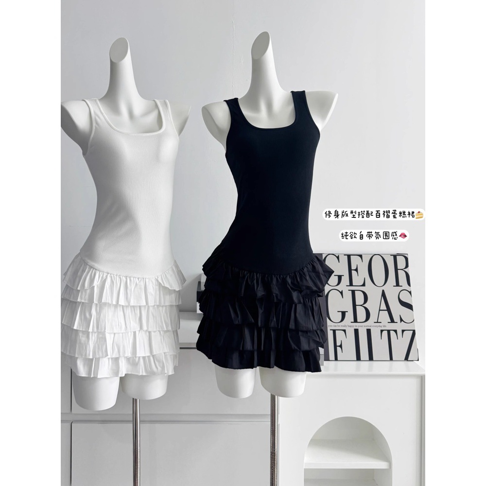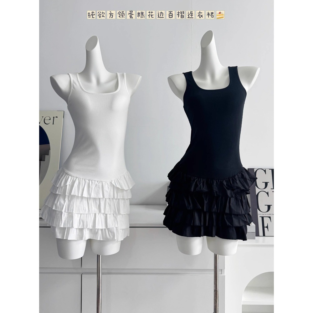 화이트 스퀘어 칼라 슬링 원피스 여성의 봄 새로운 슬림 핏 케이크 스커트 소녀의 웨이스트 니트 스커트 여름 여성 스커트스토어 가기