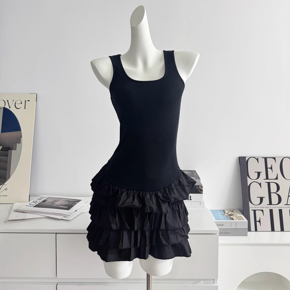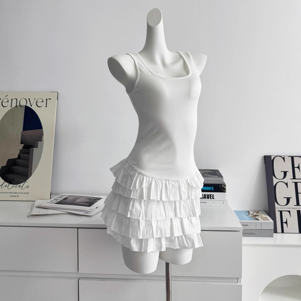 화이트 스퀘어 칼라 슬링 원피스 여성의 봄 새로운 슬림 핏 케이크 스커트 소녀의 웨이스트 니트 스커트 여름 여성 스커트