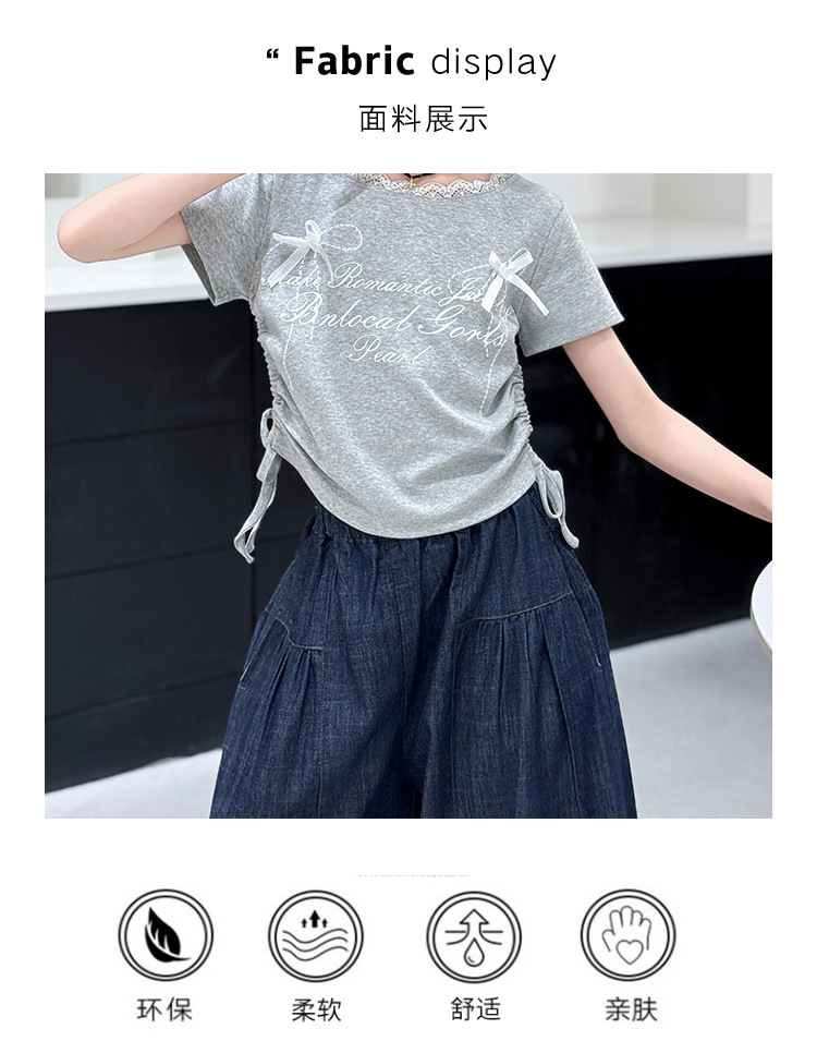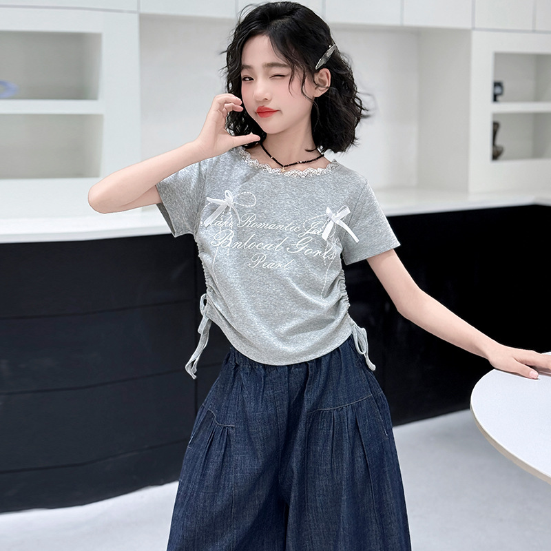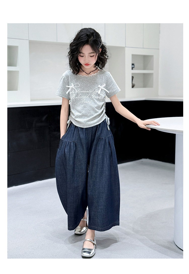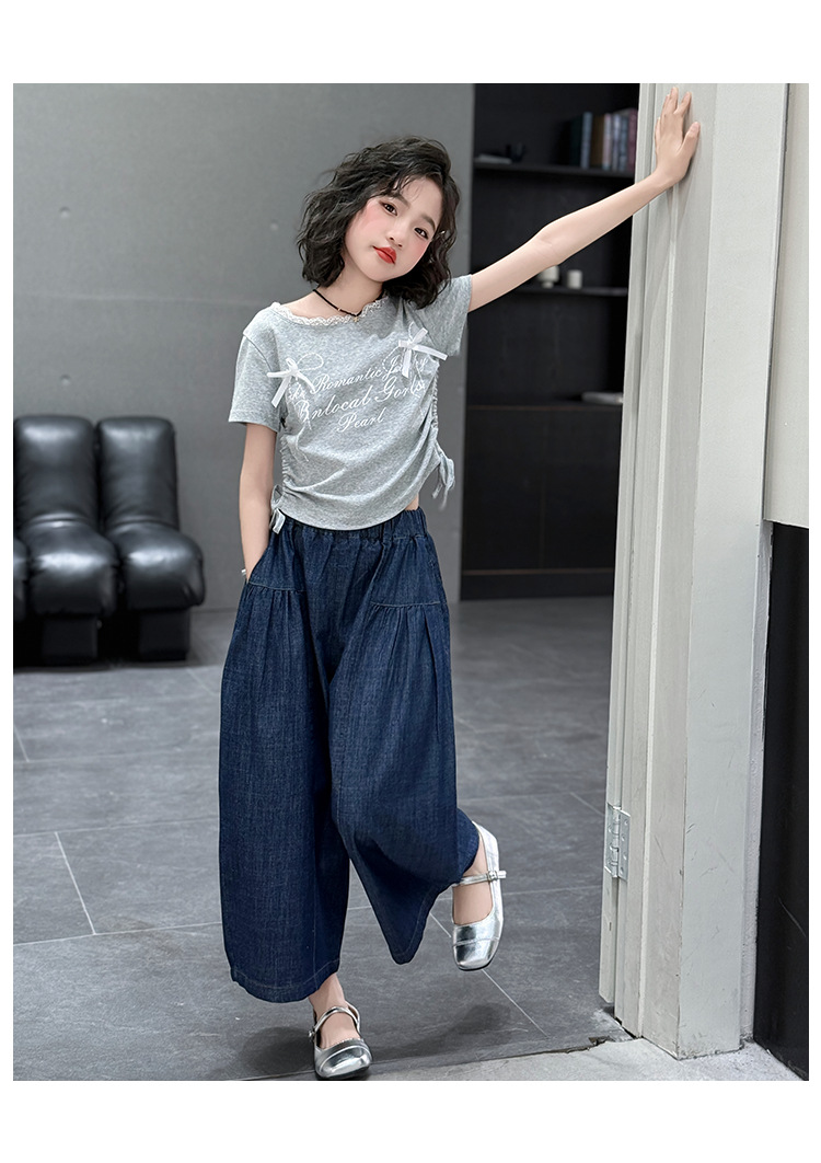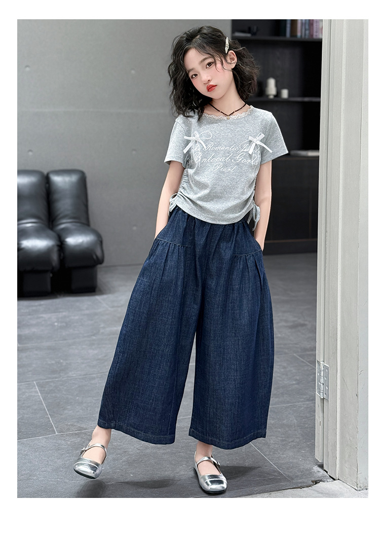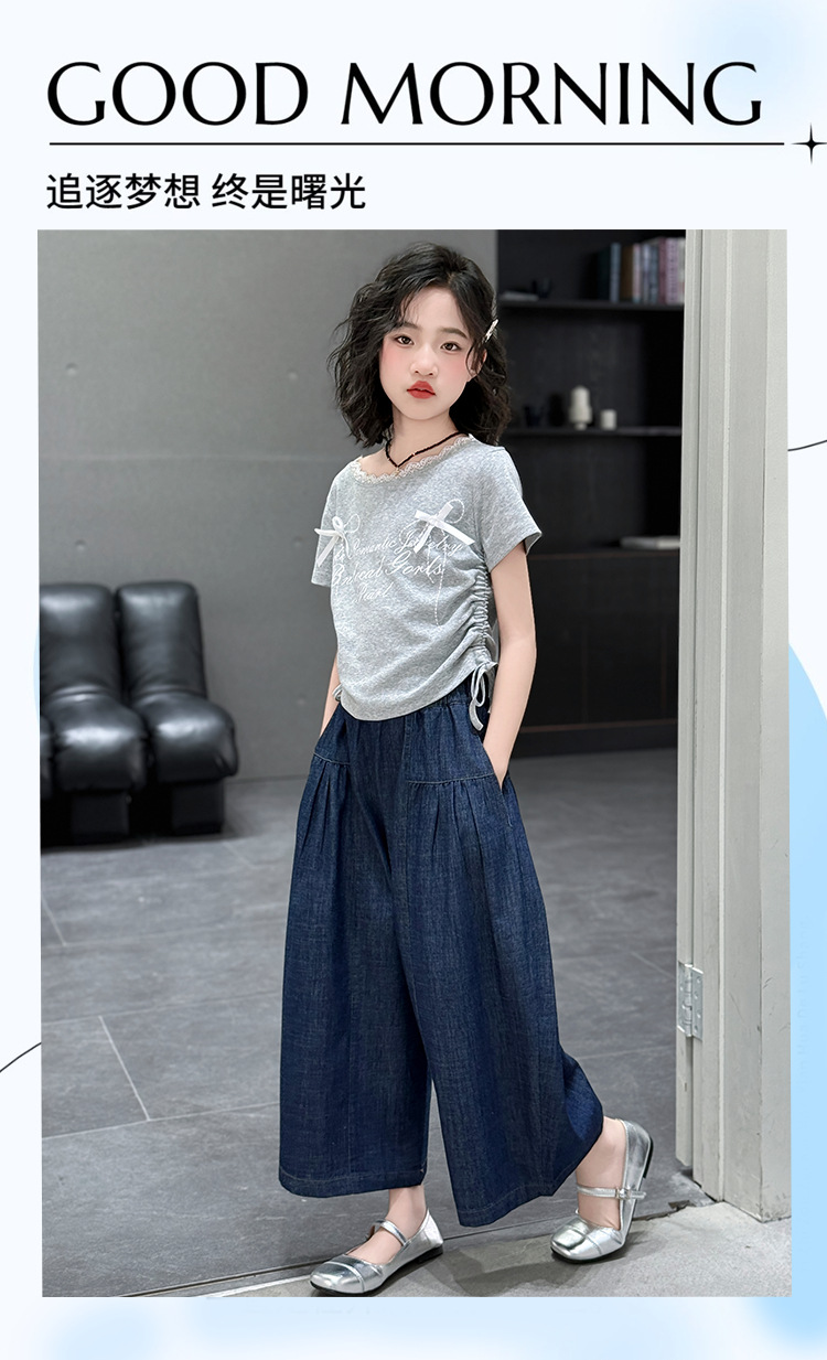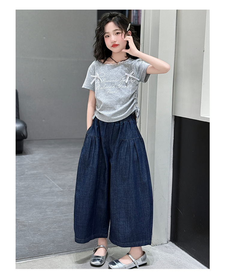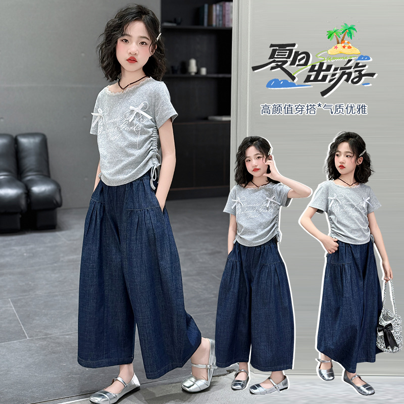 여자 여름 세트 2025 새로운 여자 서양식 순면 반팔 중대형 어린이 스티칭 티셔츠 데님 넓은 다리 바지