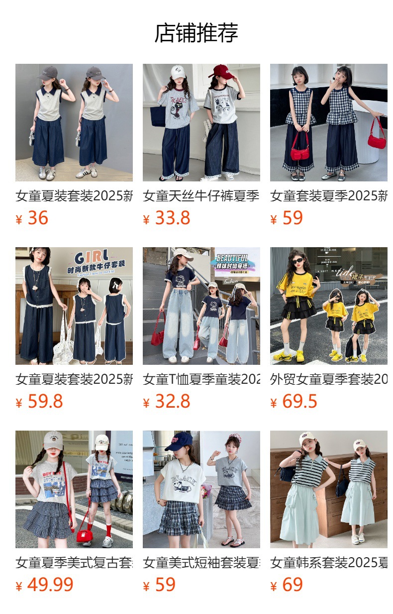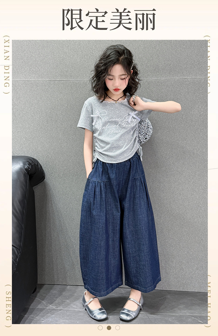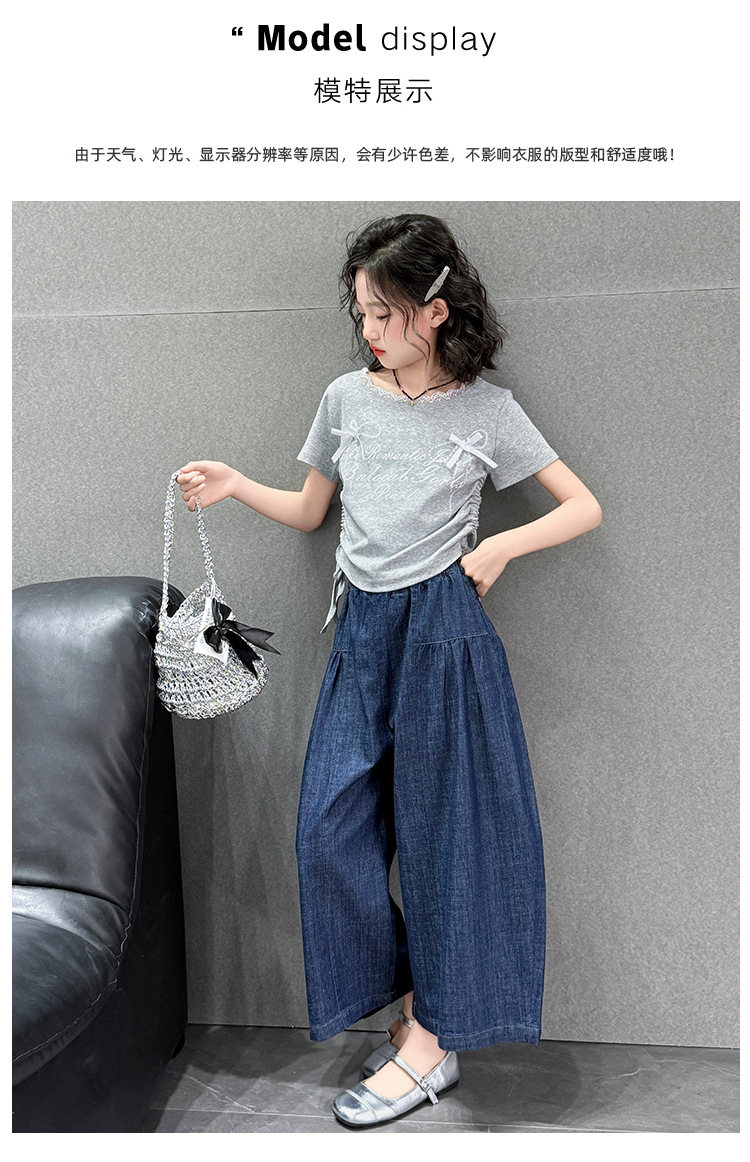 여자 여름 세트 2025 새로운 여자 서양식 순면 반팔 중대형 어린이 스티칭 티셔츠 데님 넓은 다리 바지스토어 가기
