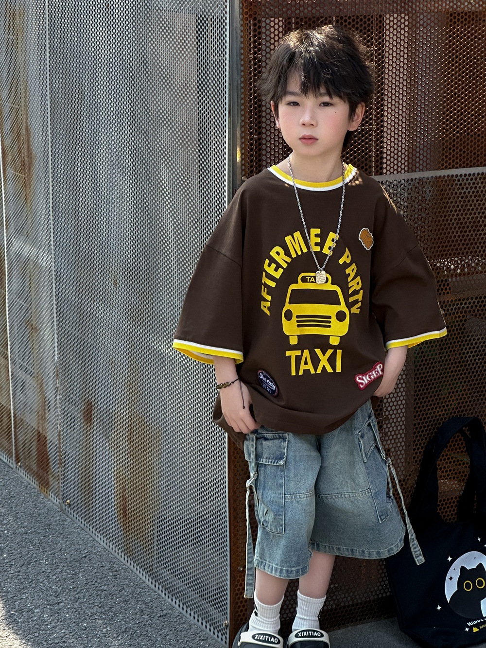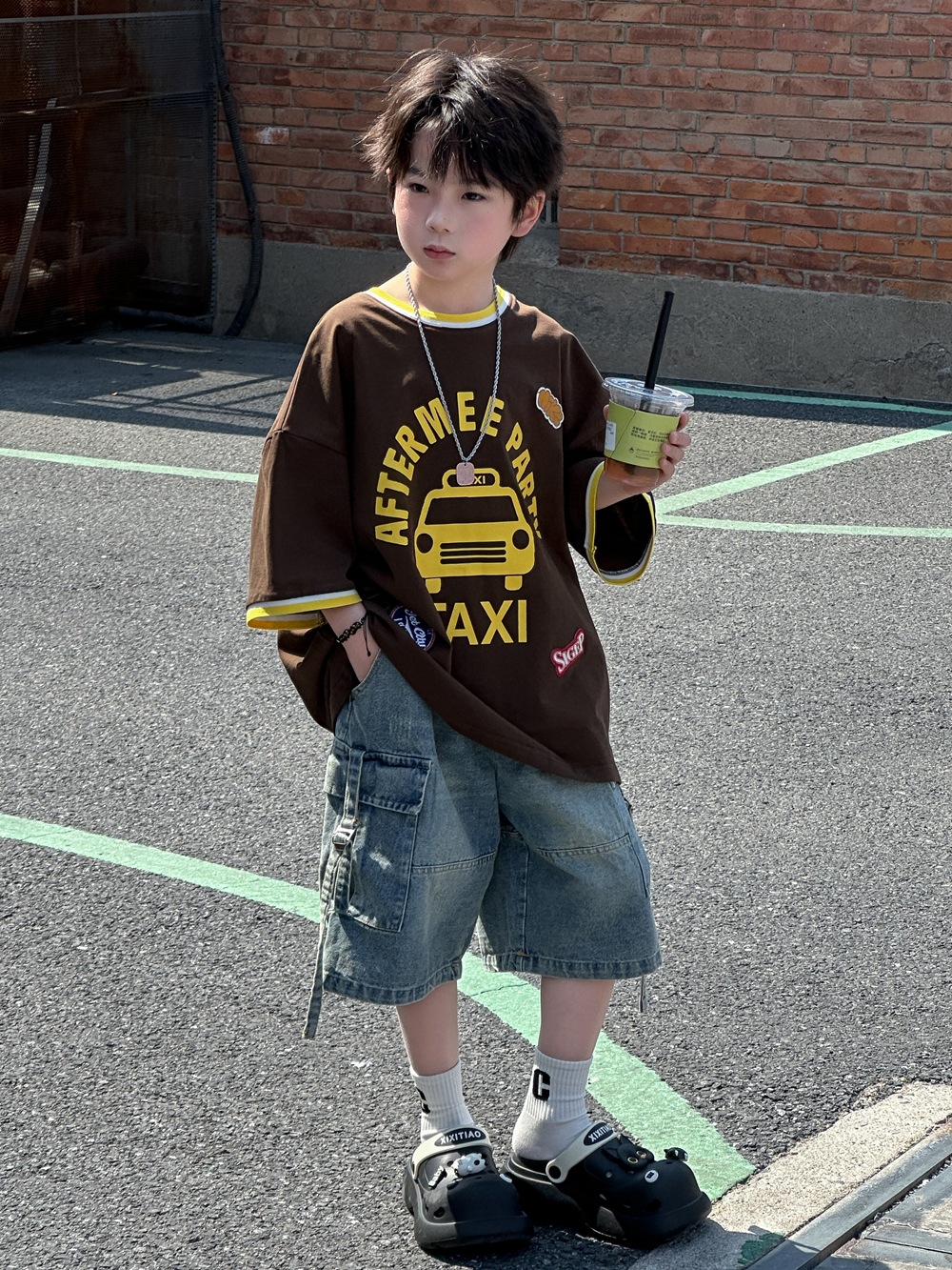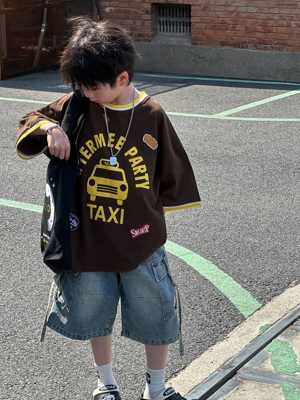 Xiner 2025 Summer New Children's Rib Label 반팔 티셔츠 코튼 보이즈 루즈 올 매치 톱 T스토어 가기