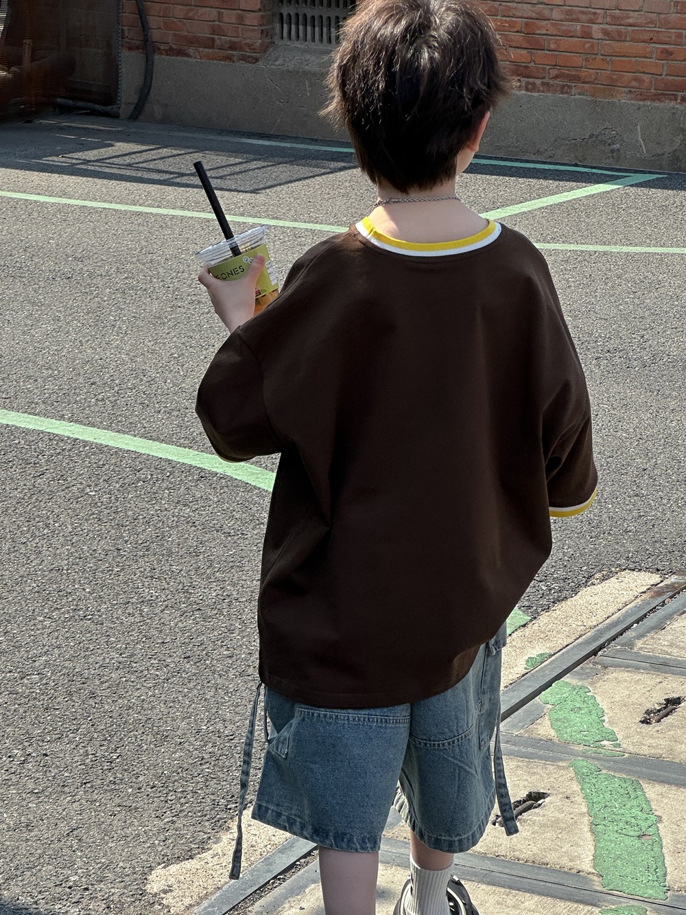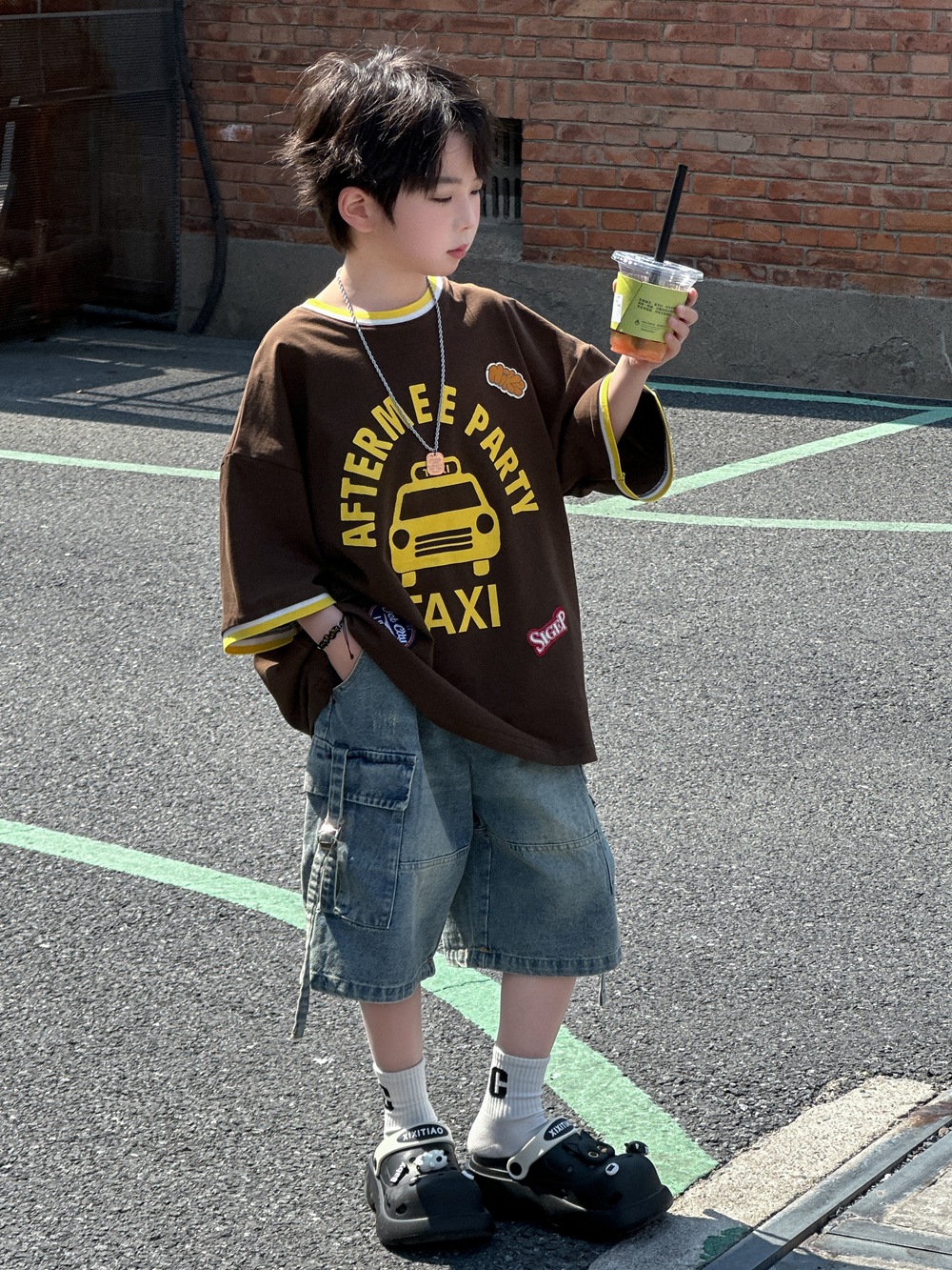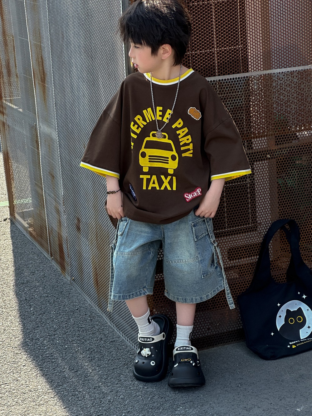 Xiner 2025 Summer New Children's Rib Label 반팔 티셔츠 코튼 보이즈 루즈 올 매치 톱 T스토어 가기