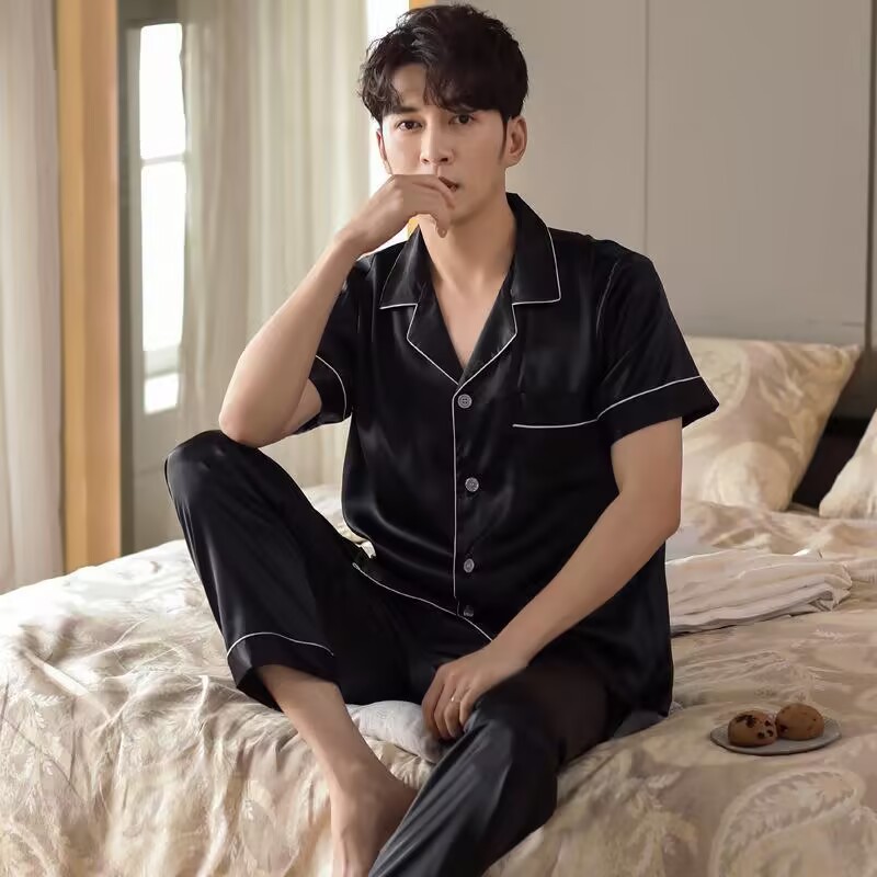 플러스 사이즈 아이스 실크 파자마 남자 봄과 여름 반팔 바지 얇은 세트 대외 무역 한국 스타일 느슨한 홈 옷