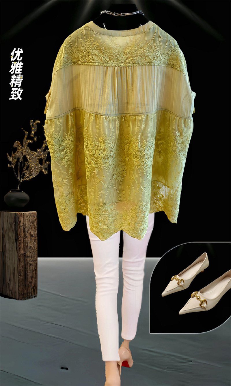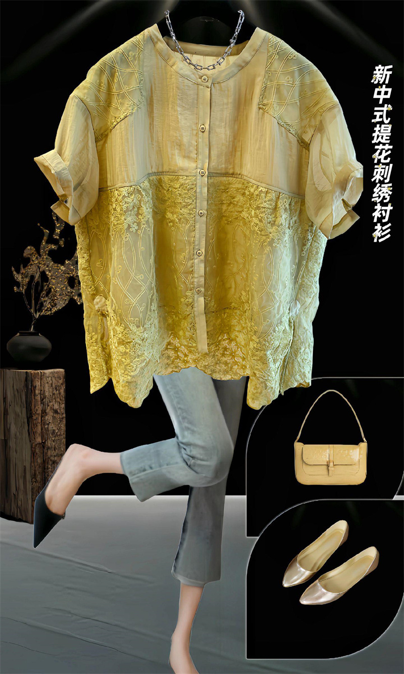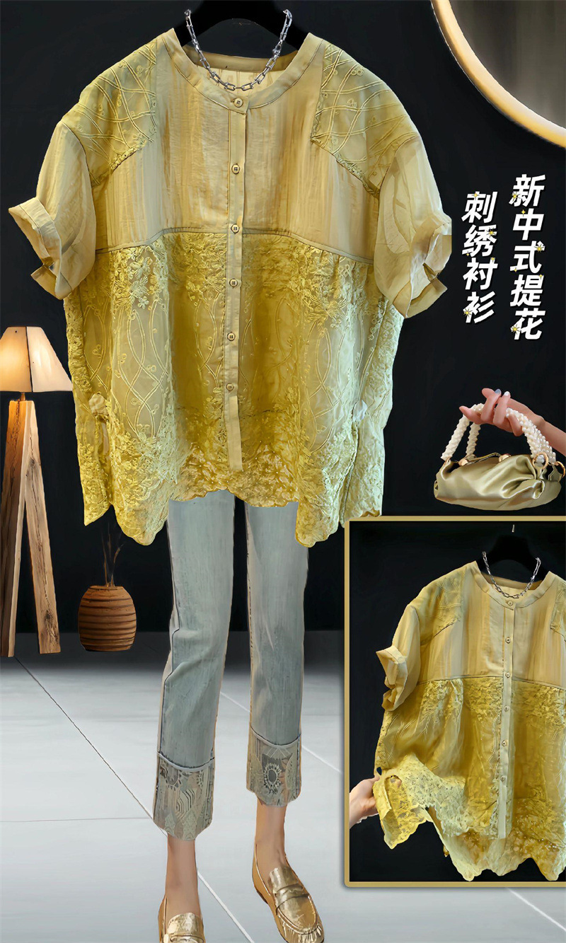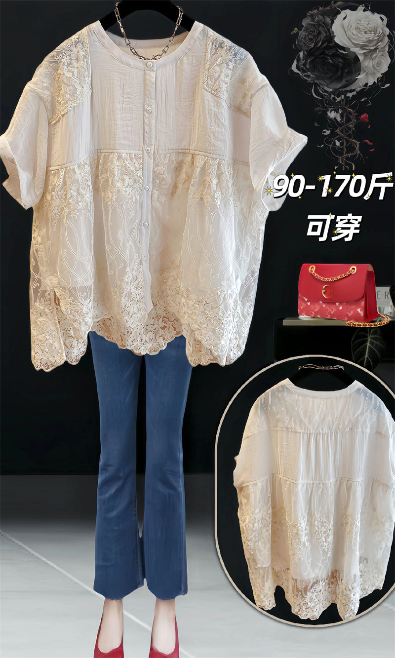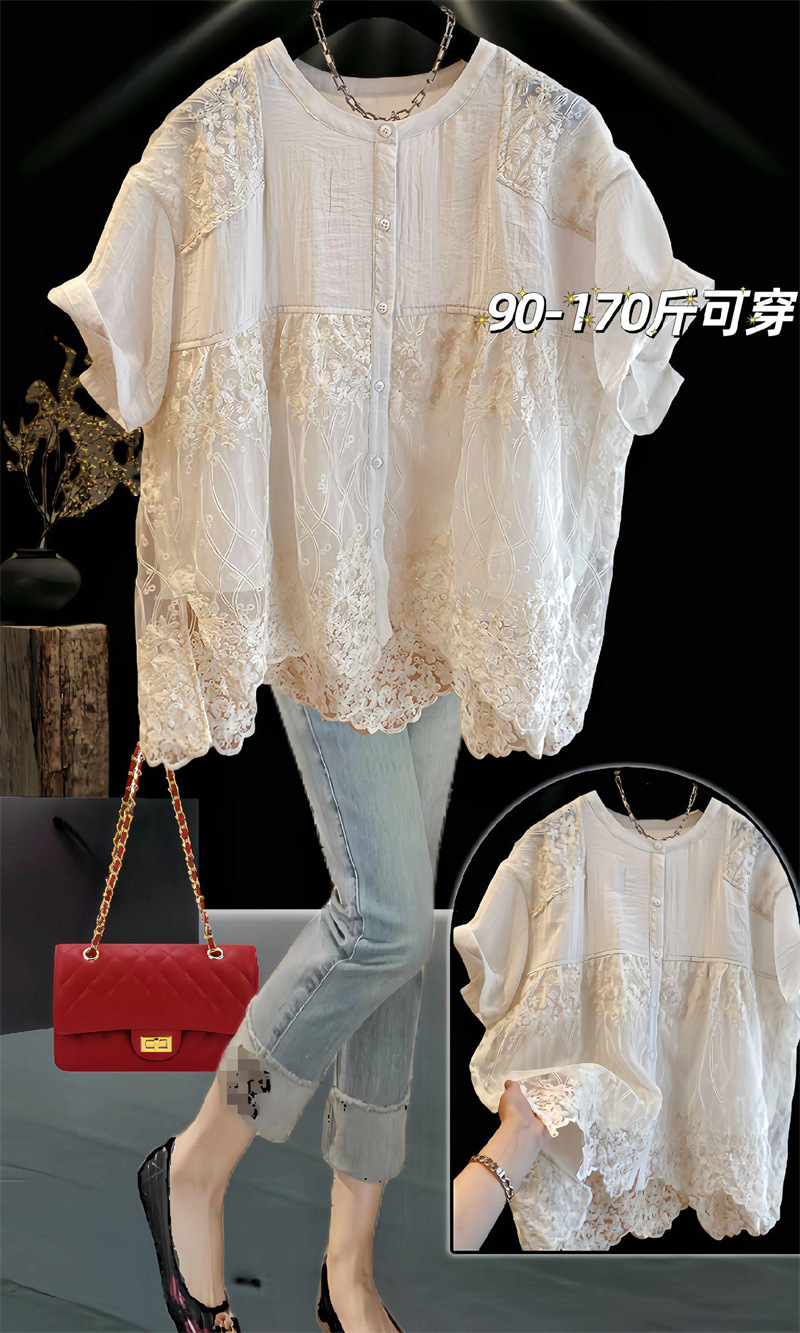 여름 하이 엔드 센스 새로운 중국 스타일 자카드 통통녀 루즈 플러스 사이즈 올 매치를위한 라운드 넥 반팔 쉬폰 탑 자수