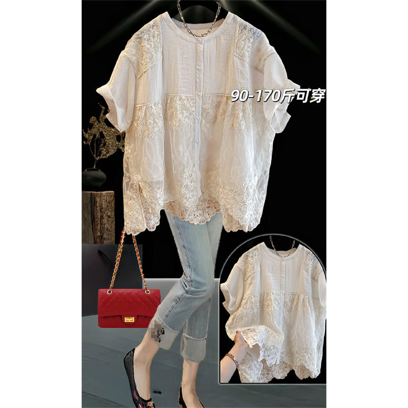 여름 하이 엔드 센스 새로운 중국 스타일 자카드 통통녀 루즈 플러스 사이즈 올 매치를위한 라운드 넥 반팔 쉬폰 탑 자수스토어 가기