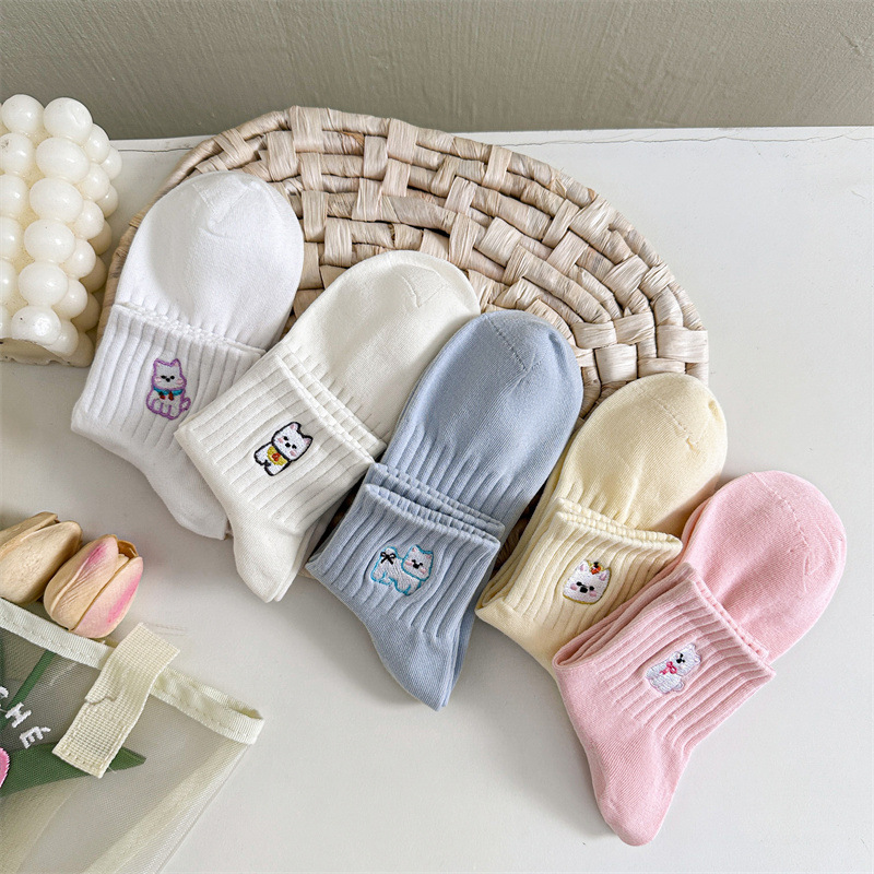 귀여운 자수 강아지 양말 여성의 다채로운 미드 양말 Ins 트렌디 한 여름 얇은 스포츠 일본 스타일 만화 양말 면화