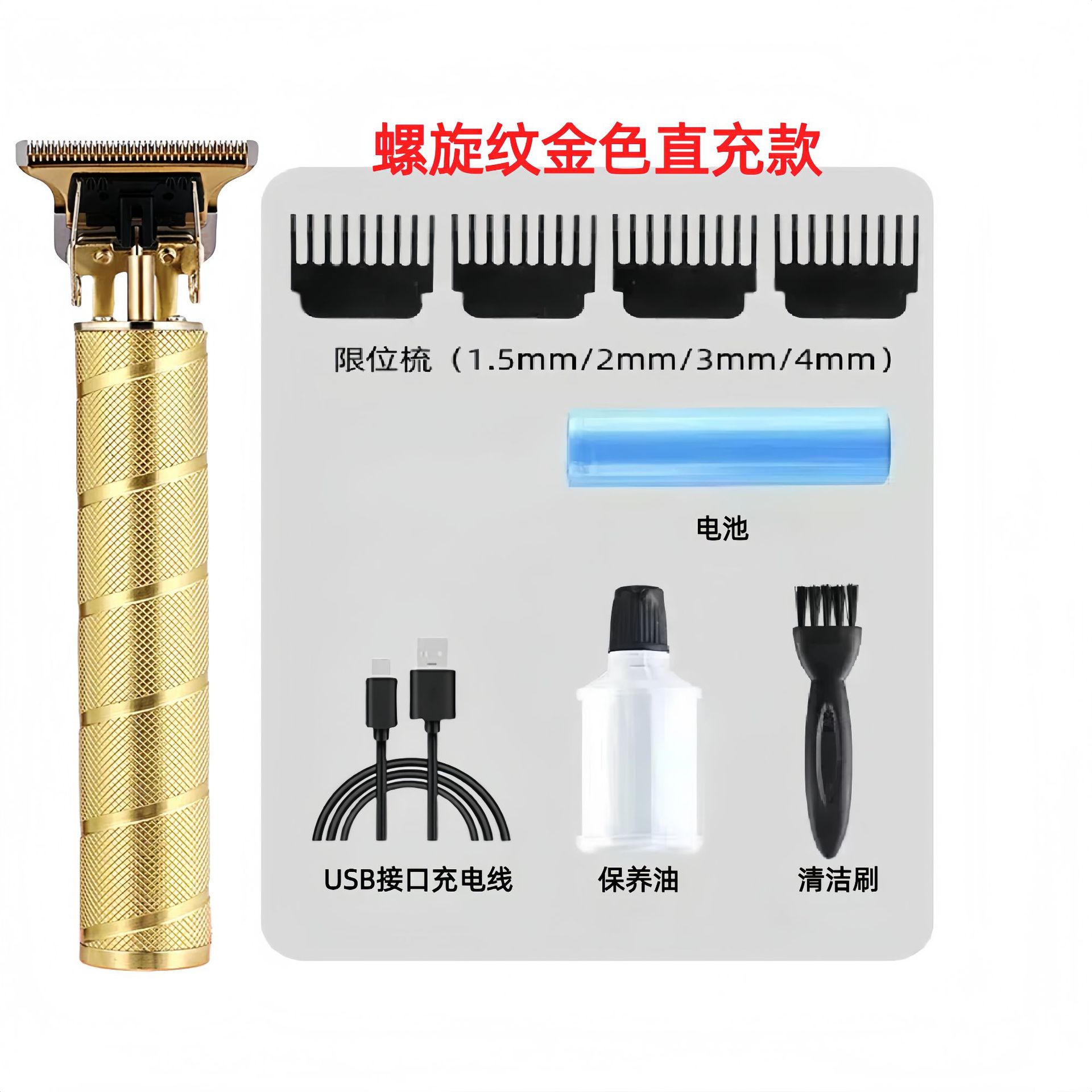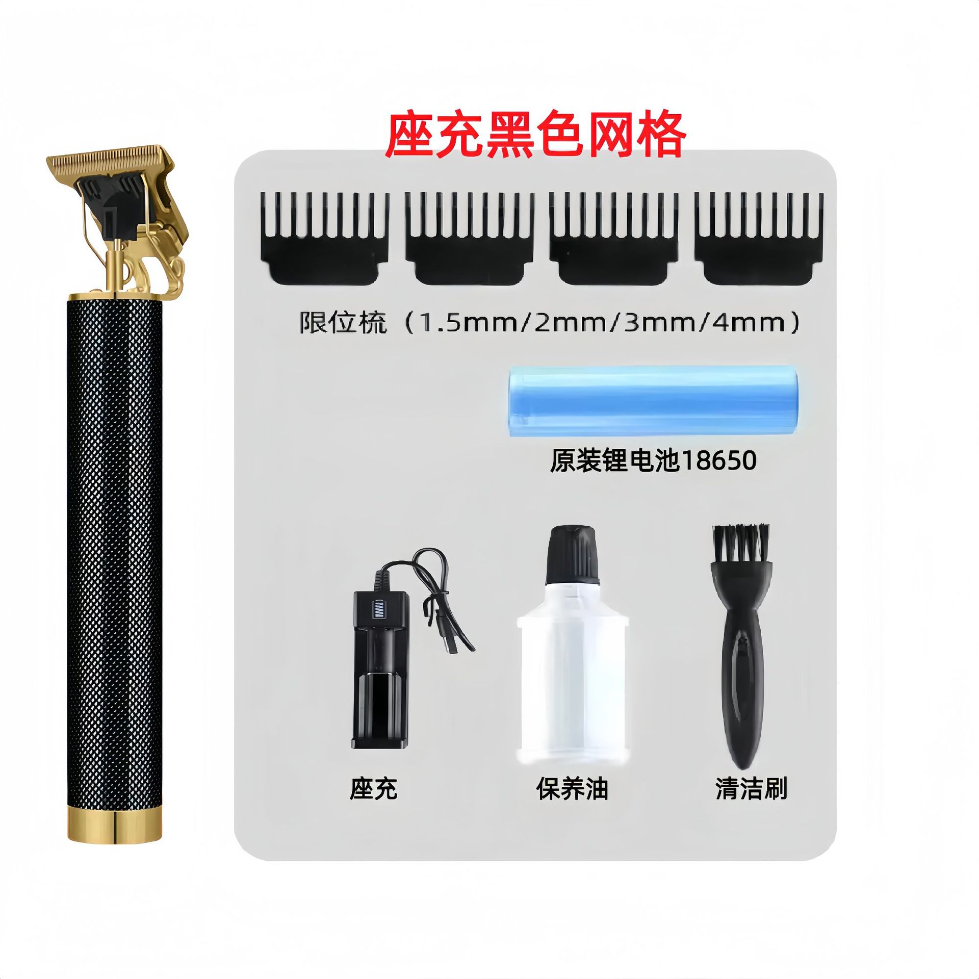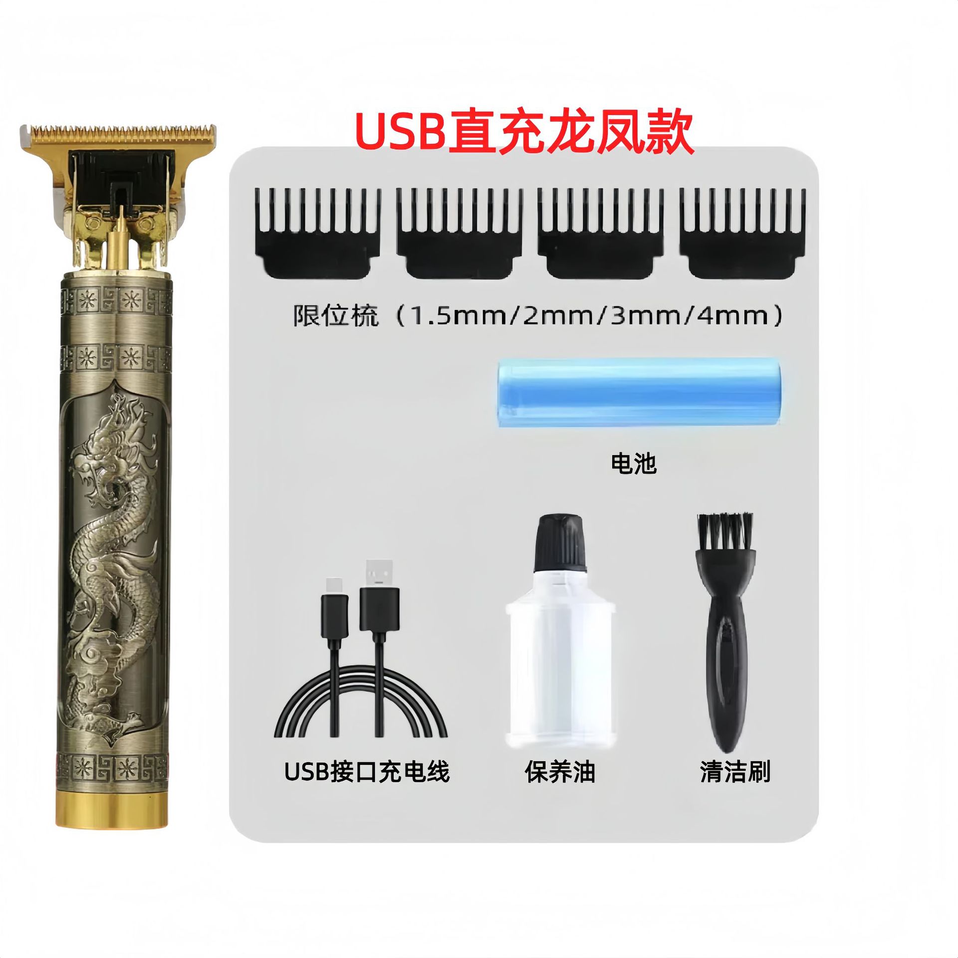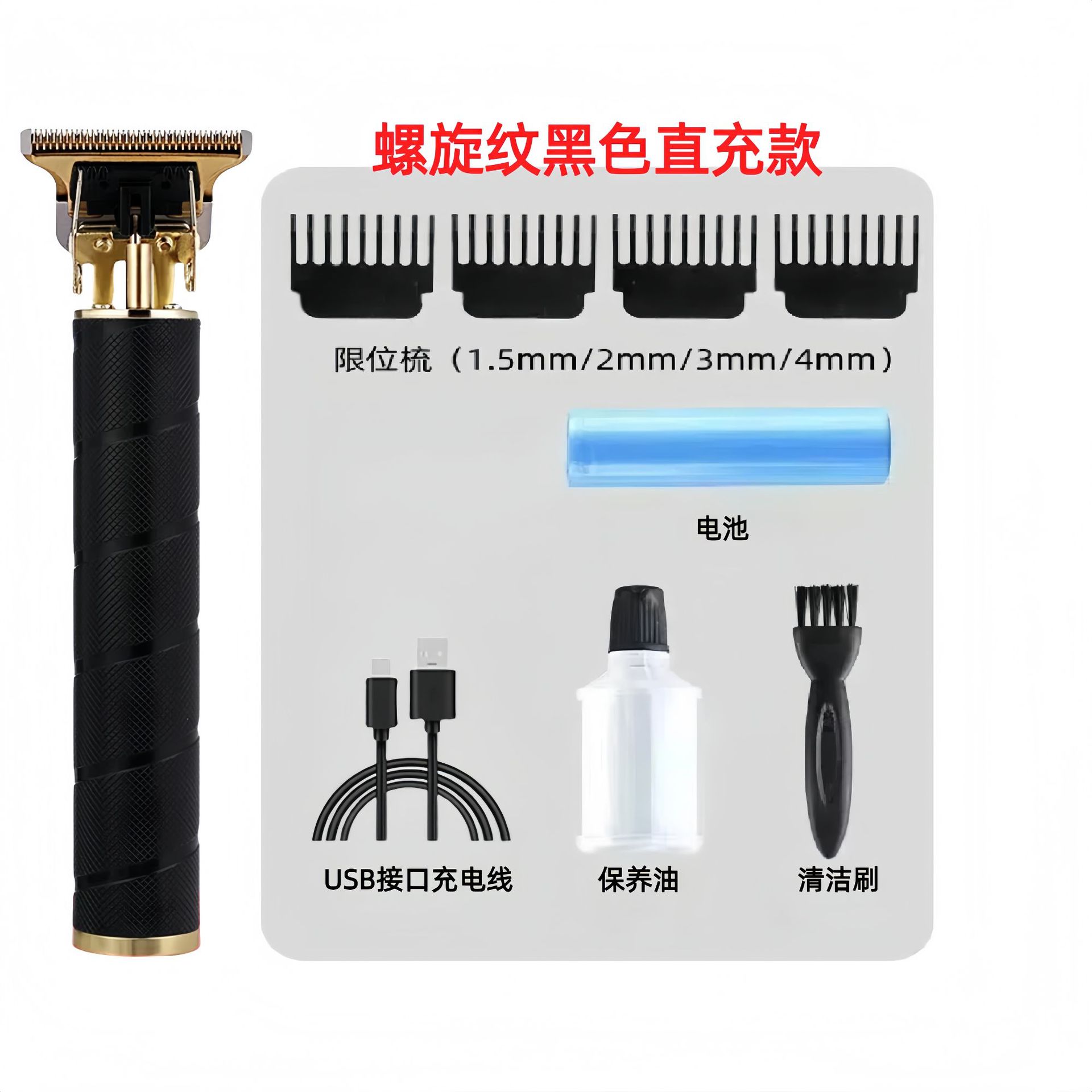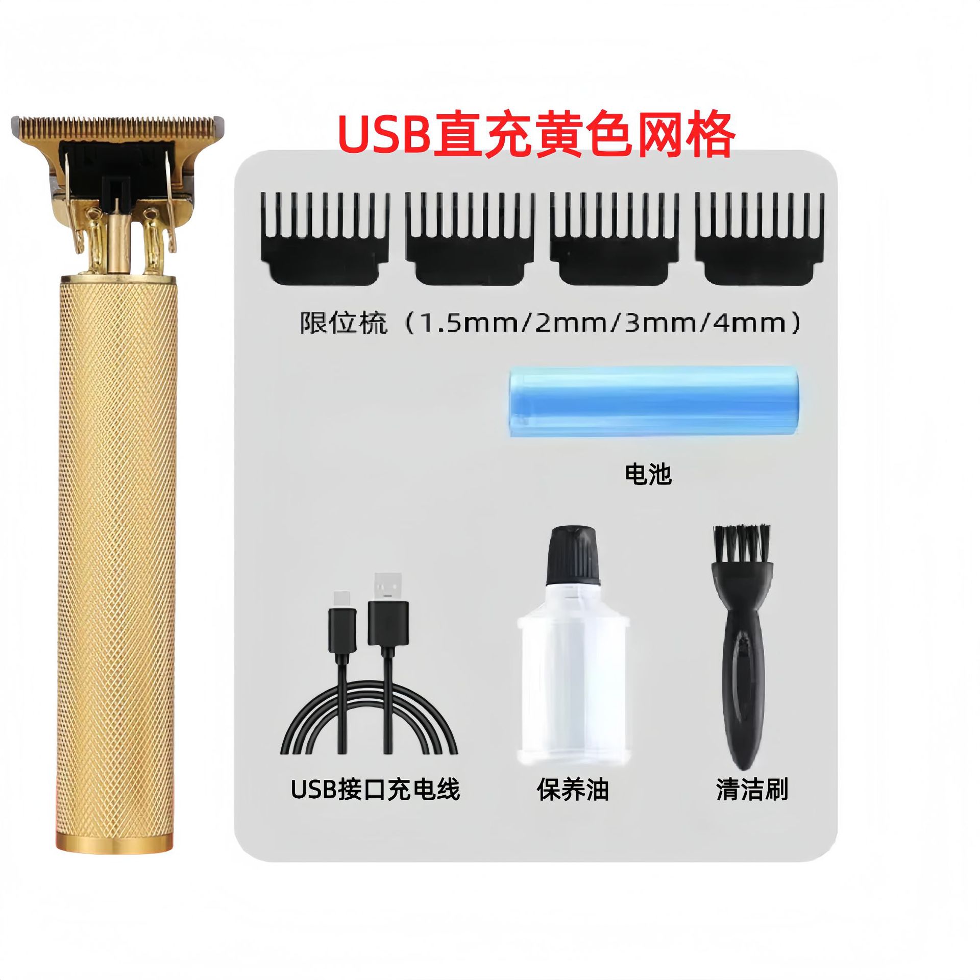 配件:电推主机.润滑油.毛刷.说明书.USB充电线.4个限位尺.彩盒
