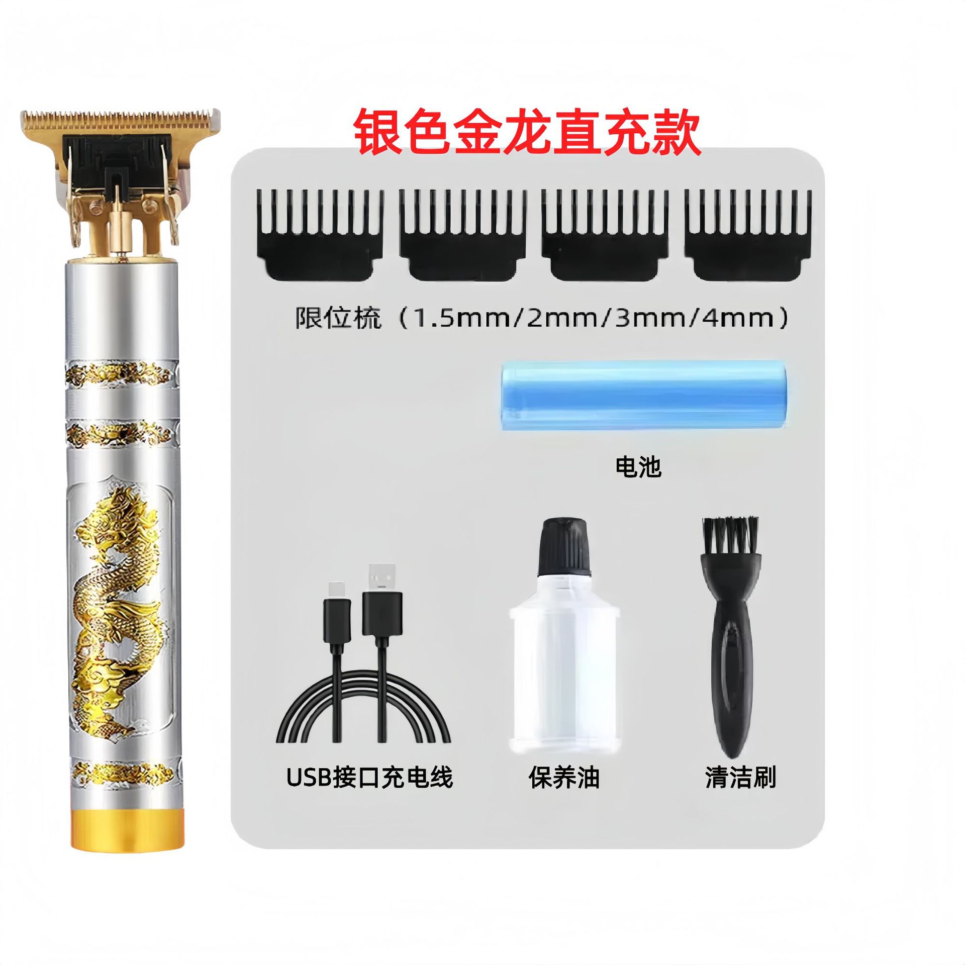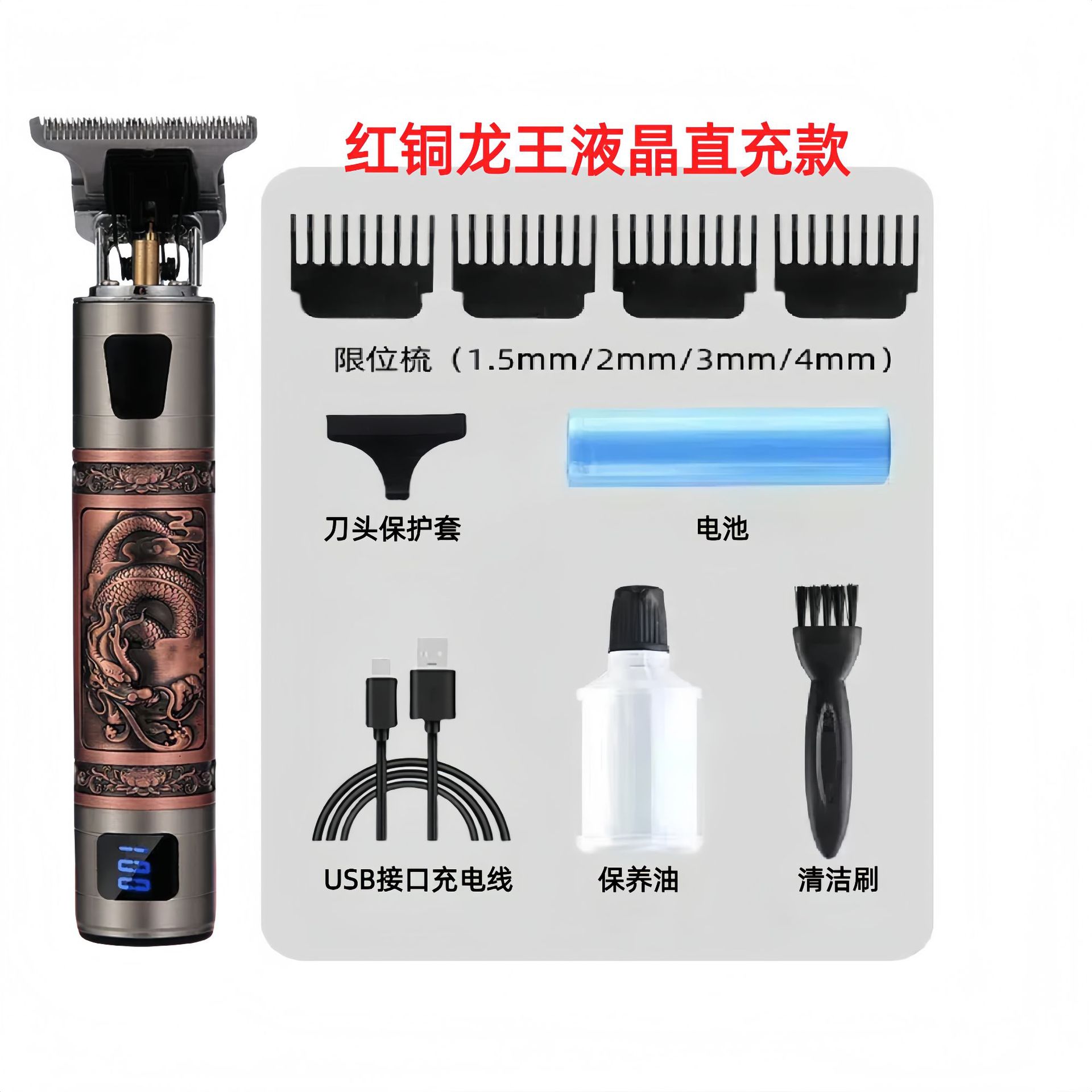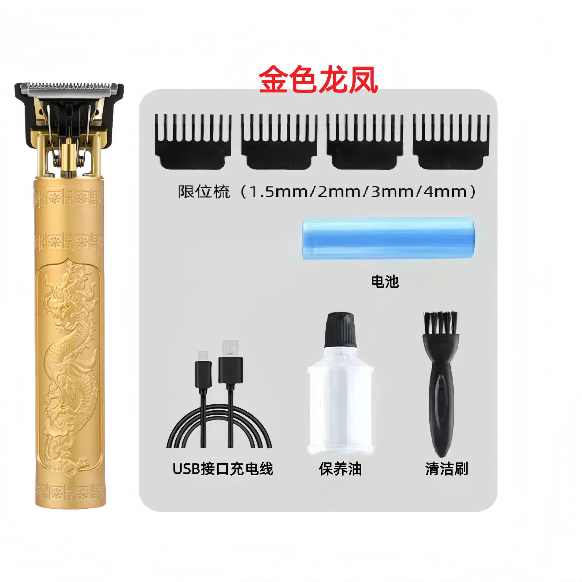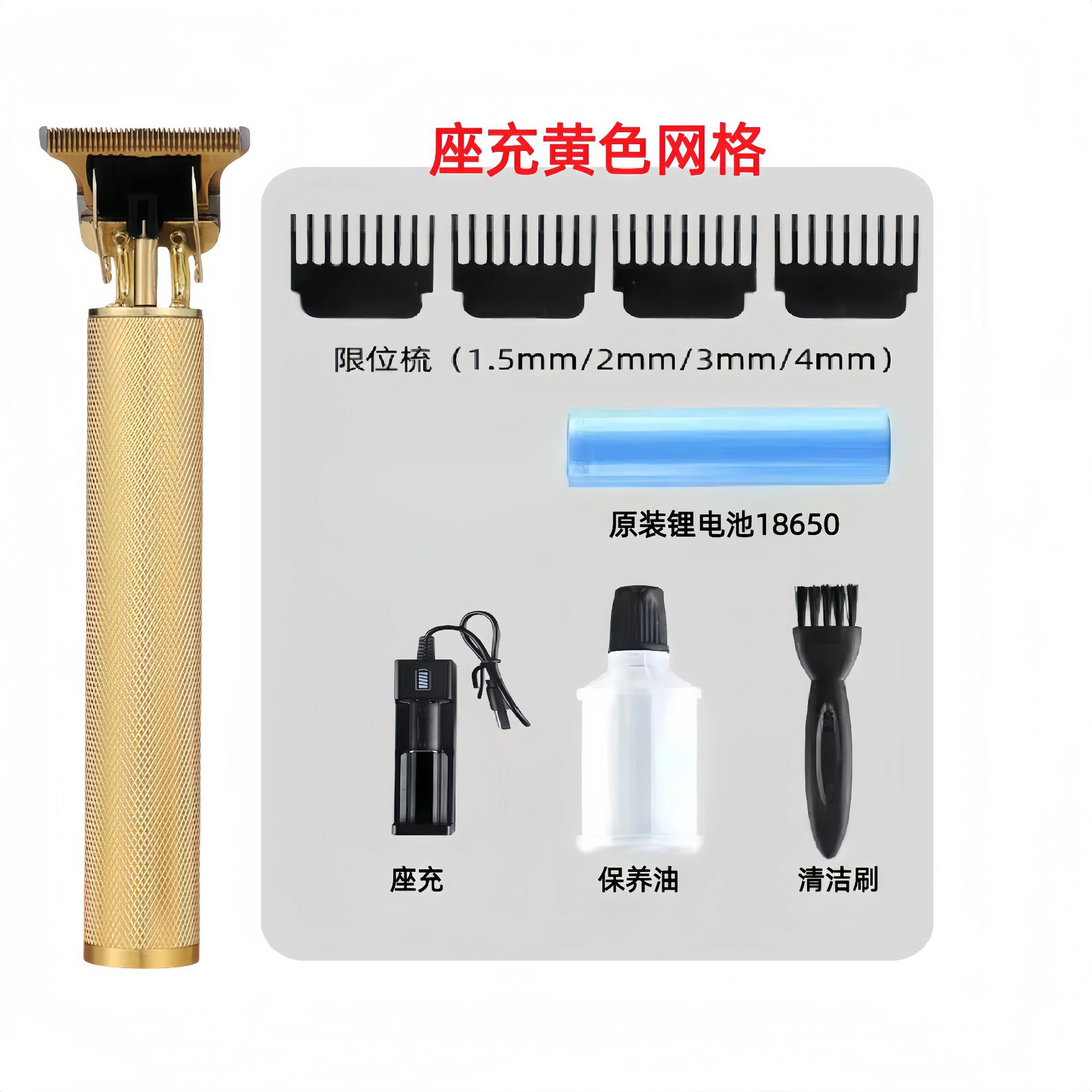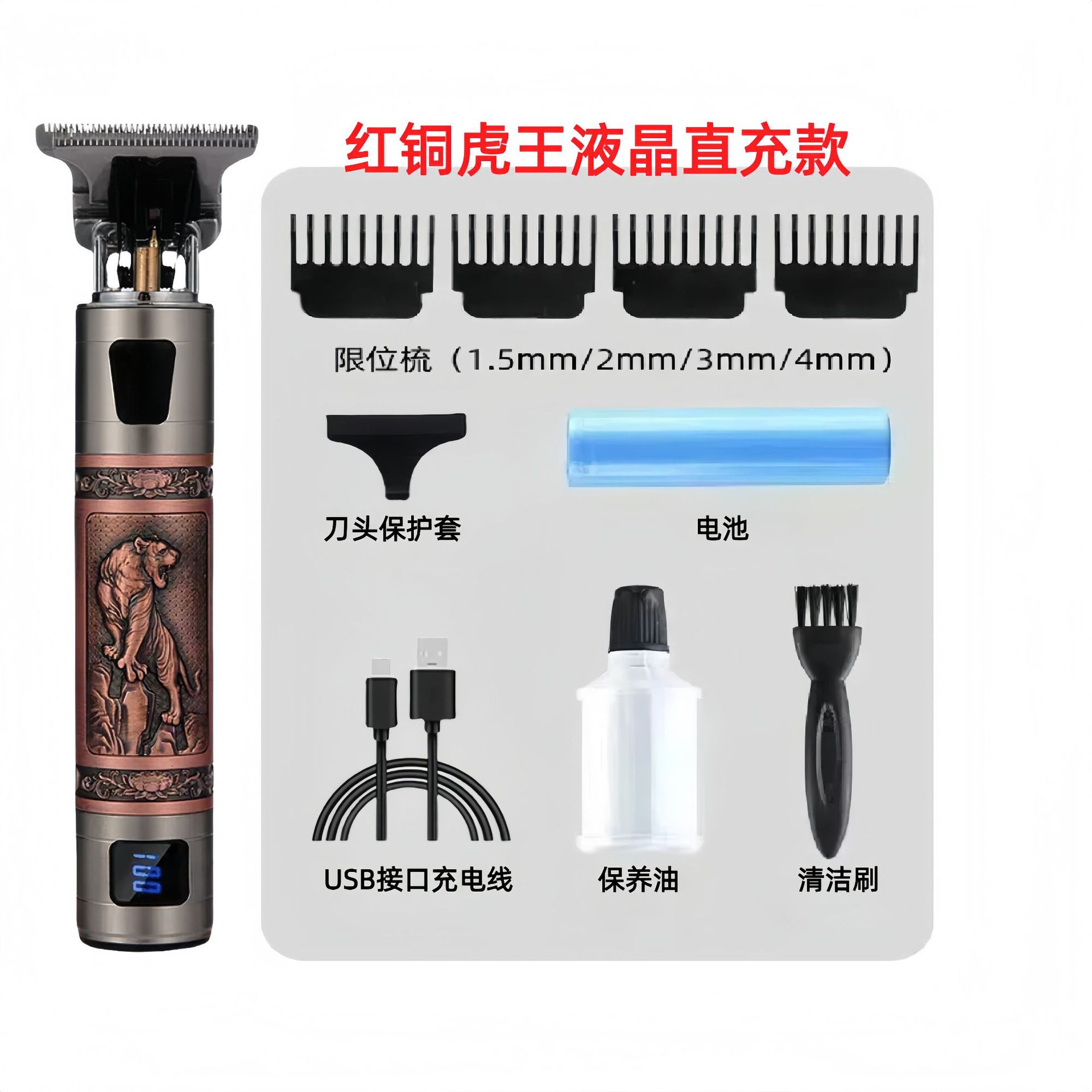 配件:电推主机.润滑油.毛刷.说明书.USB充电线.4个限位尺.彩盒