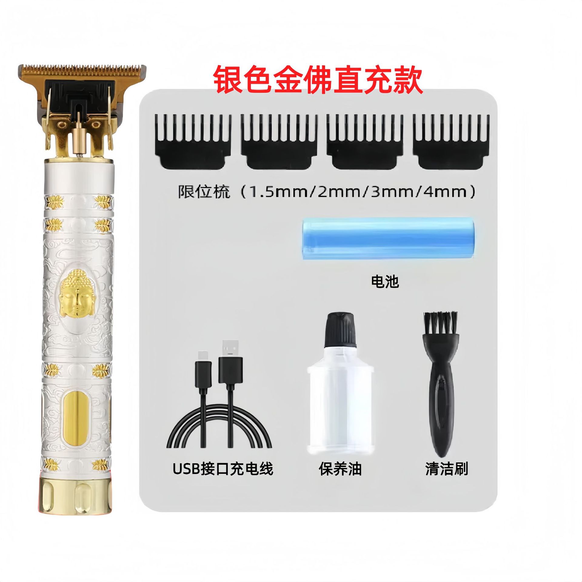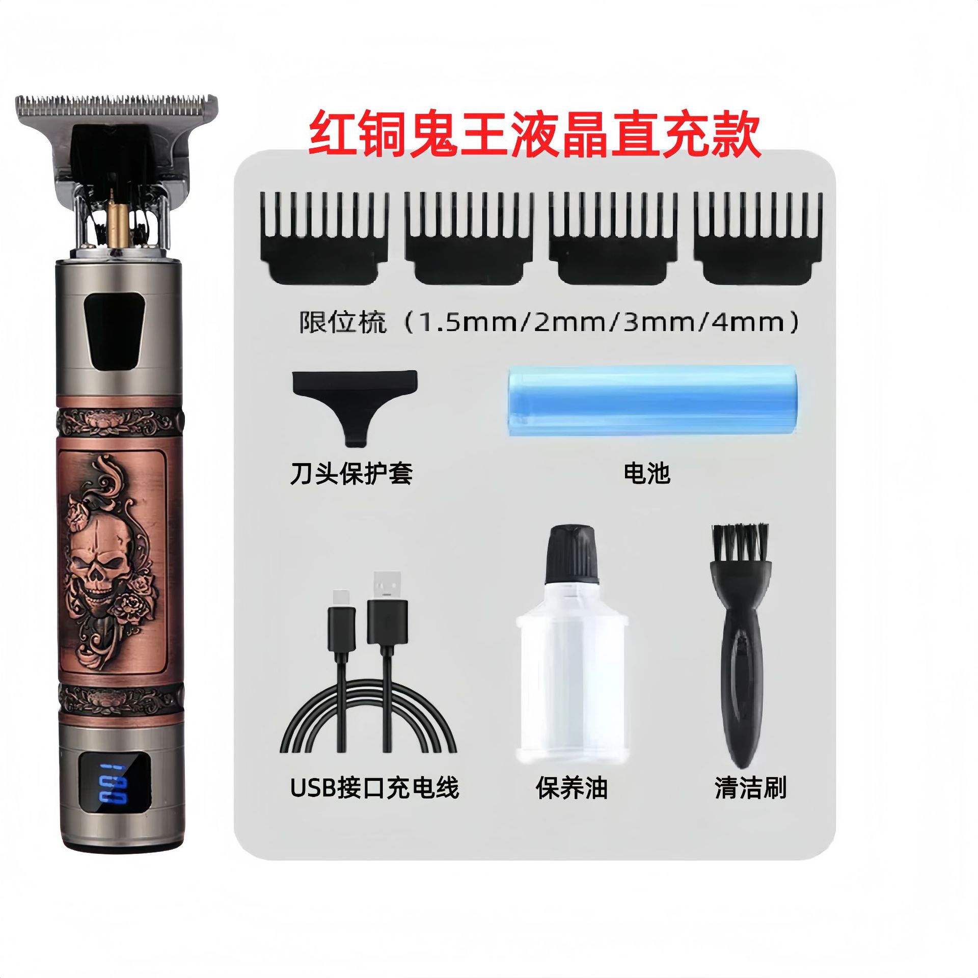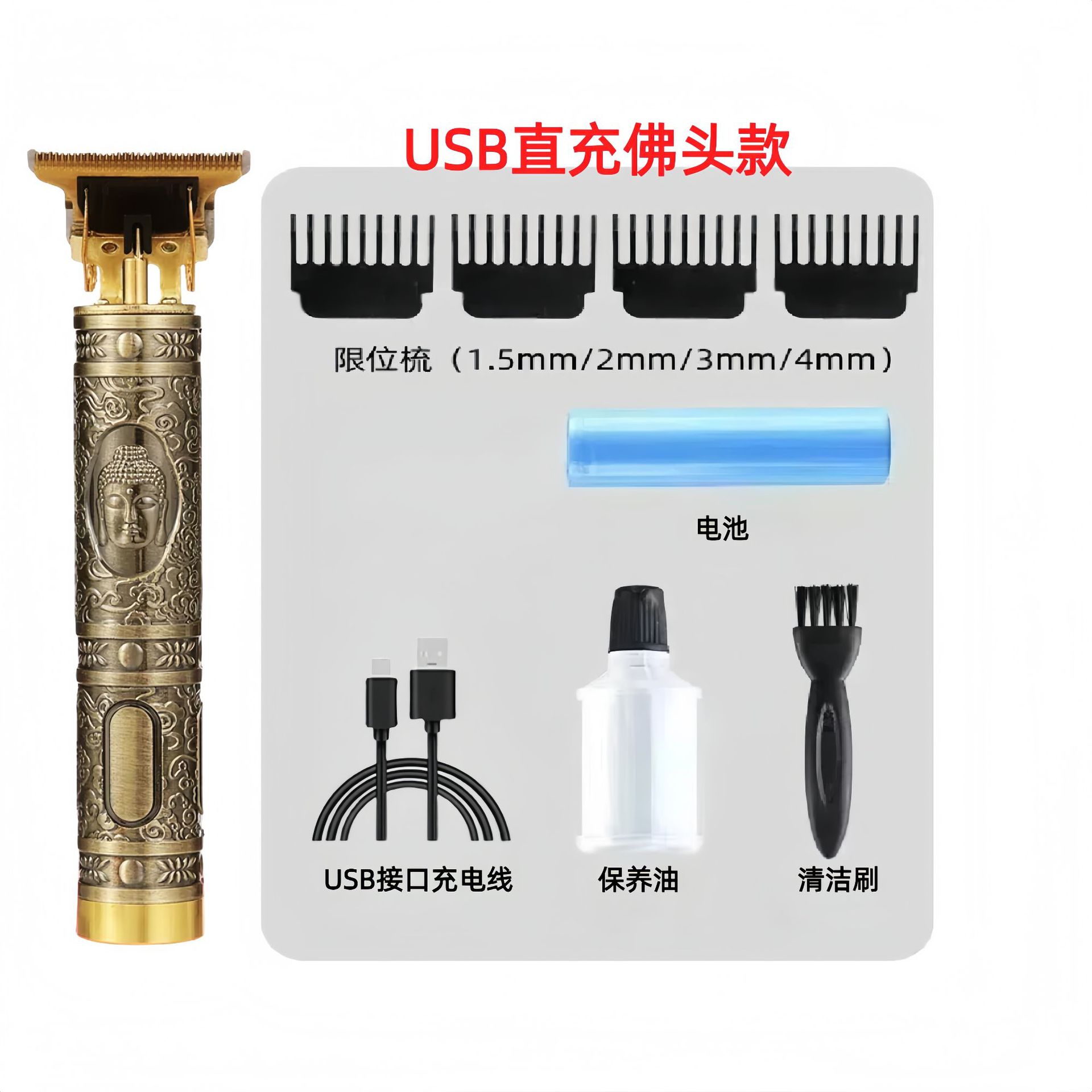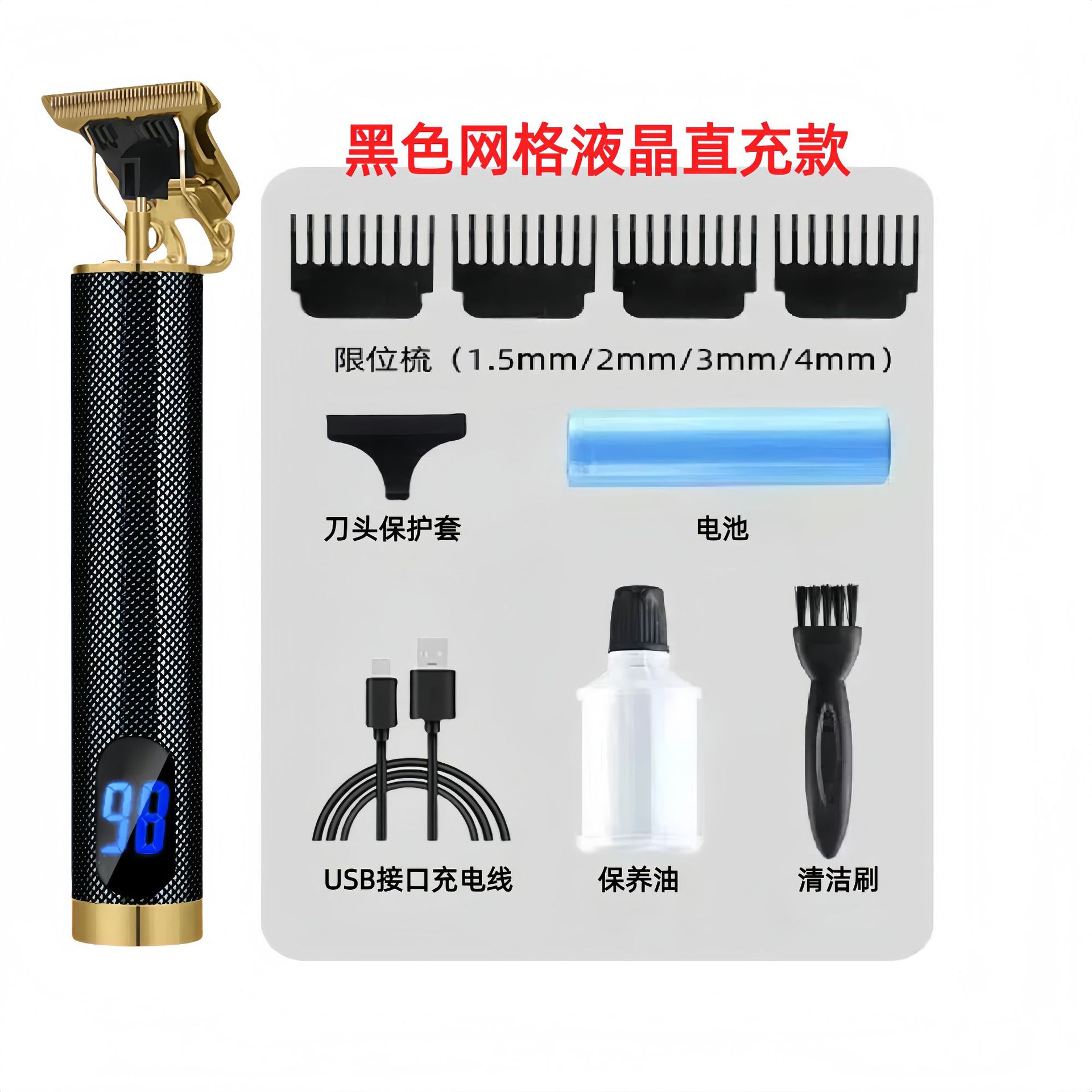 配件:电推主机.润滑油.毛刷.说明书.USB充电线.4个限位尺.彩盒
