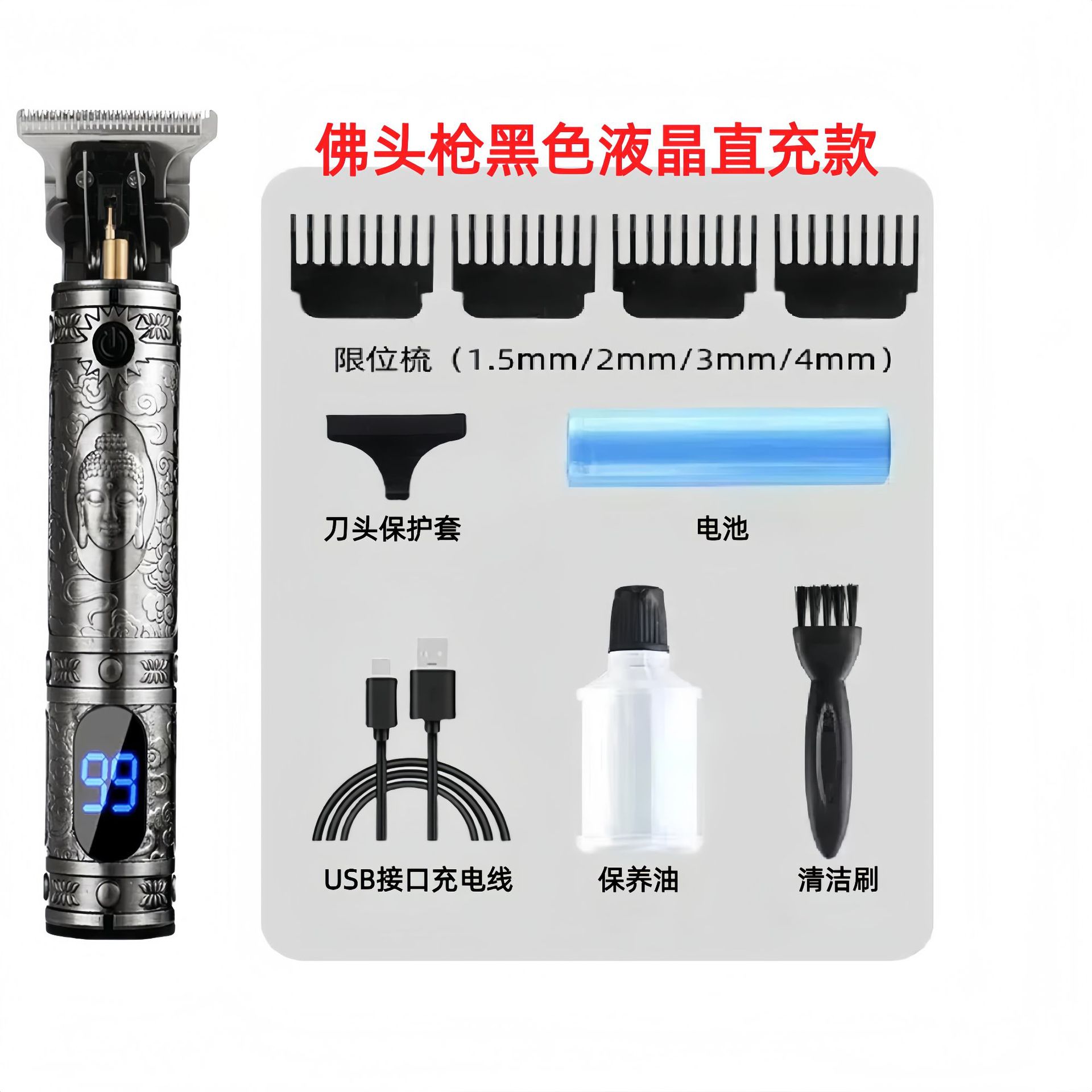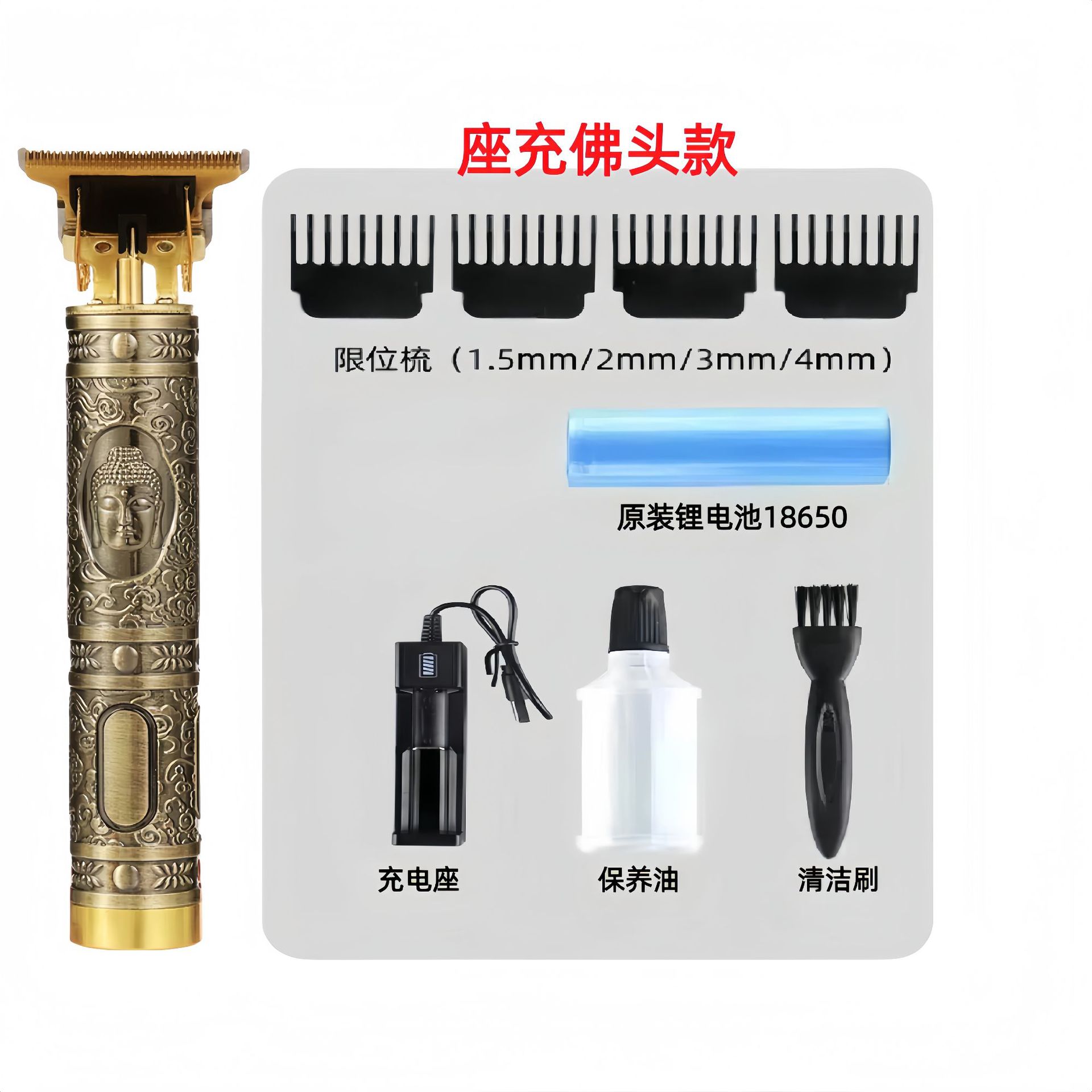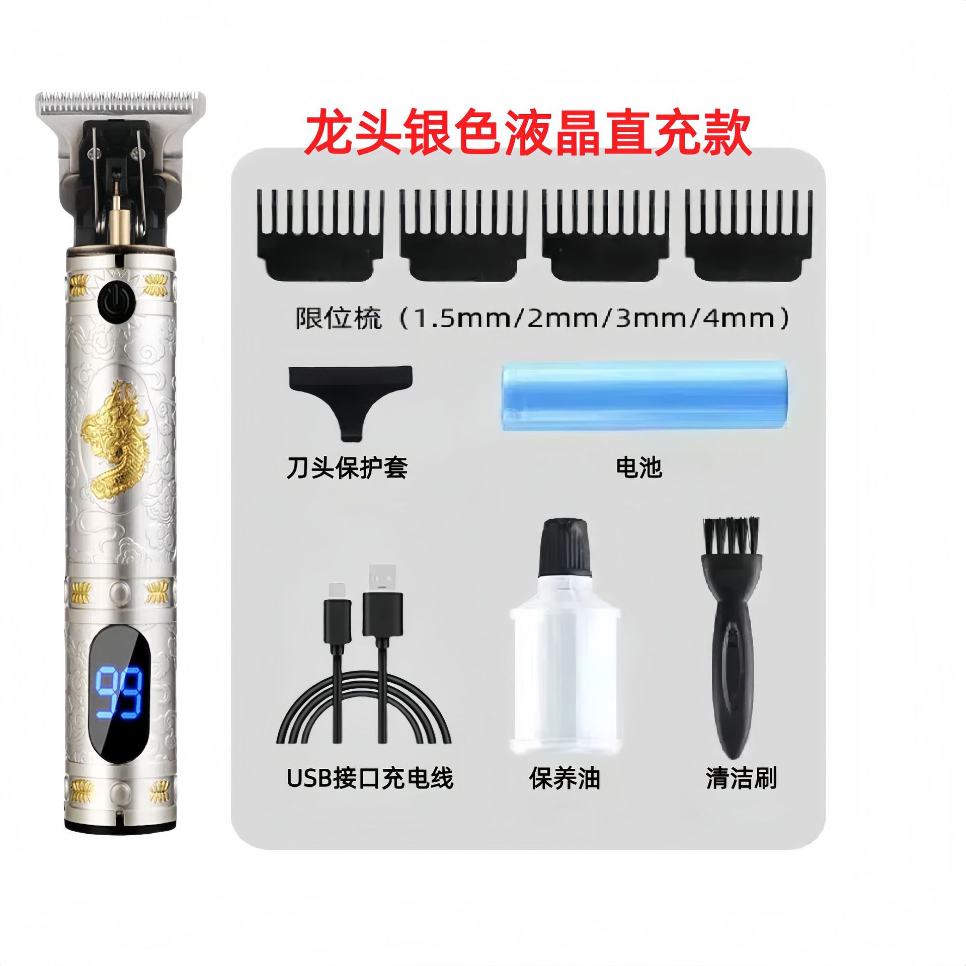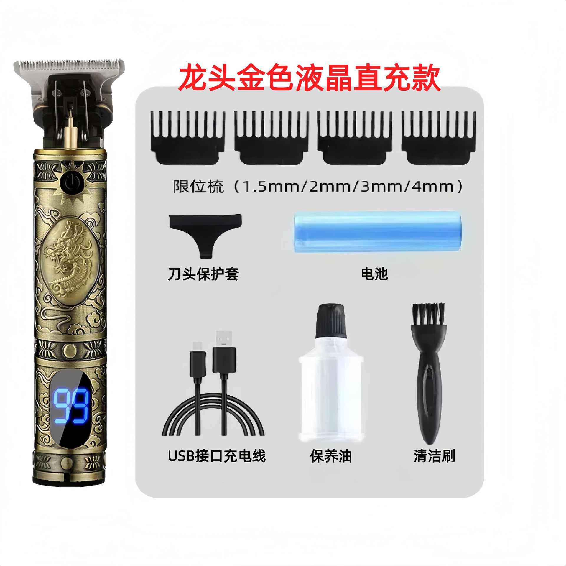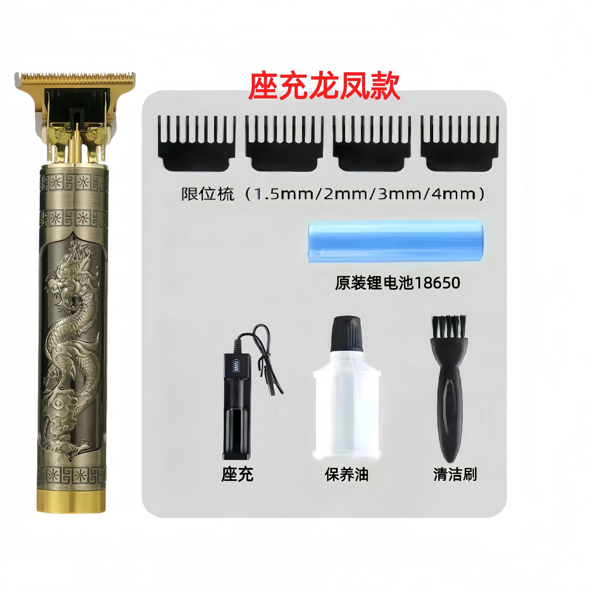 配件:电推主机.润滑油.毛刷.说明书.USB充电线.4个限位尺.彩盒