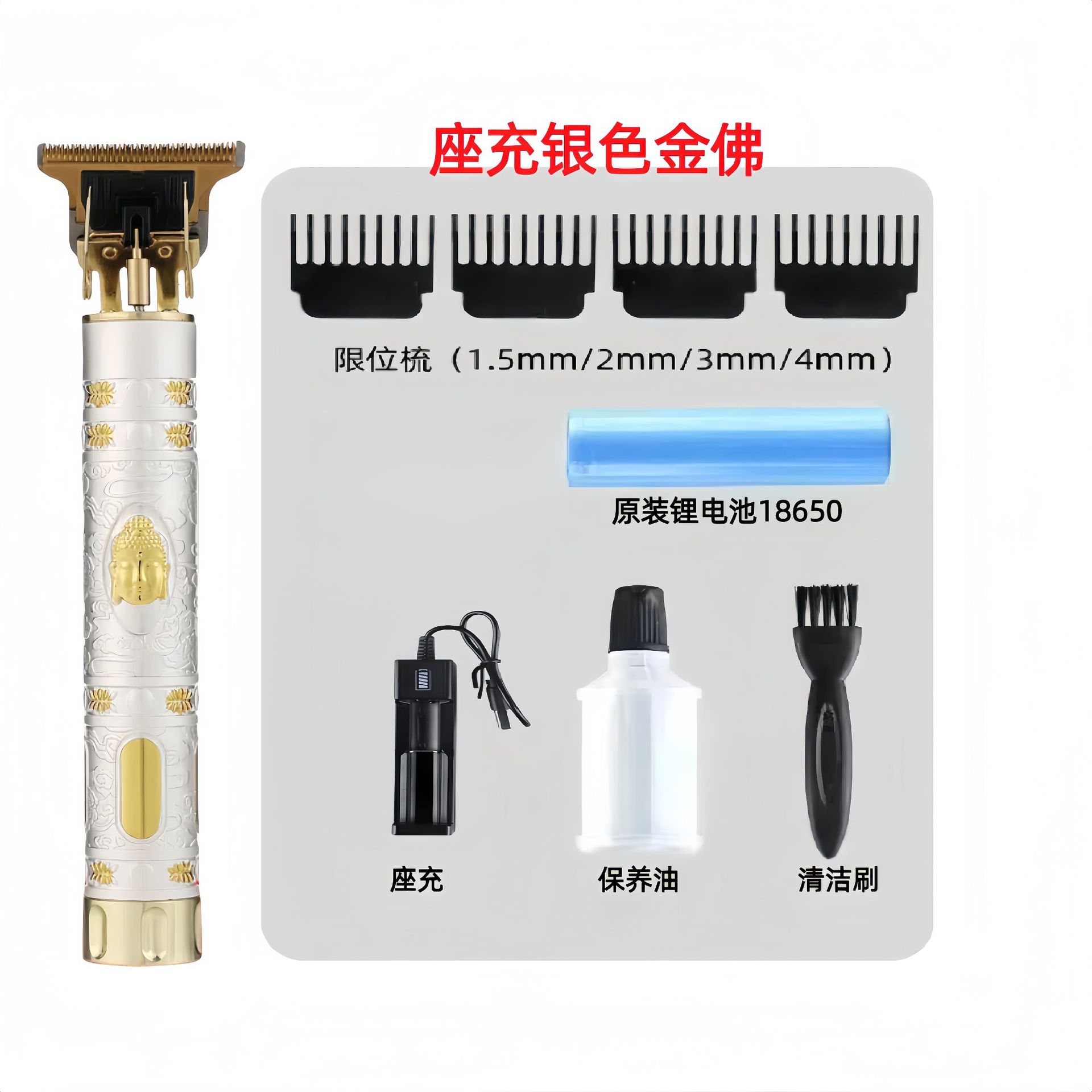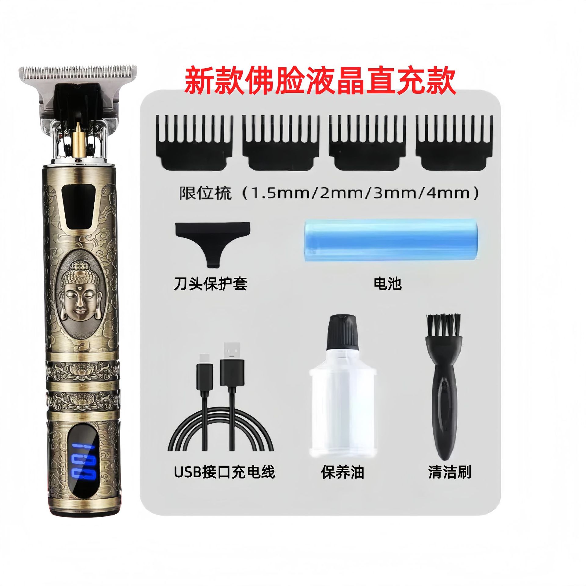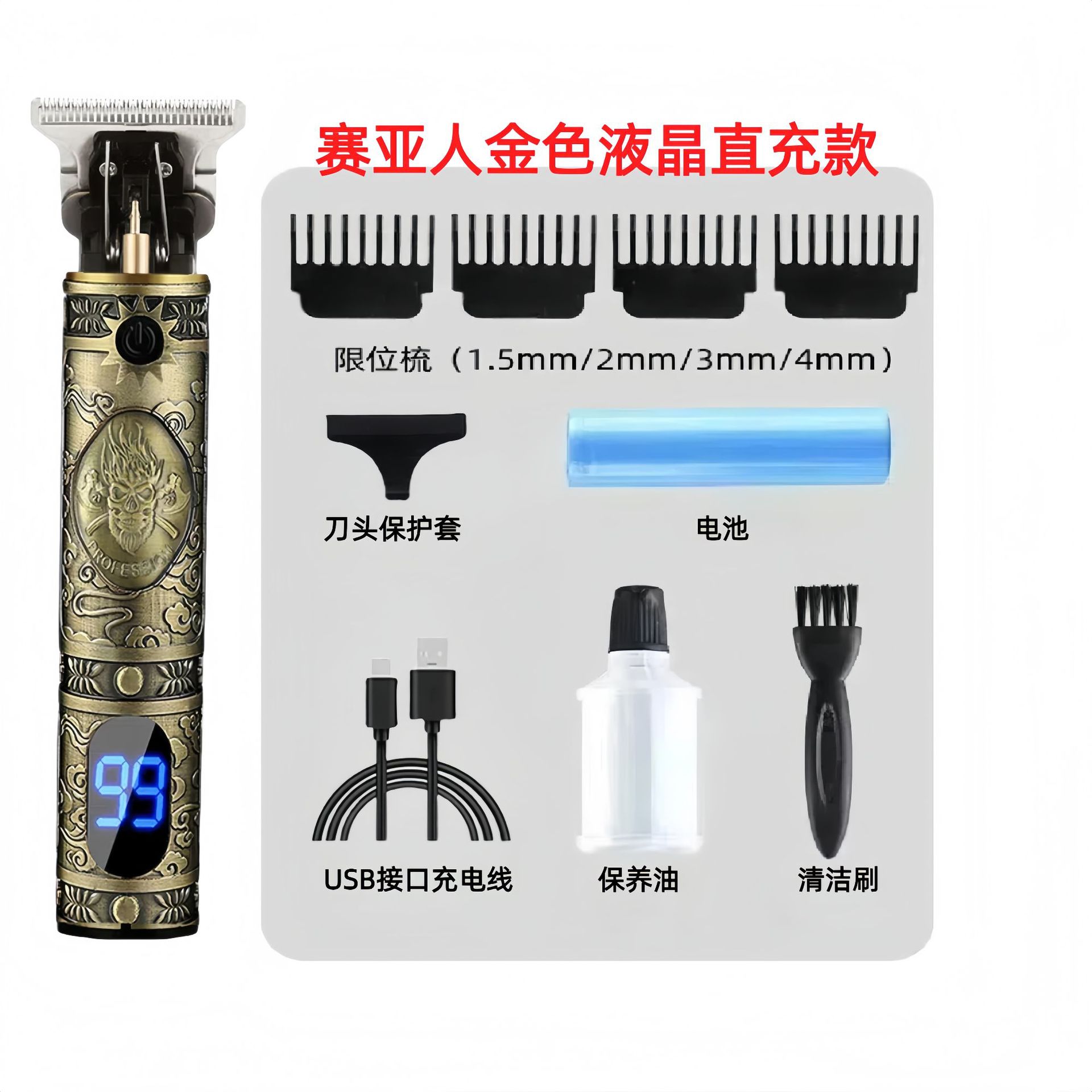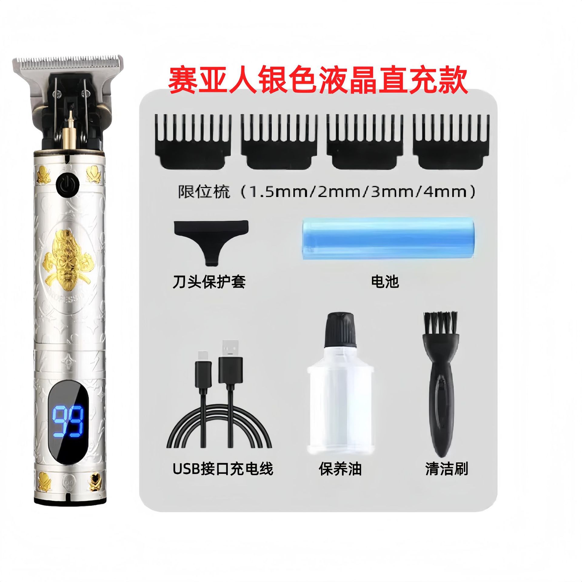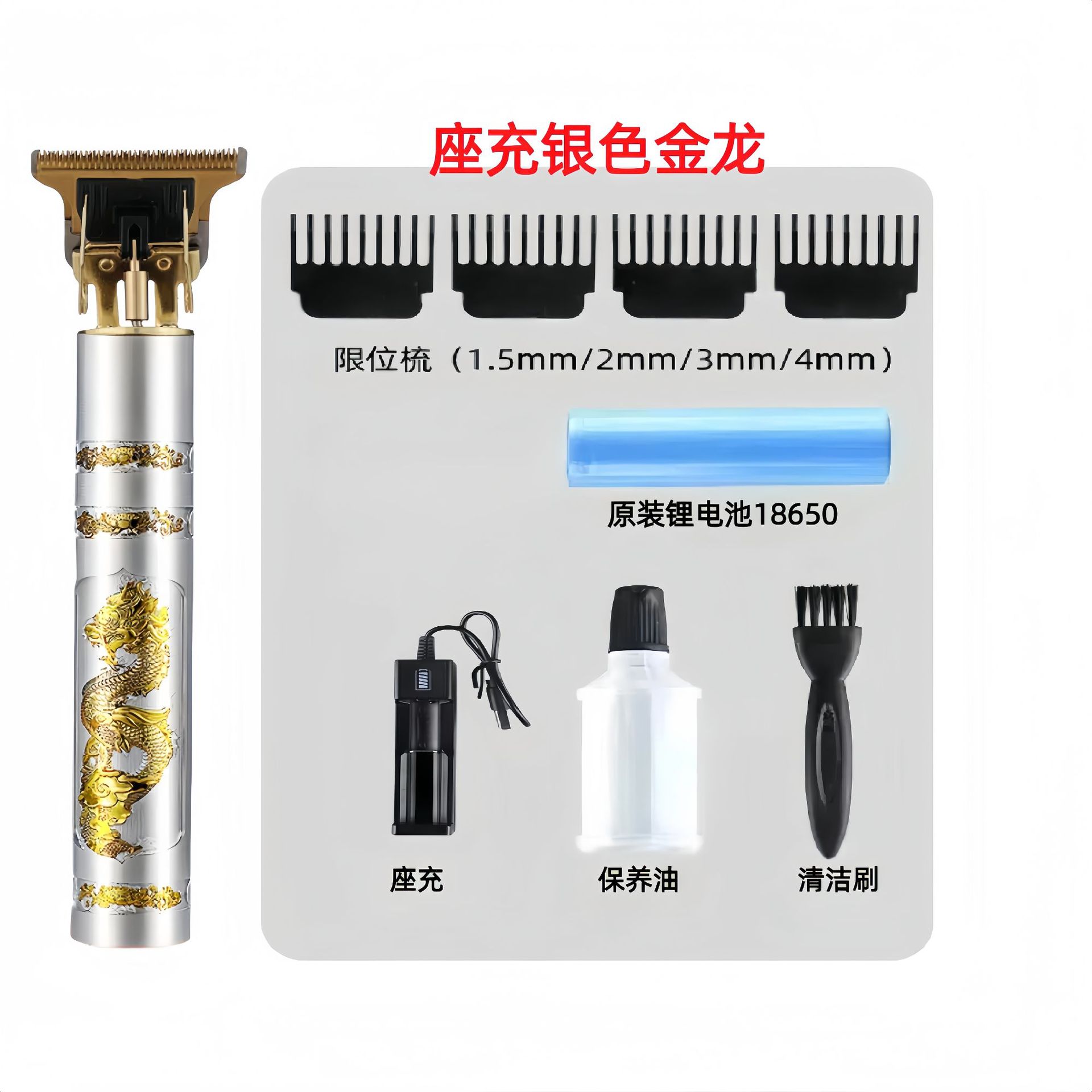 配件:电推主机.润滑油.毛刷.说明书.USB充电线.4个限位尺.彩盒
