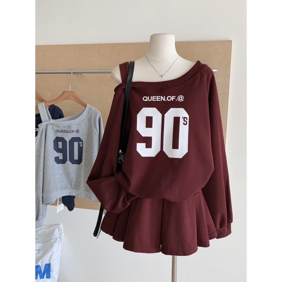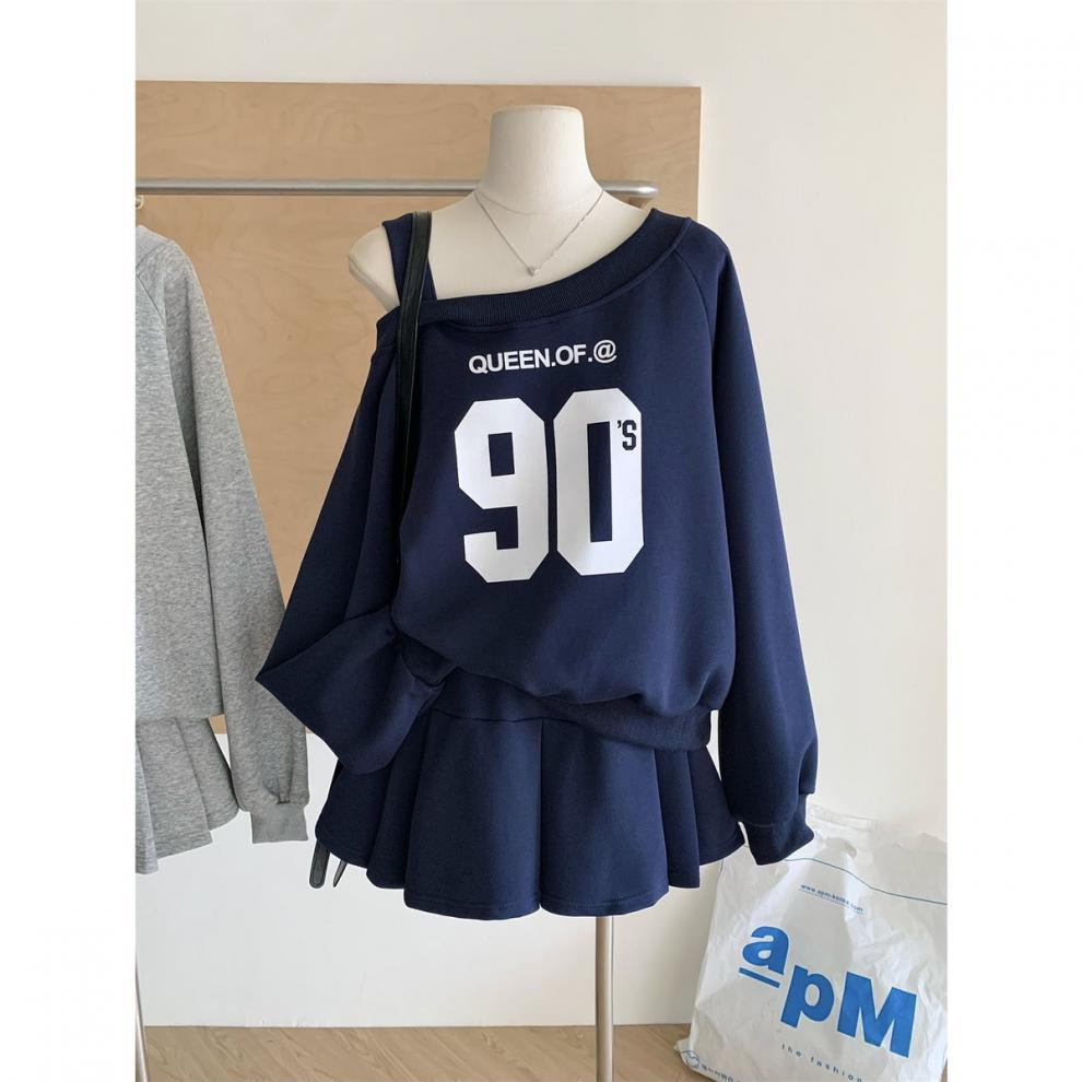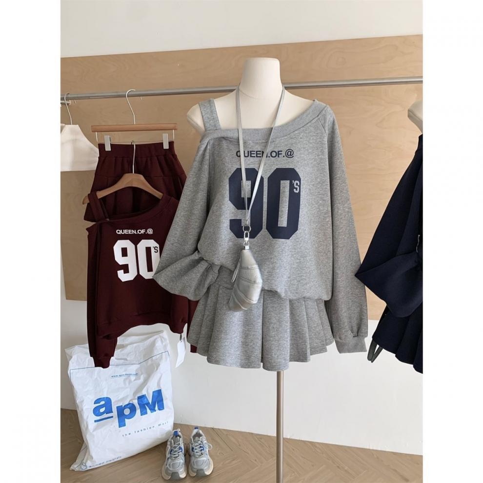 미국 스타일의 새로운 한국 스타일 디자인 센스 경사 어깨 인쇄 최고 연령 감소 원피스 여성 올 매치 화이트 슬림 주름 치마