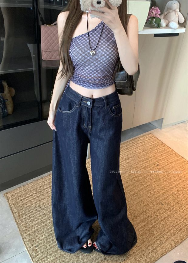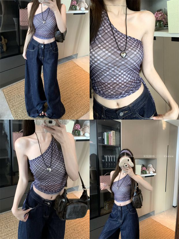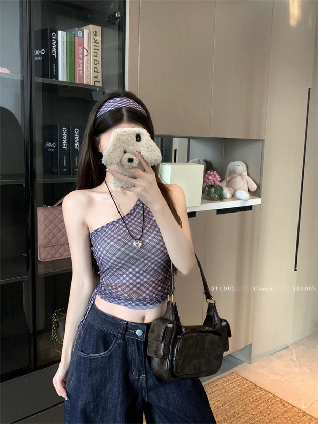 우아한 틈새 격자 무늬 민소매 카미 솔 여성의 봄 2025 새로운 도착 슬림 핏 슬림 한 어깨 스파이스 소녀 레트로 탑 트렌디스토어 가기