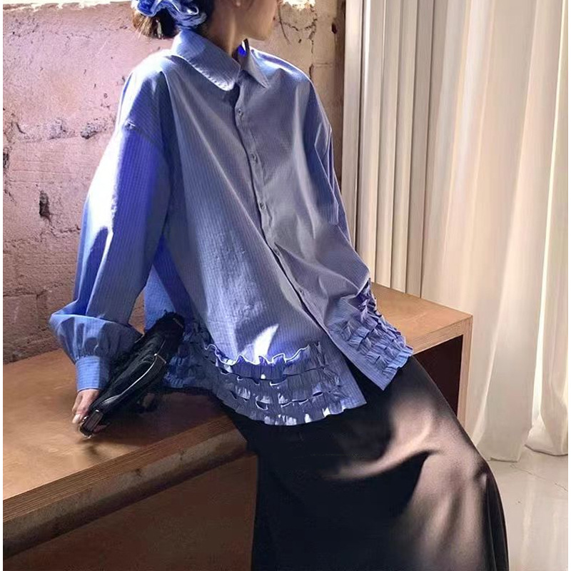 여성을위한 간단한 우아한 파란색 셔츠 여성 디자인 센스 틈새 인형 칼라 느슨한 긴팔 캐주얼 탑스토어 가기