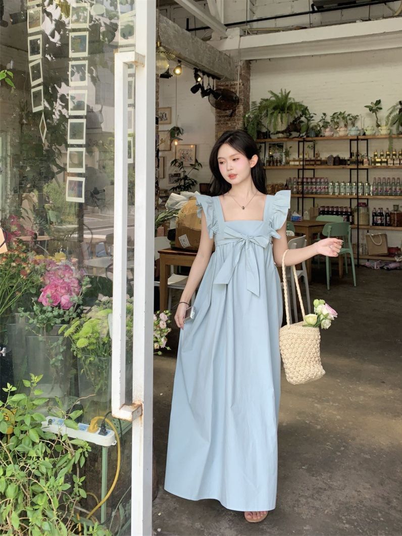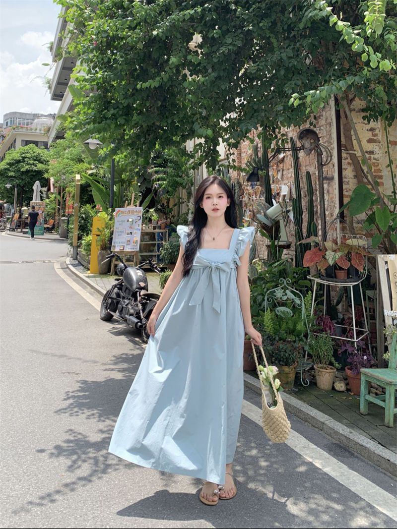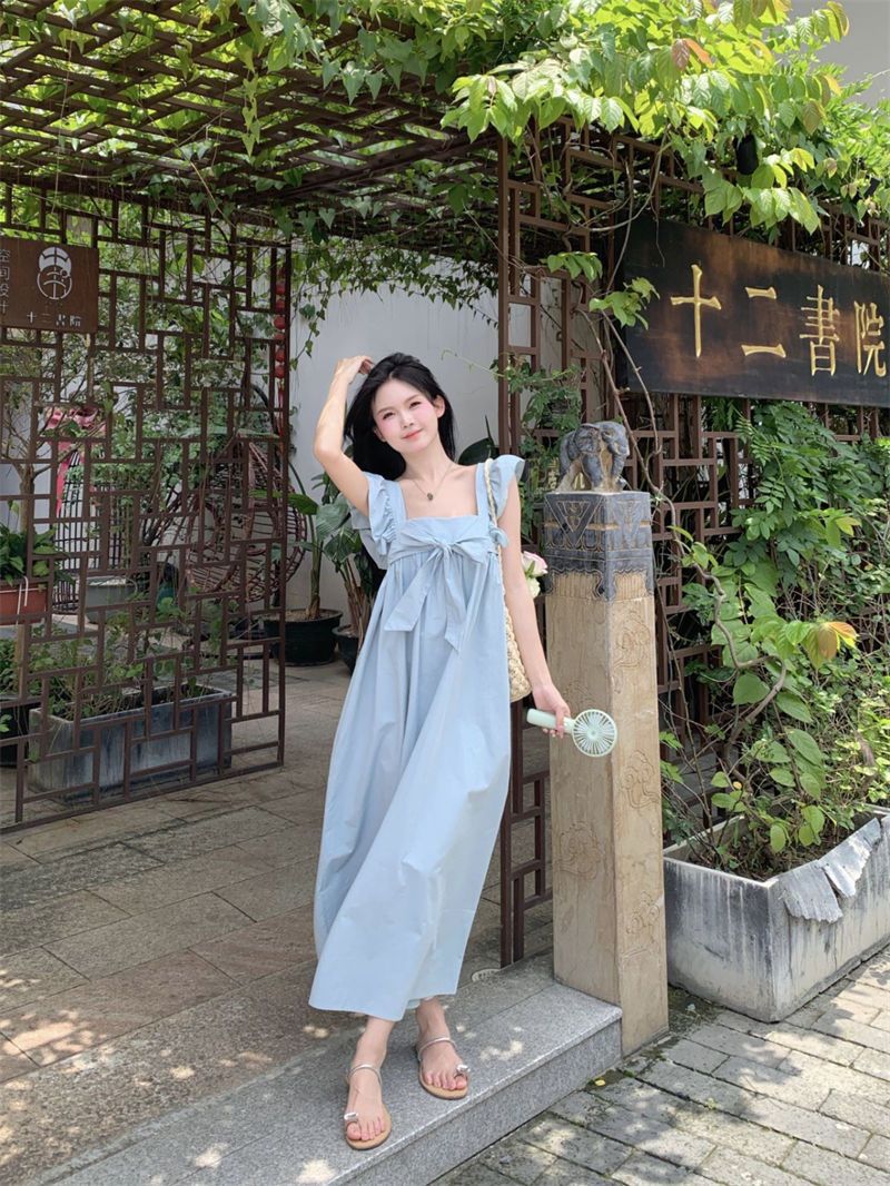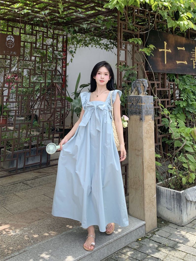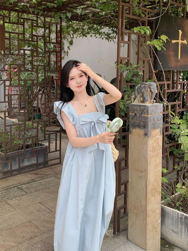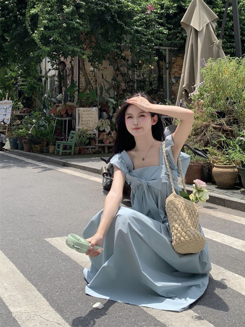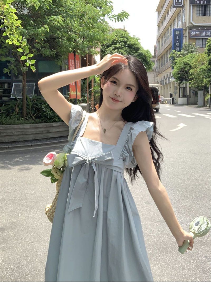 부드러운 스타일 넥타이 활 원피스 여성 여름 달콤한 작은 비행 소매 우아한 타이트 허리 슬리밍 A-라인 긴 스커트스토어 가기