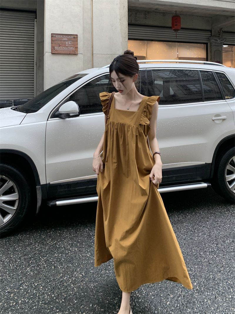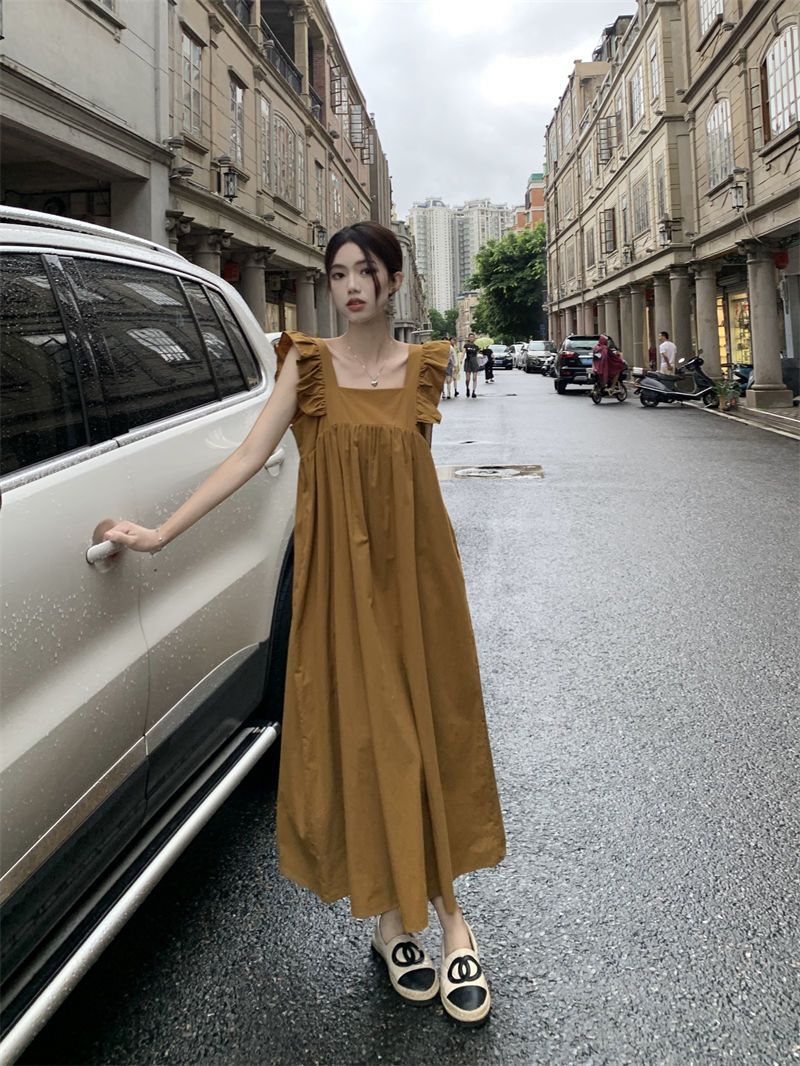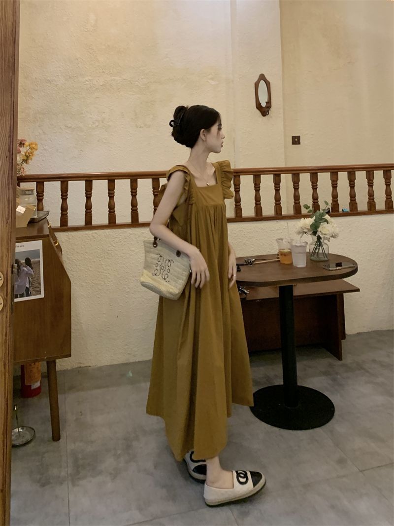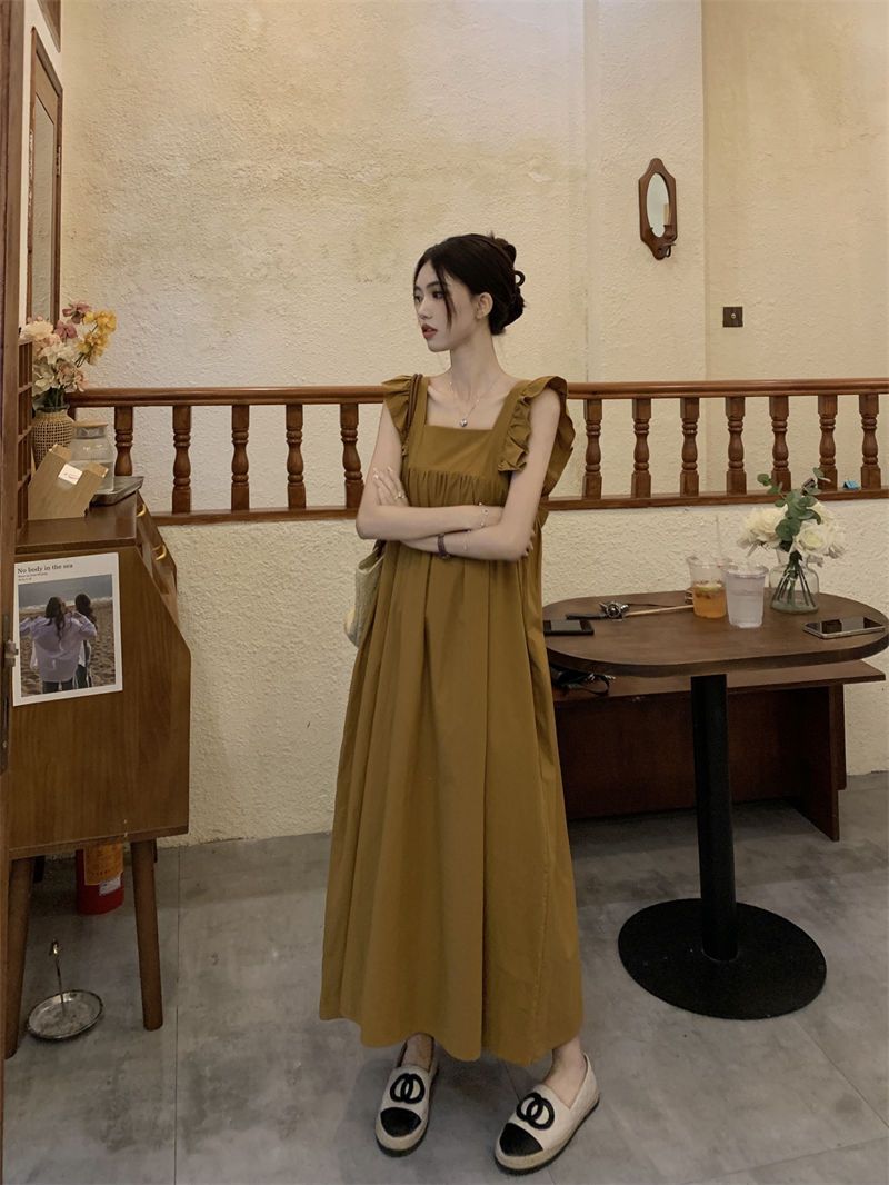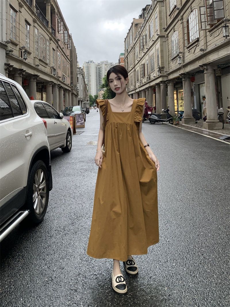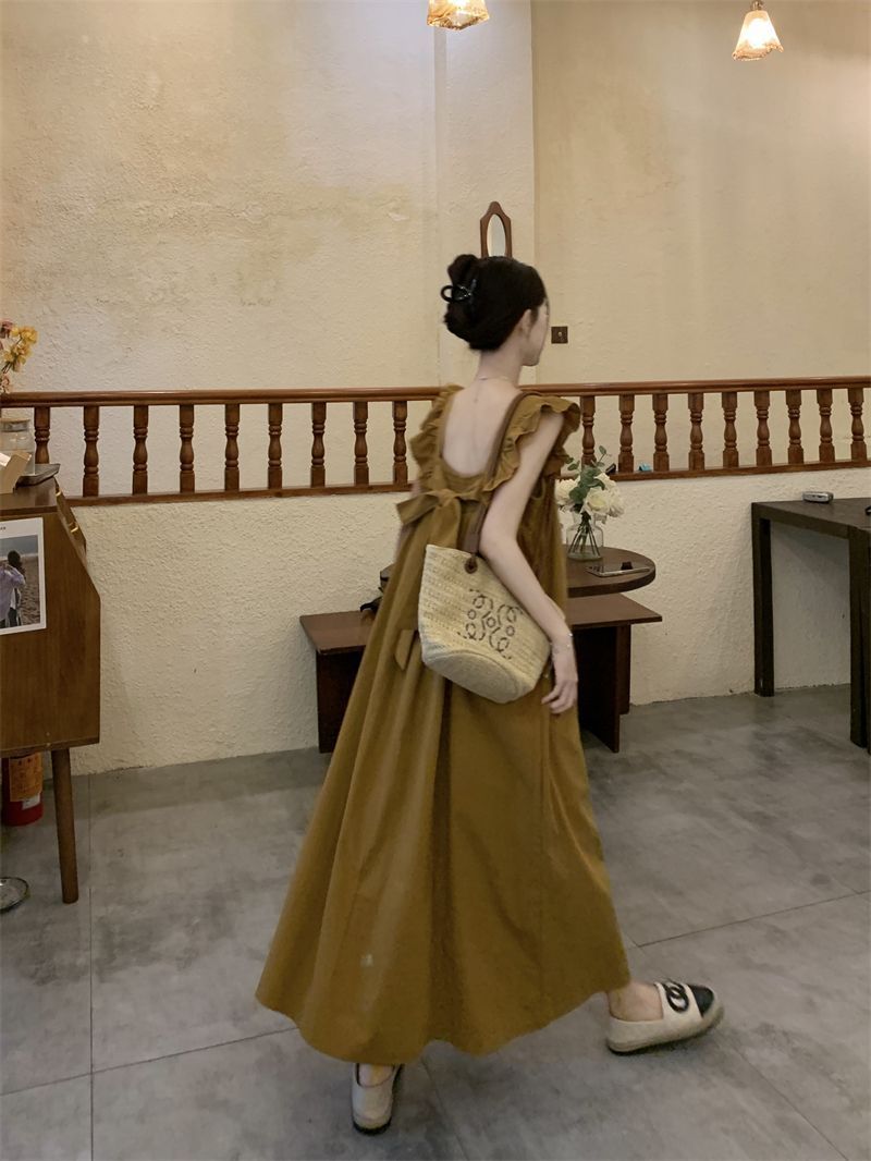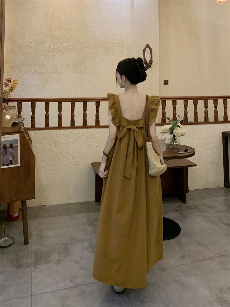 부드러운 스타일 넥타이 활 원피스 여성 여름 달콤한 작은 비행 소매 우아한 타이트 허리 슬리밍 A-라인 긴 스커트스토어 가기