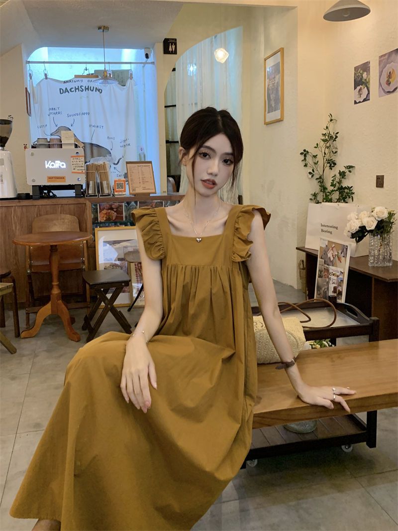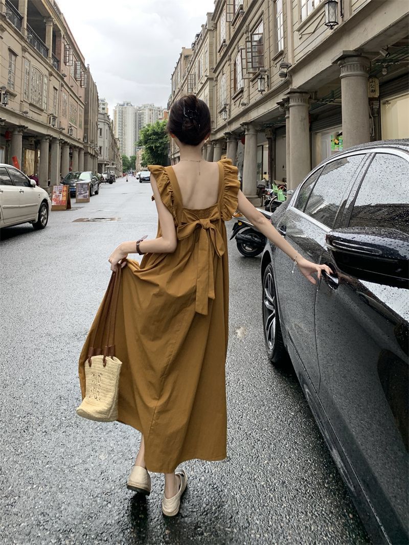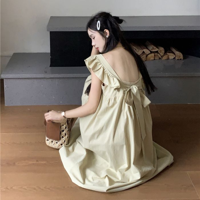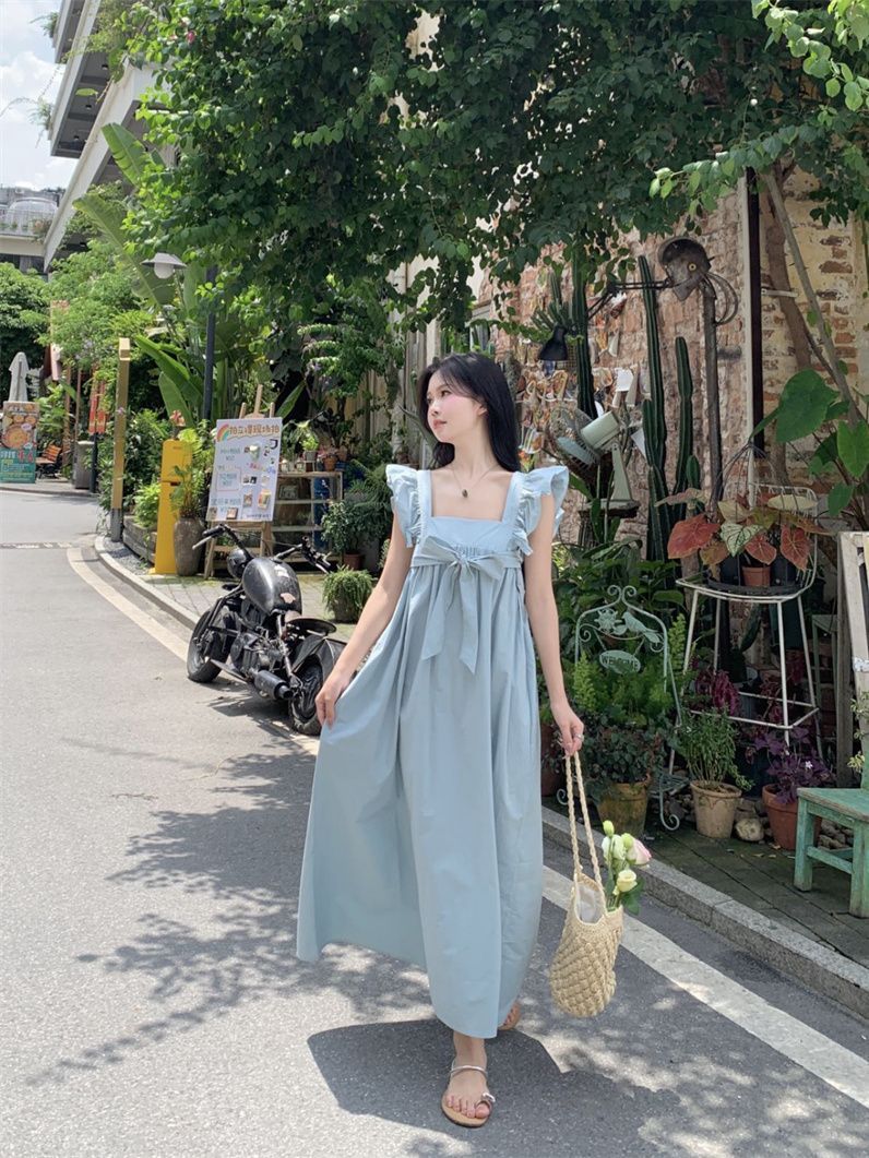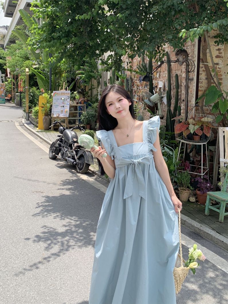 부드러운 스타일 넥타이 활 원피스 여성 여름 달콤한 작은 비행 소매 우아한 타이트 허리 슬리밍 A-라인 긴 스커트