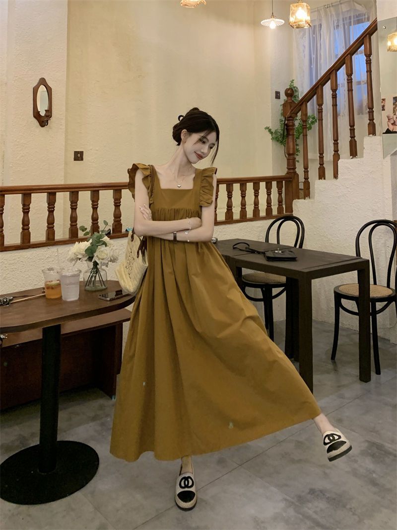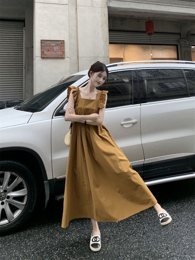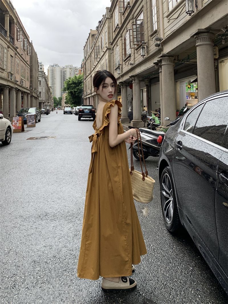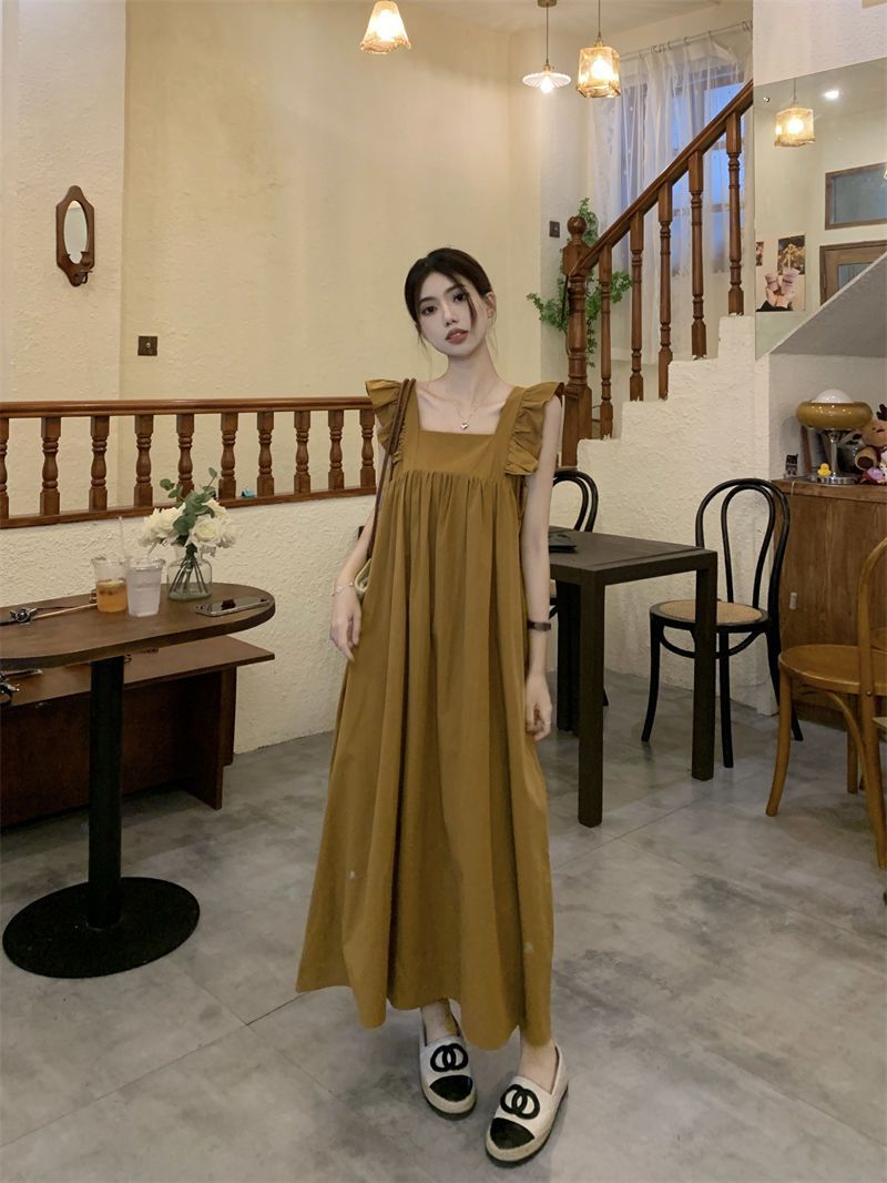 부드러운 스타일 넥타이 활 원피스 여성 여름 달콤한 작은 비행 소매 우아한 타이트 허리 슬리밍 A-라인 긴 스커트